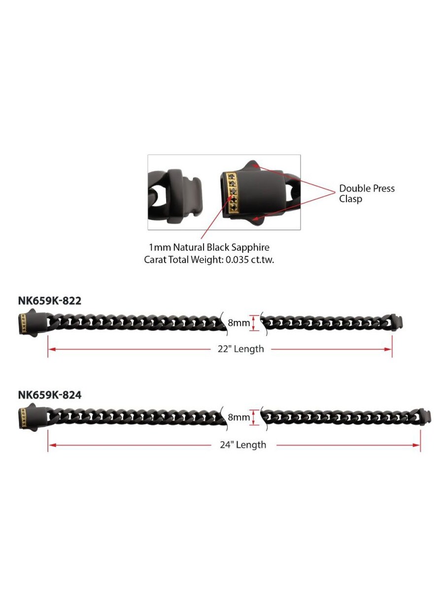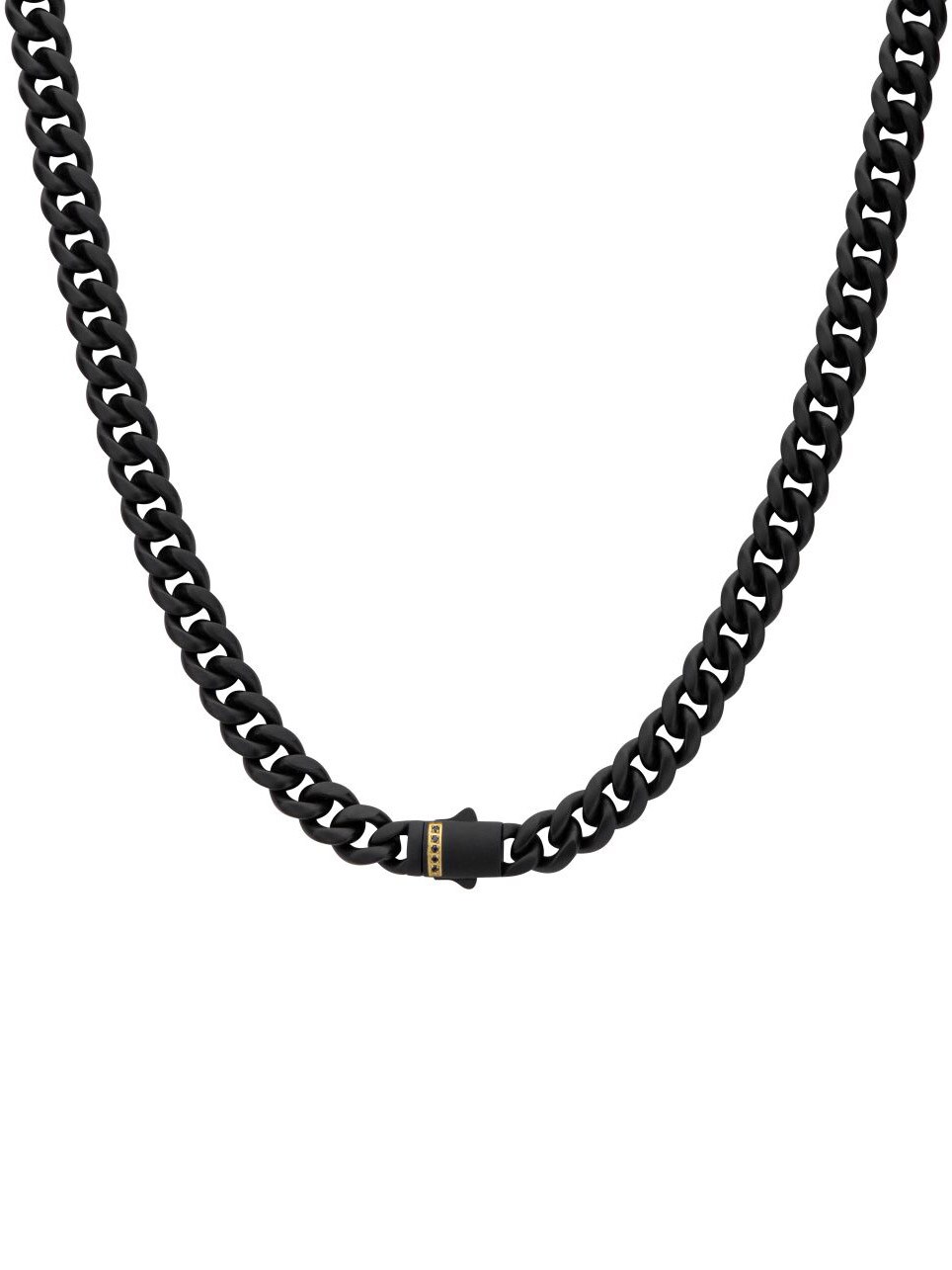 Cuban chain from Inox with black IP plating and matte finish. The clasp is adorned with black sapphire stones set in an exclusive 18K gold-plated double folding clasp that provides both security and a luxurious detail.