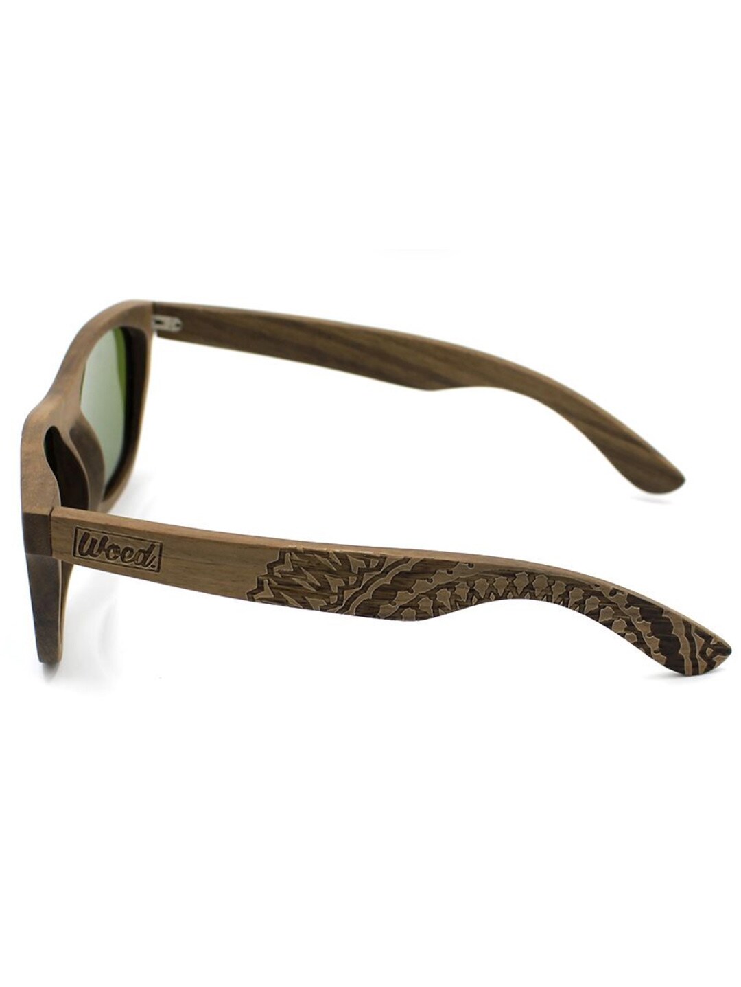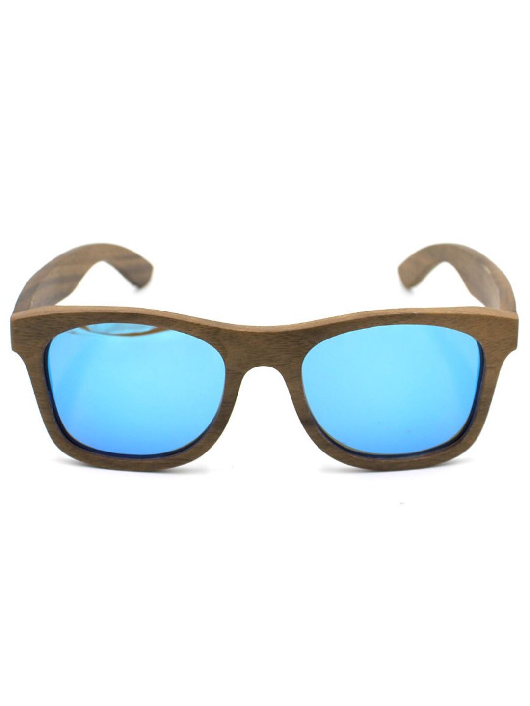 Unique sunglasses in walnut wood with blue lenses and patterned temples. Equipped with UV400 polarized lenses that protect against the sun and help reduce distracting glare. Delivered with a cleaning cloth and a practical storage pouch.