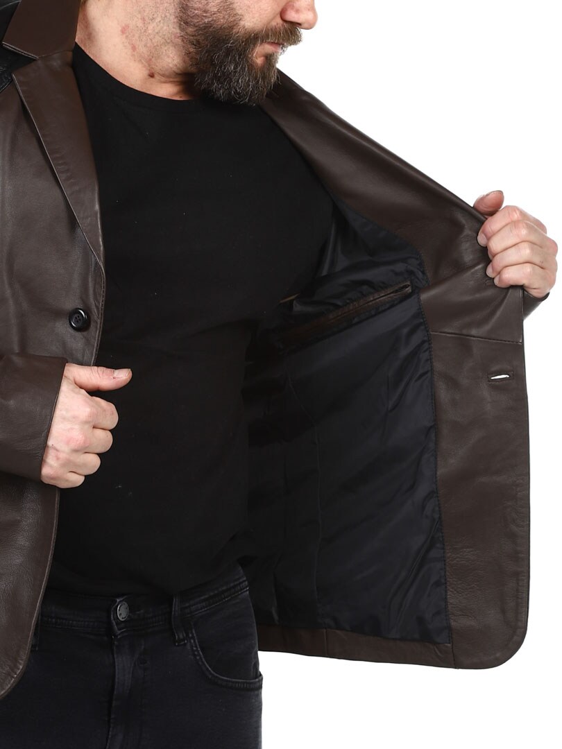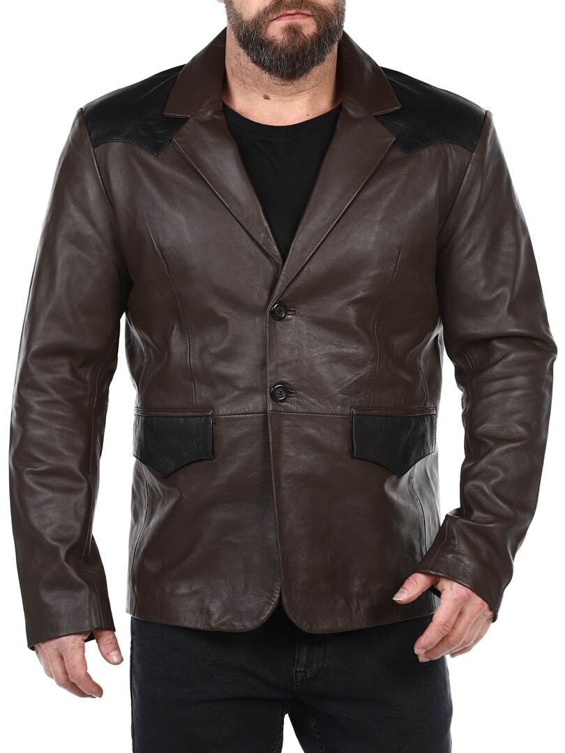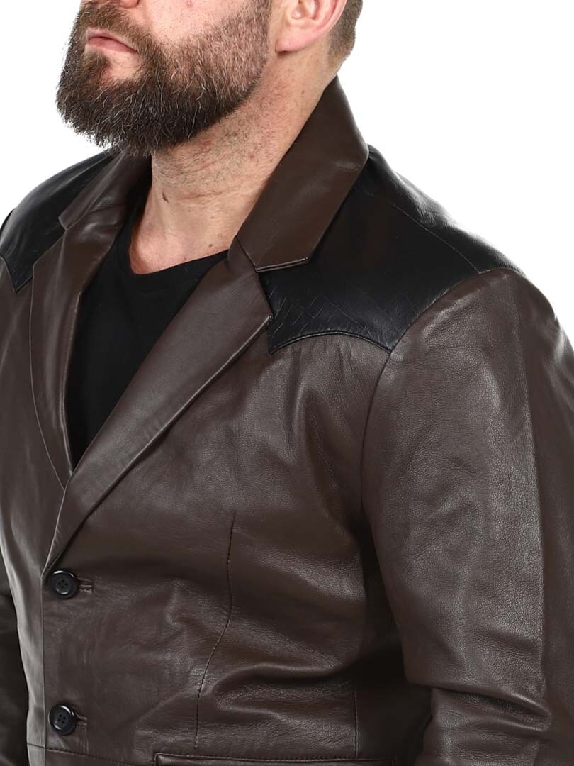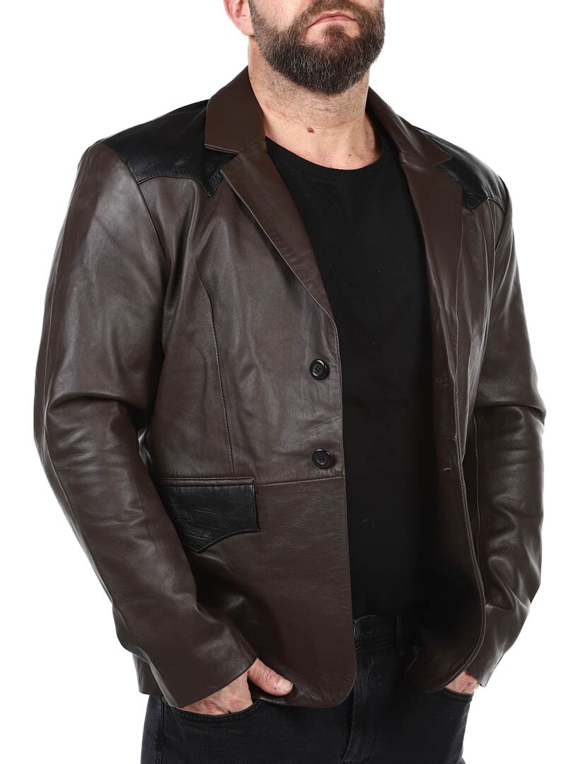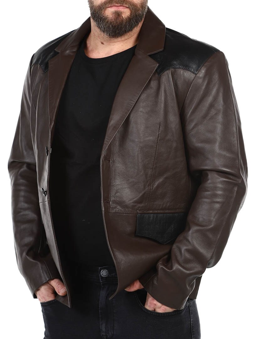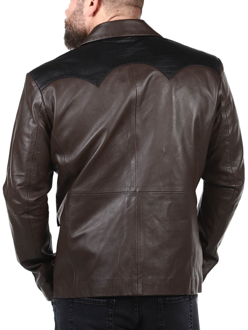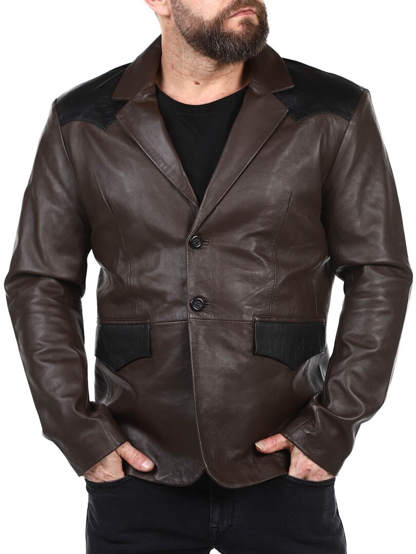 Brown blazer with shoulders and pocket flap in black reptile print. Single breasted model with collar and two front pockets and two inside pockets. This jacket is made of soft leather for best comfort and is only available at RockDenim!
