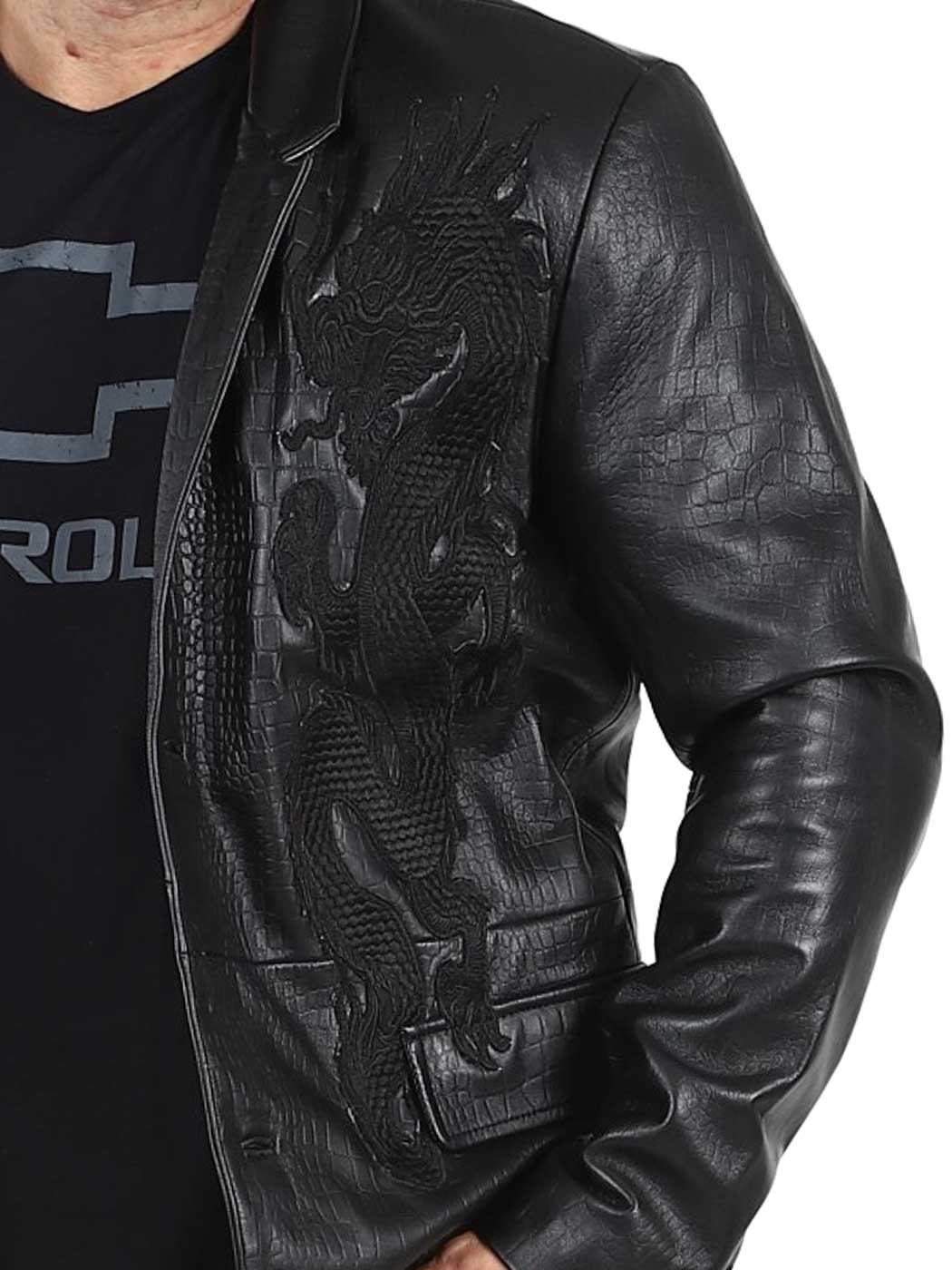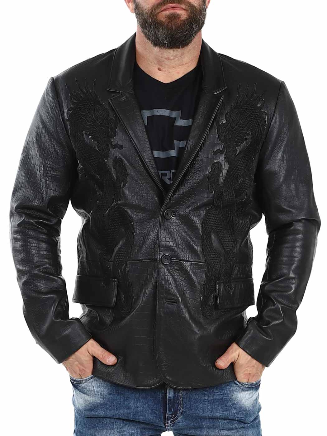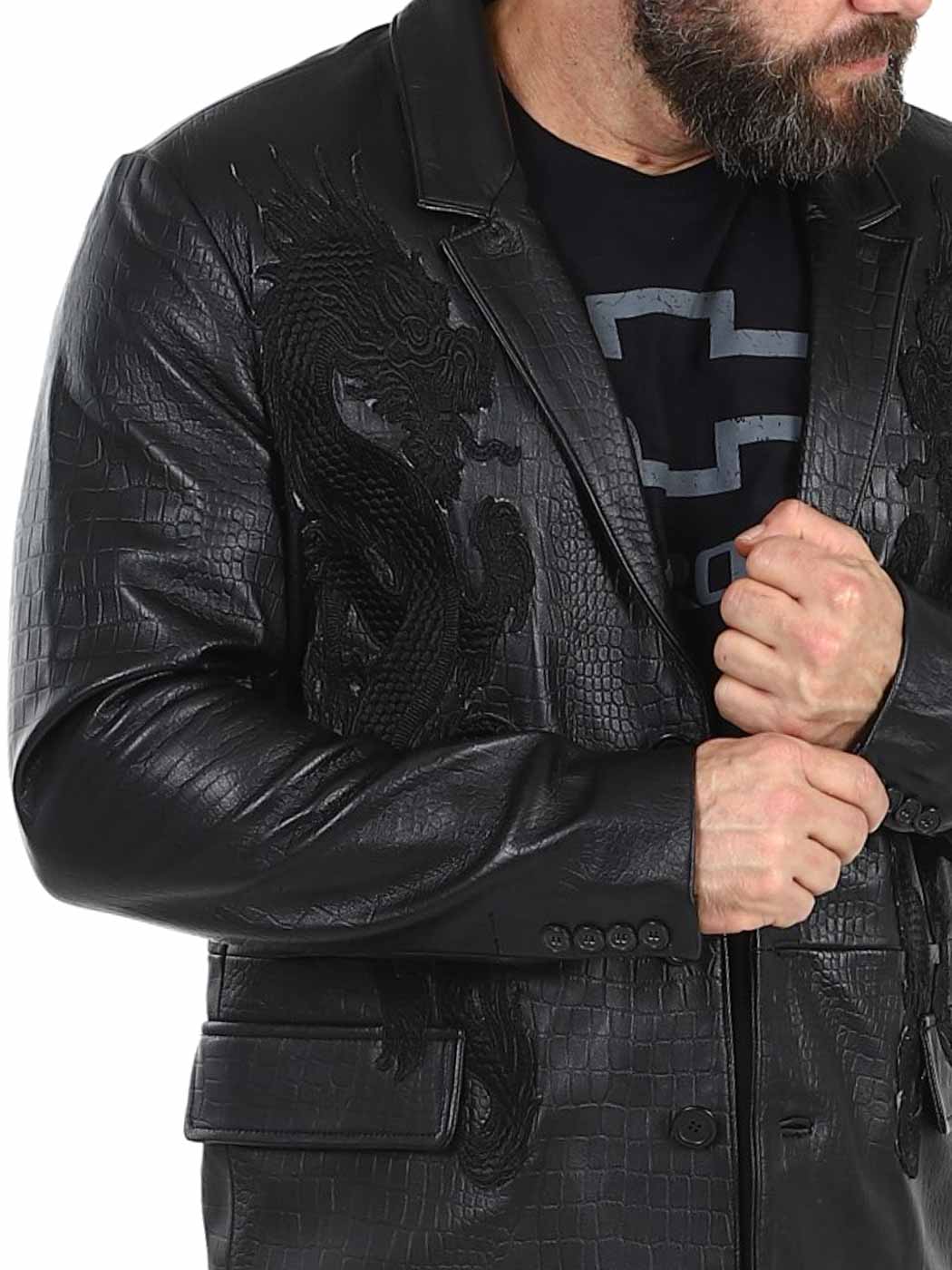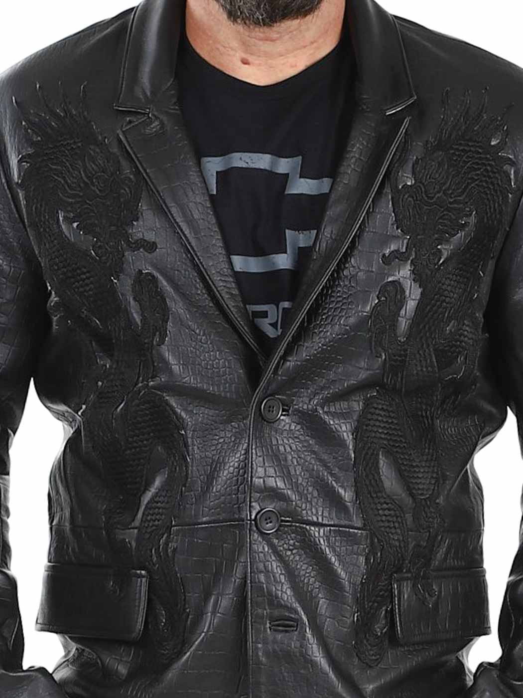 Style meets attitude in this exclusive blazer. Made of 100% genuine sheepskin with embossed reptile texture and tone-on-tone embroidered dragons on the front. Features two outer pockets, two inner pockets and button closure. Only available at Rockdenim!