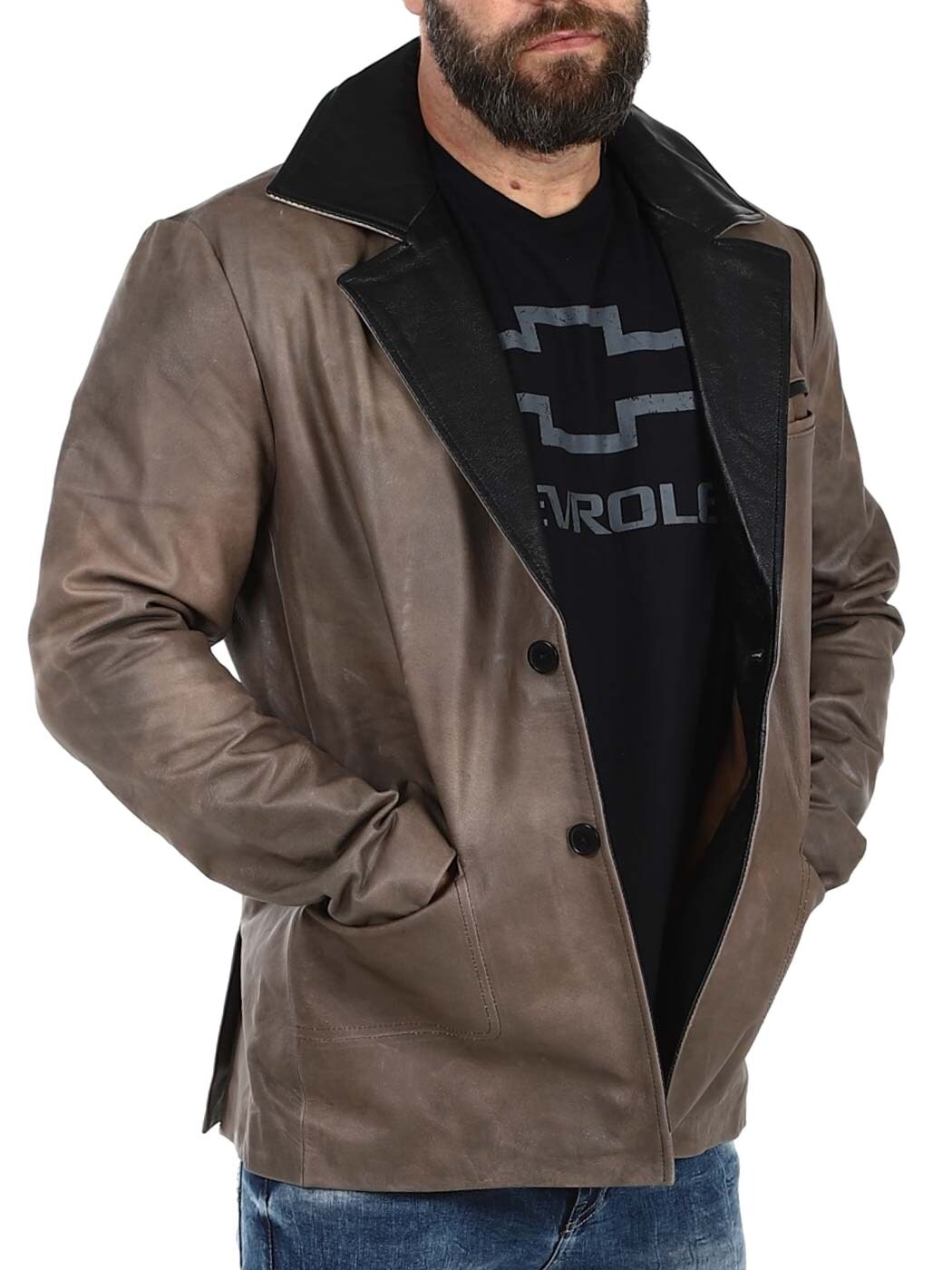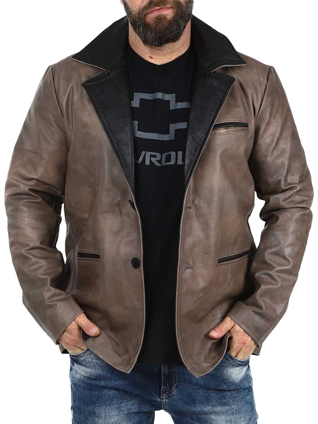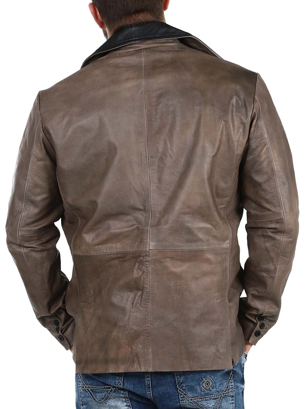 Brown blazer in durable leather with a vintage look and black contrast details. Single-breasted model with classic collar, three front pockets and two inner pockets. Available only at RockDenim!