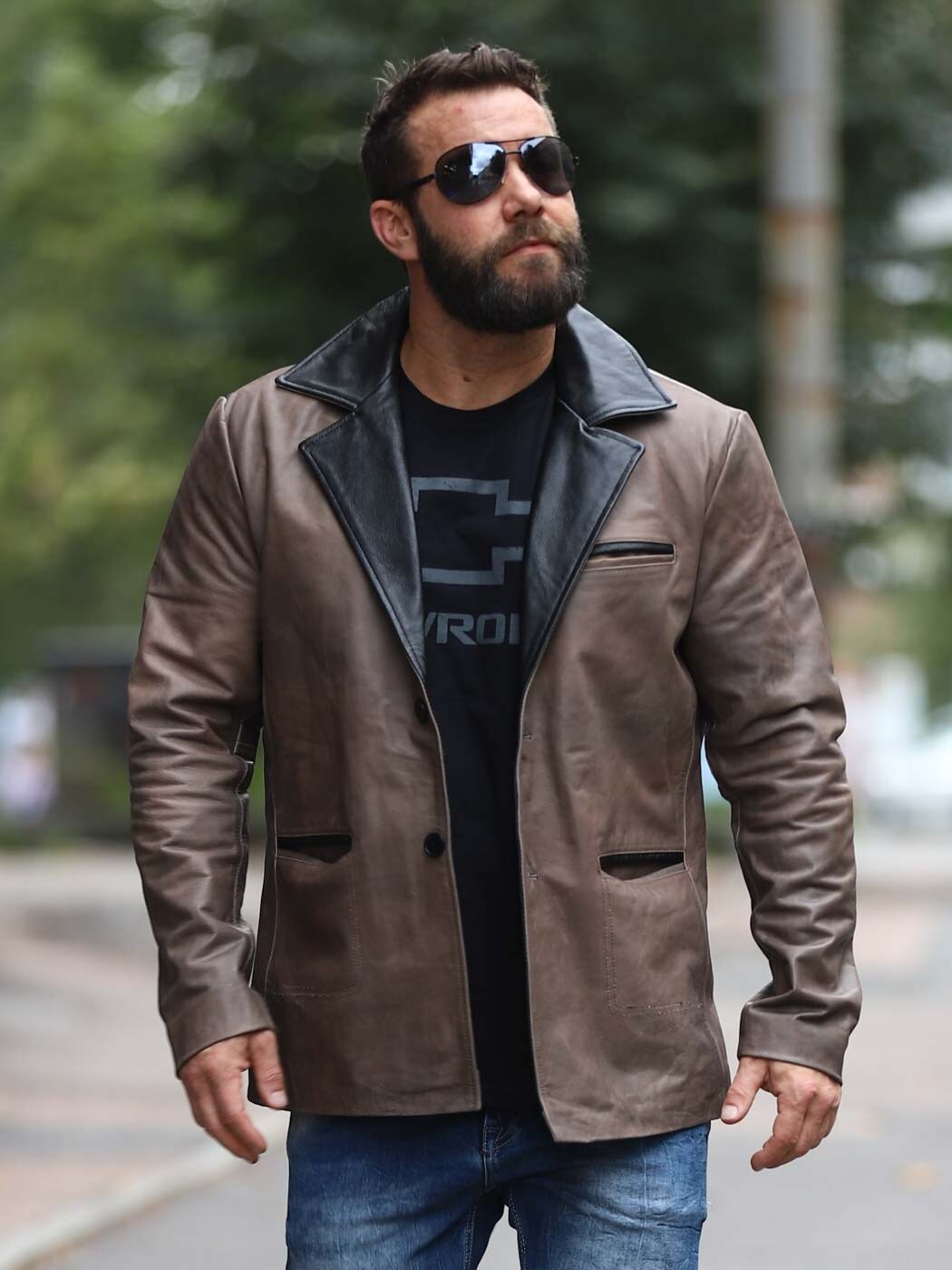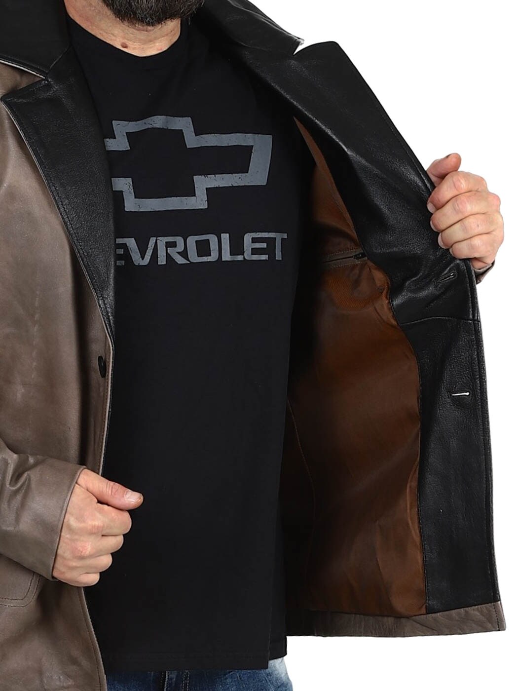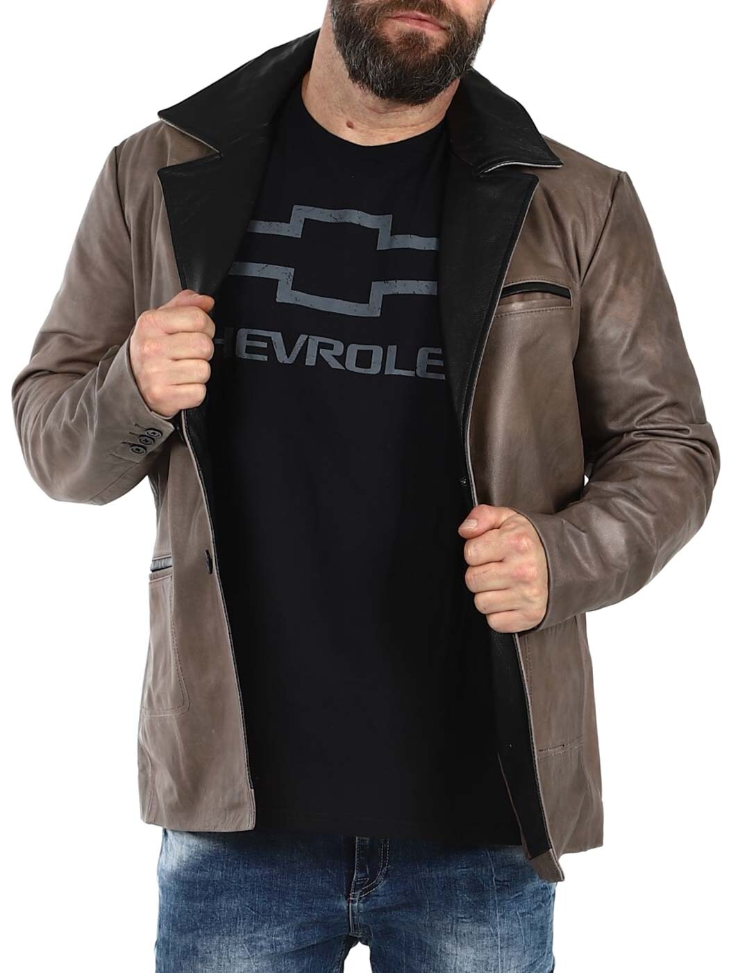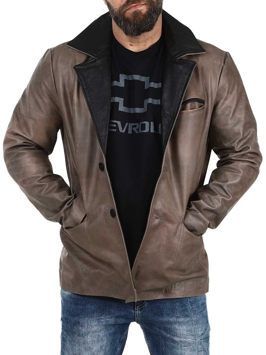 Brown blazer in durable leather with a vintage look and black contrast details. Single-breasted model with classic collar, three front pockets and two inner pockets. Available only at RockDenim!