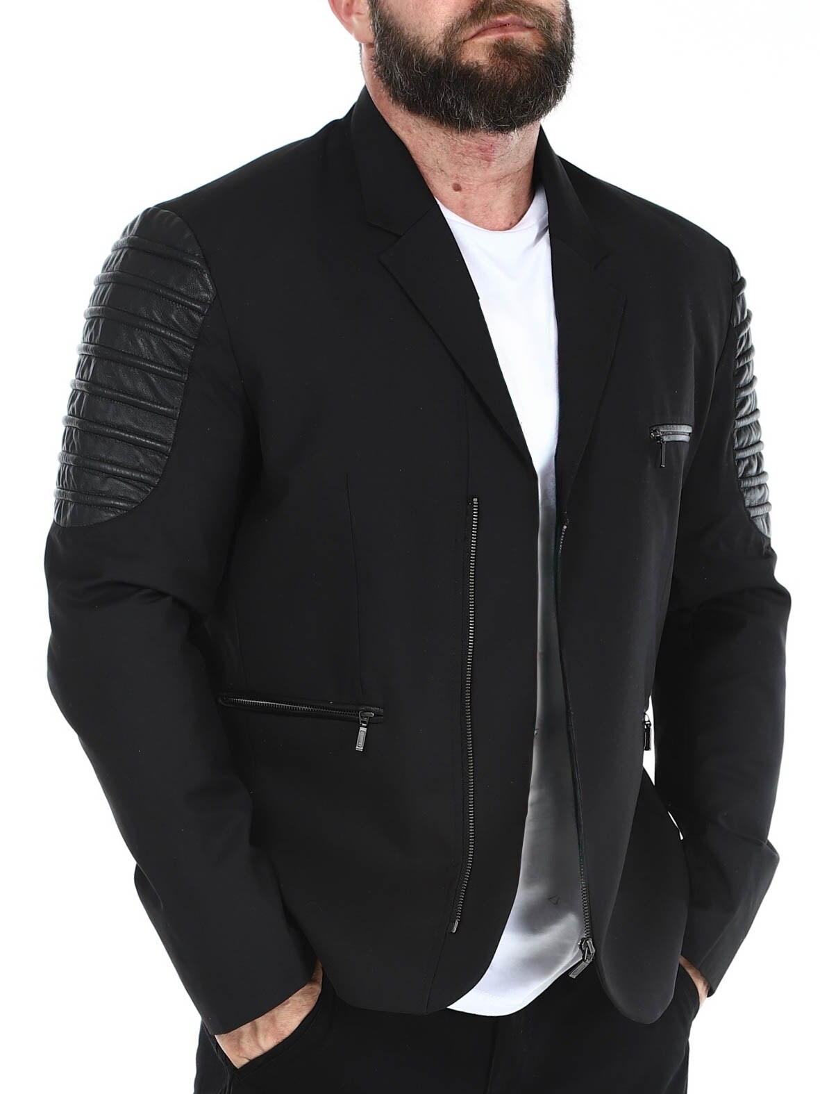 Cotton blazer with zipper closure and faux leather panels. It has three front pockets with zippers and three open inside pockets. Rocky blazer only available at RockDenim!