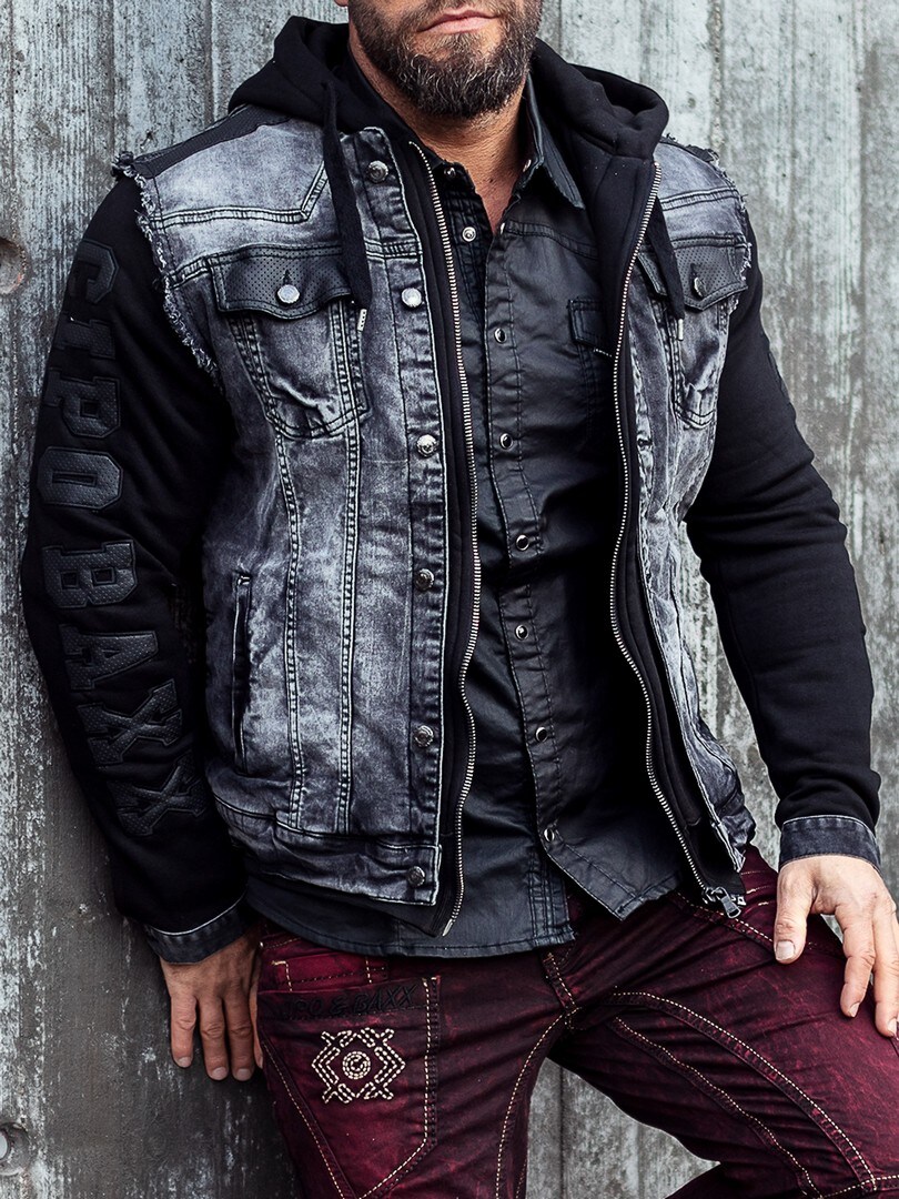 Tough mix between a college jacket and a jean jacket. Black cotton sleeves and hood with gray-black denim fabric on the vest and the bottom of the sleeves. Two pockets on the abdomen and two chest pockets. The jacket closes with a zipper and has sleek buttons on the denim vest. Leather imitation on the chest pockets, shoulders, and writing on the sleeves.