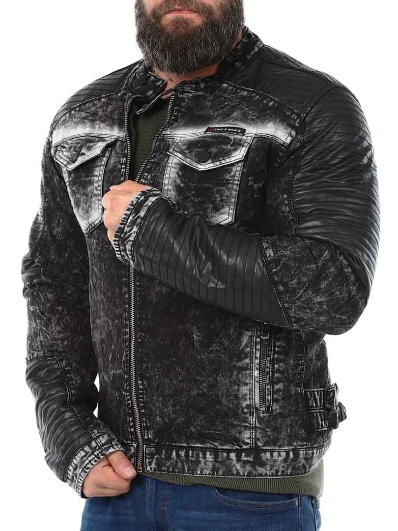 Tough denim jacket designed with imitation leather on the shoulders and sleeves. It has a collar, four closable front pockets and an open inner pocket. The jacket is adjustable with a zipper in the sleeves, and closes with a zipper.