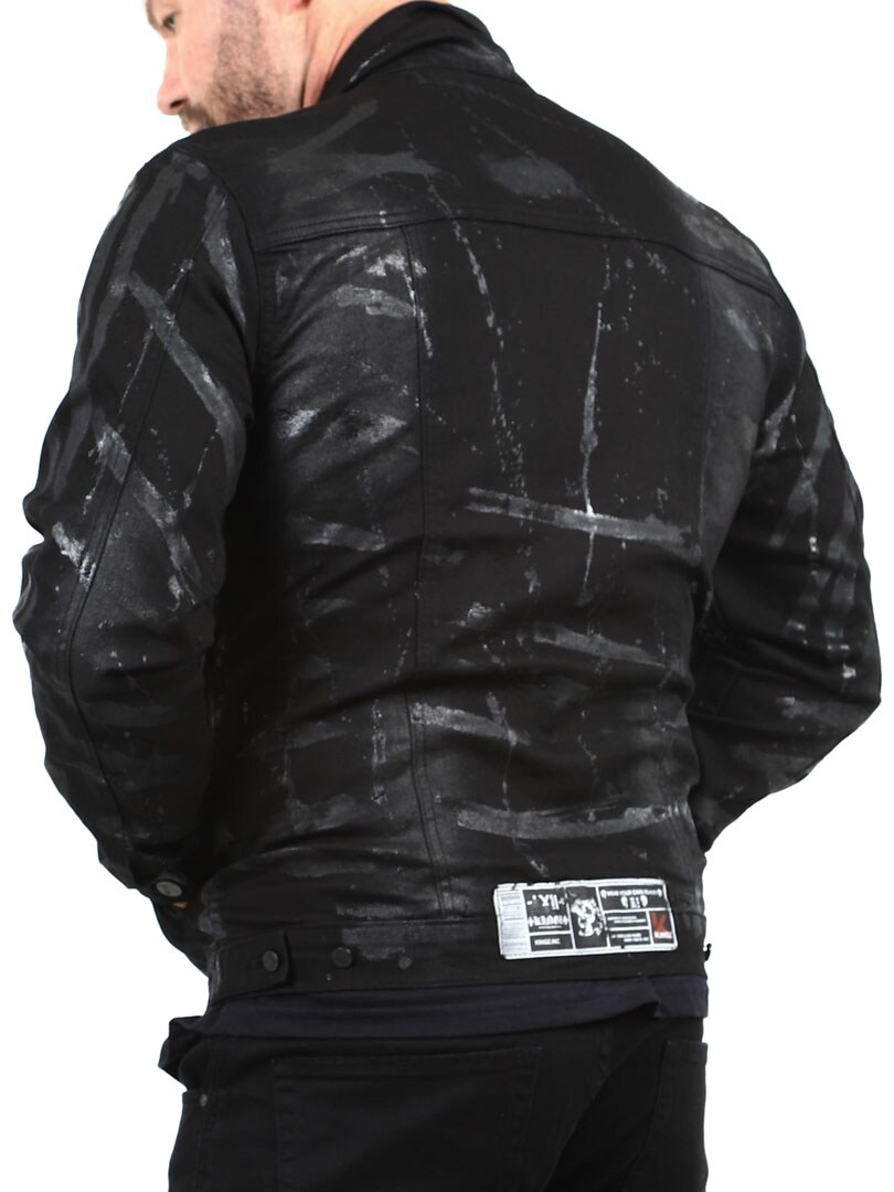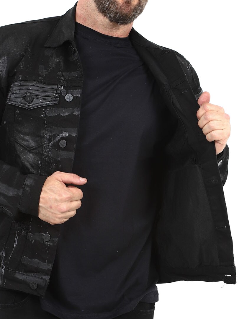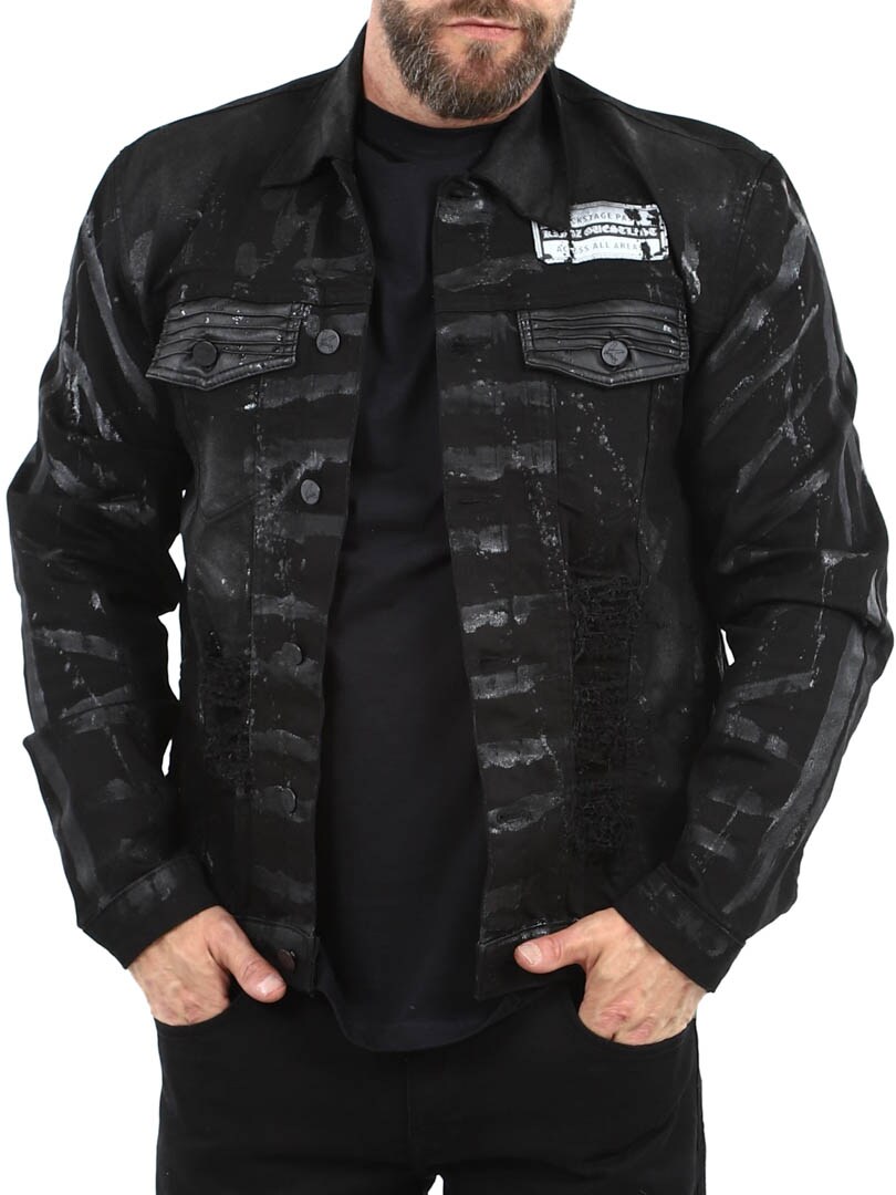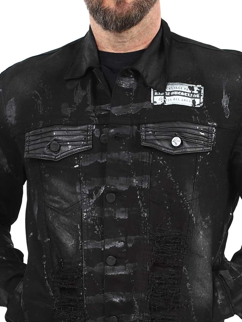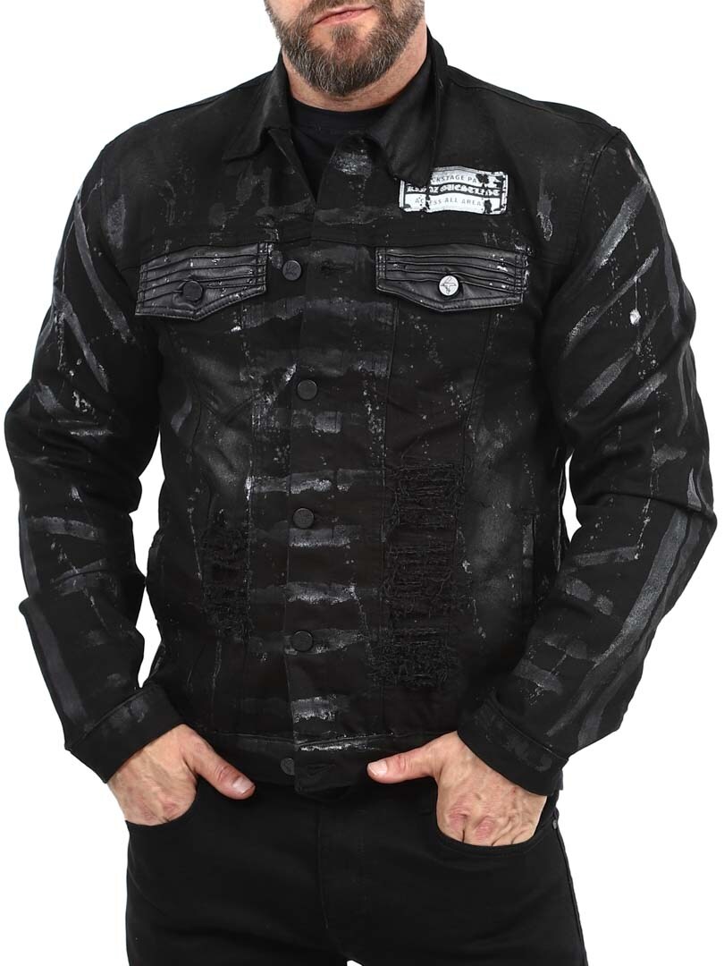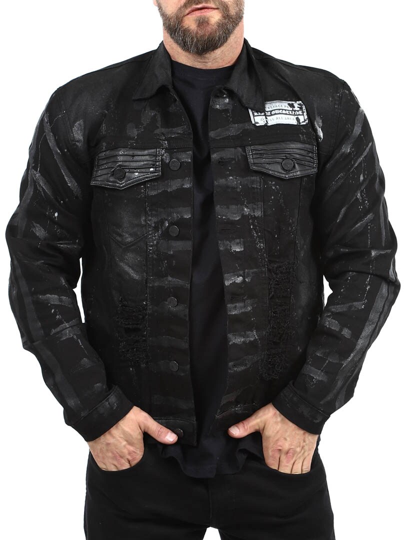 Grab attention with this bold denim jacket where the unique spray paint effect creates a rebellious look with a distinct attitude. Designed with distressed details, four front pockets and button closure.