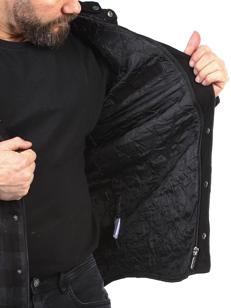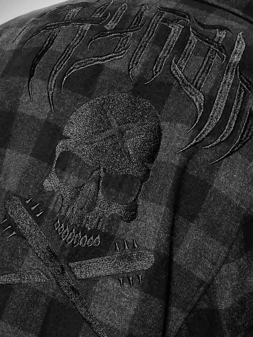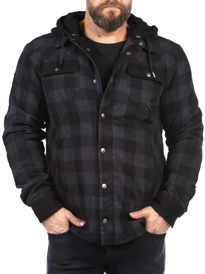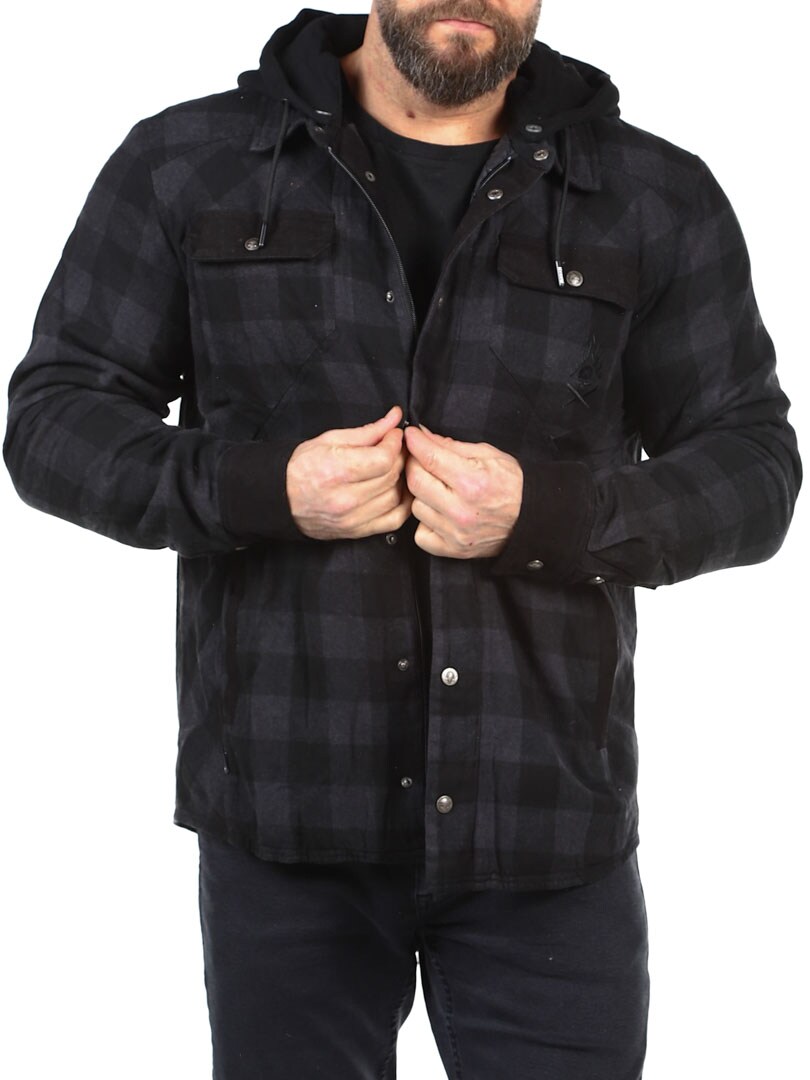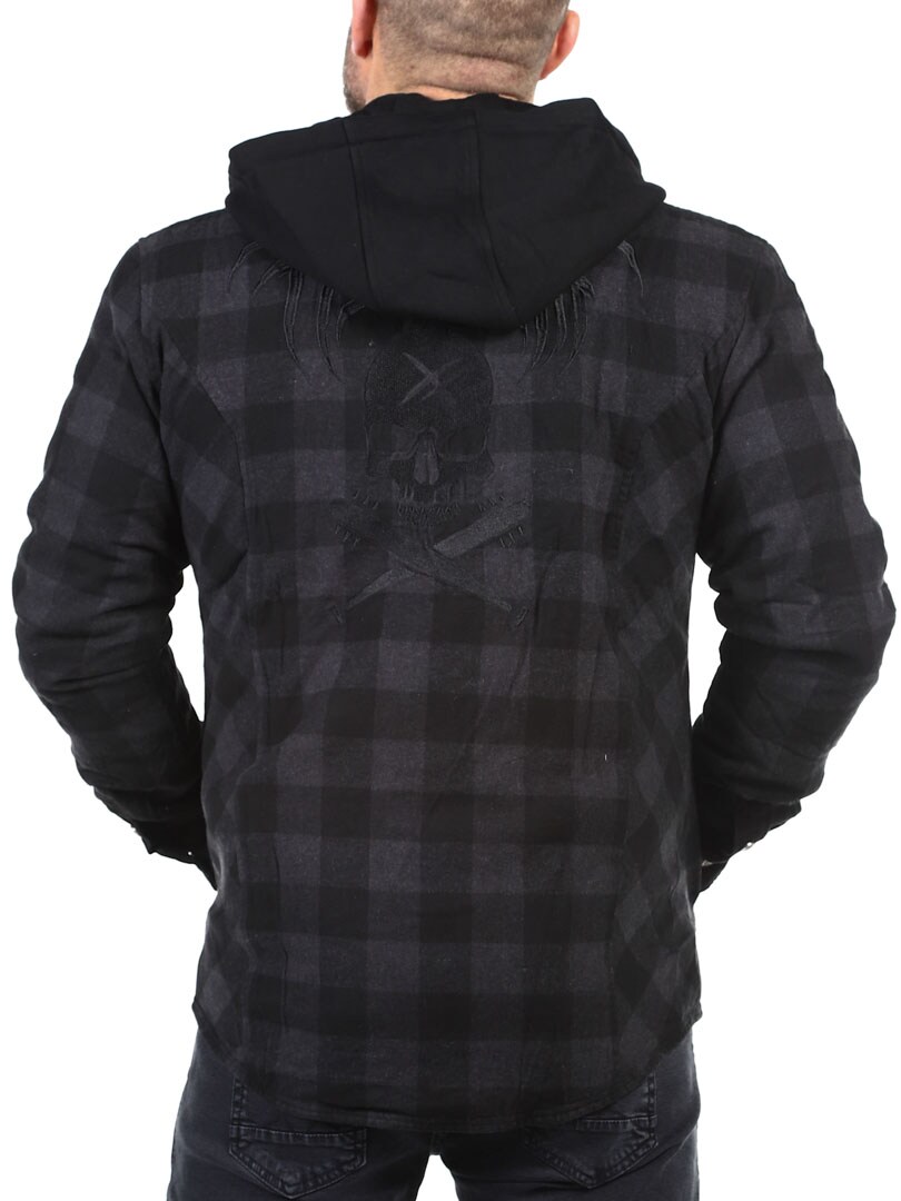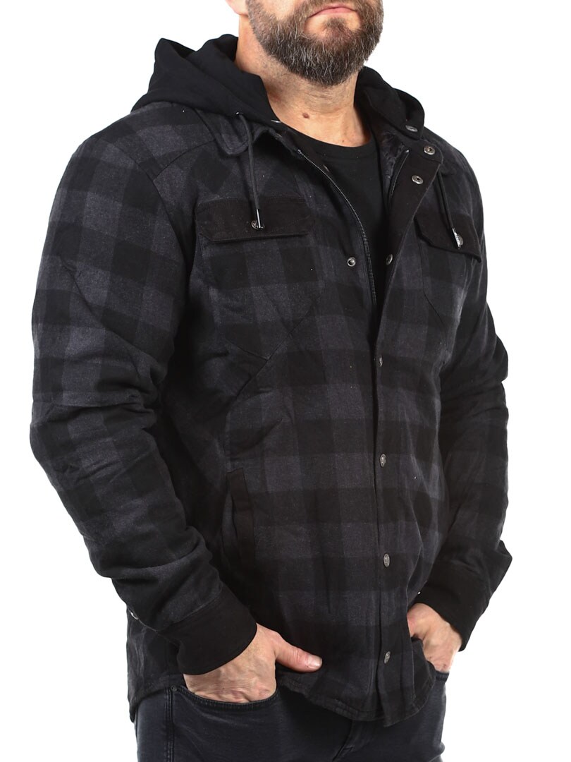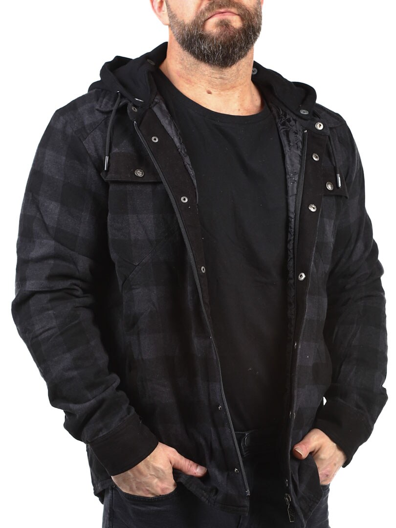Lightly lined checked flannel jacket with detachable hood in sweatshirt material. Designed in a timeless colour with button closure and four practical front pockets. Tailored print on the back gives the jacket more attitude!