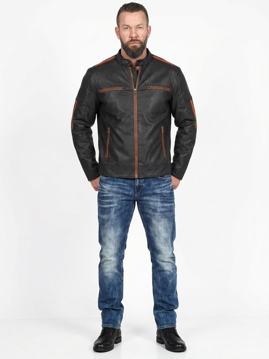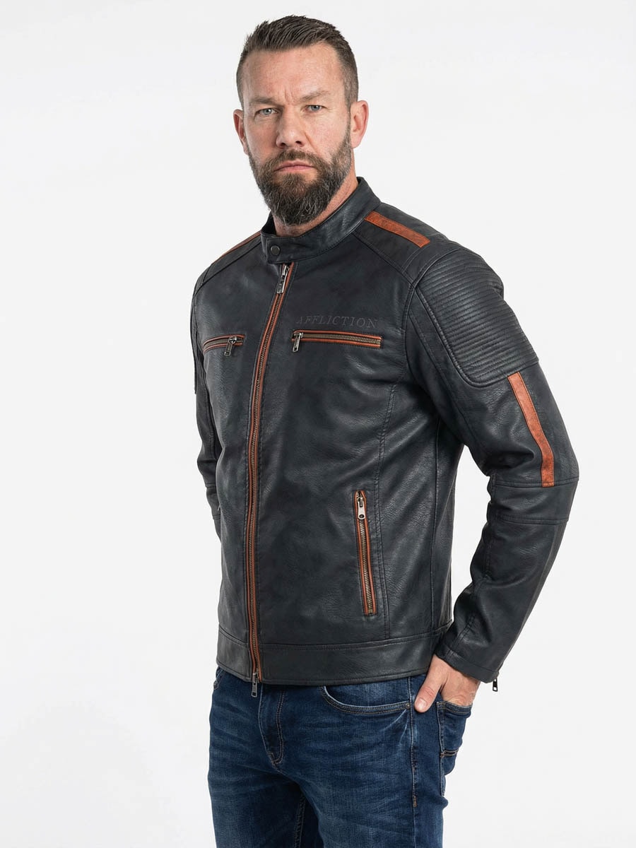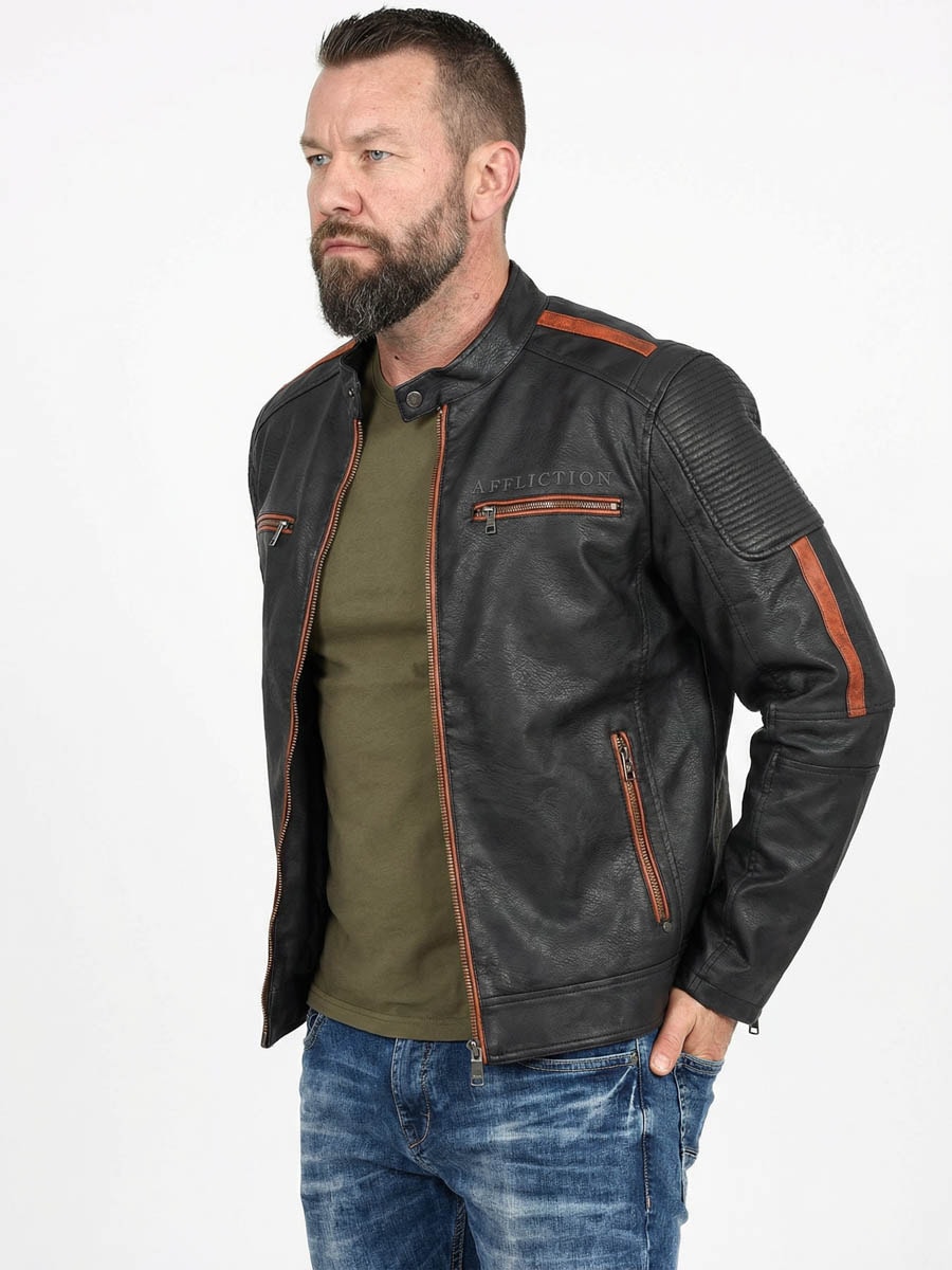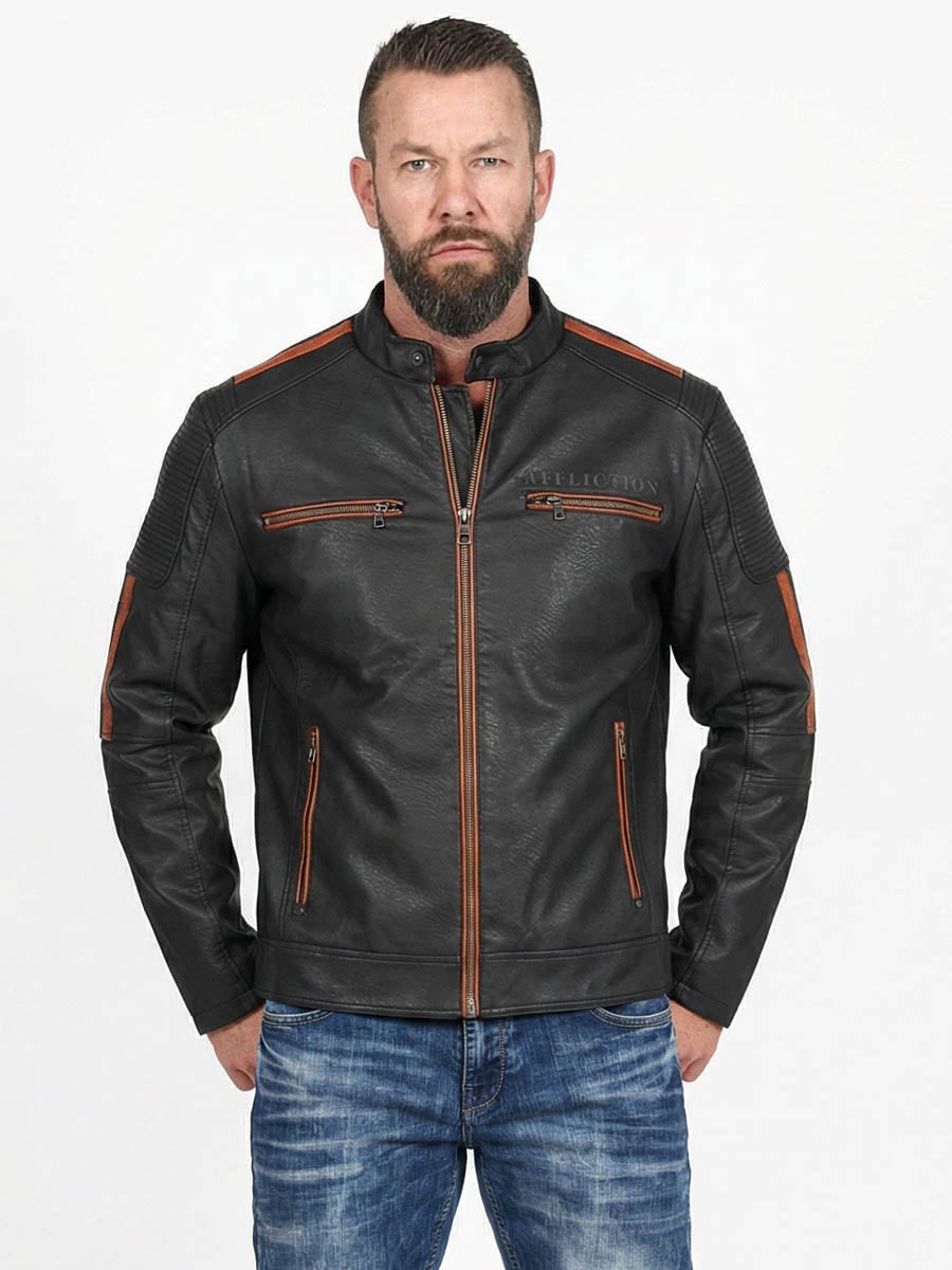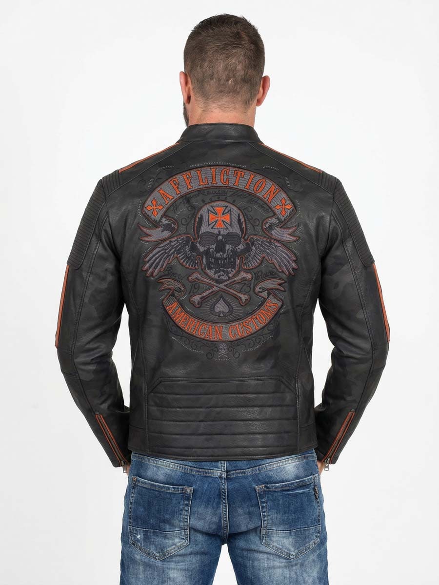 A powerful biker-inspired jacket made from durable PU, created for those who want to stand out. The red accents and embroidered logos enhance its raw edge, while the back features an impressive Affliction American Customs design. Inside the sleeves, a subtle camo pattern adds a modern and unexpected twist. Perfect for anyone who wants a true statement jacket!