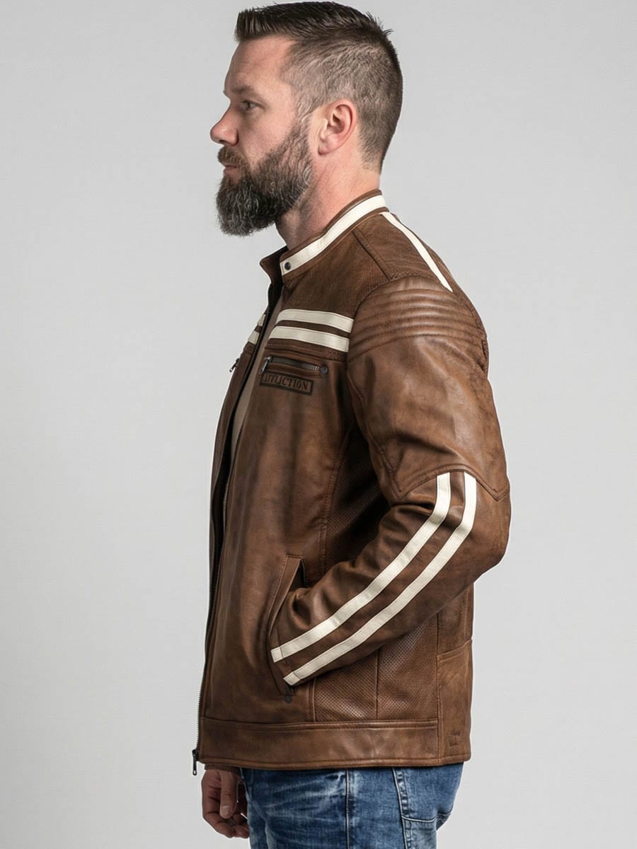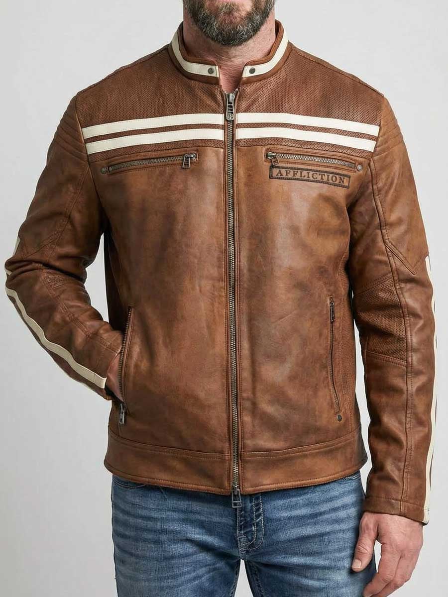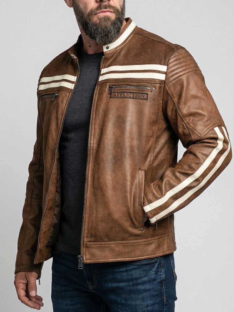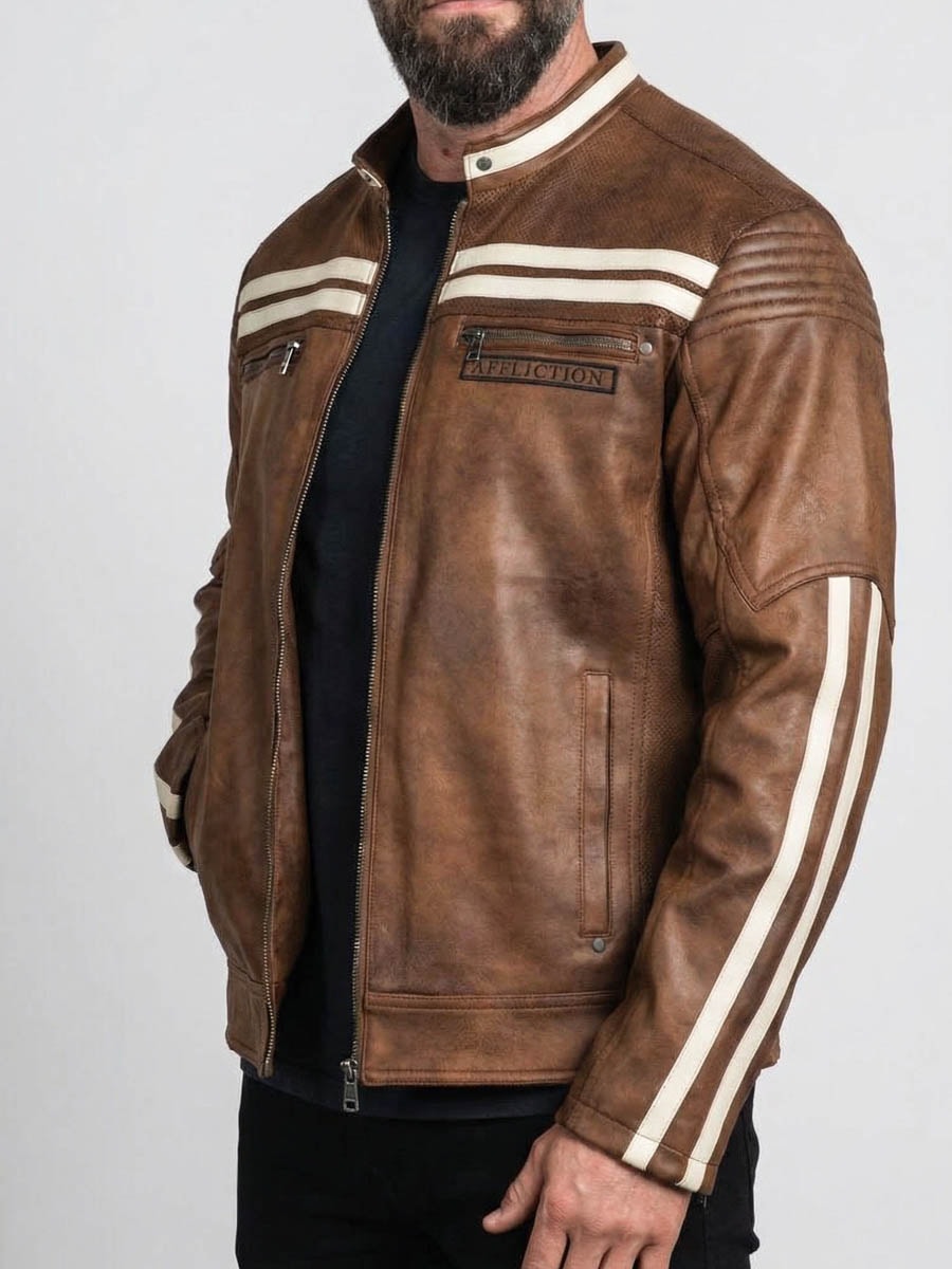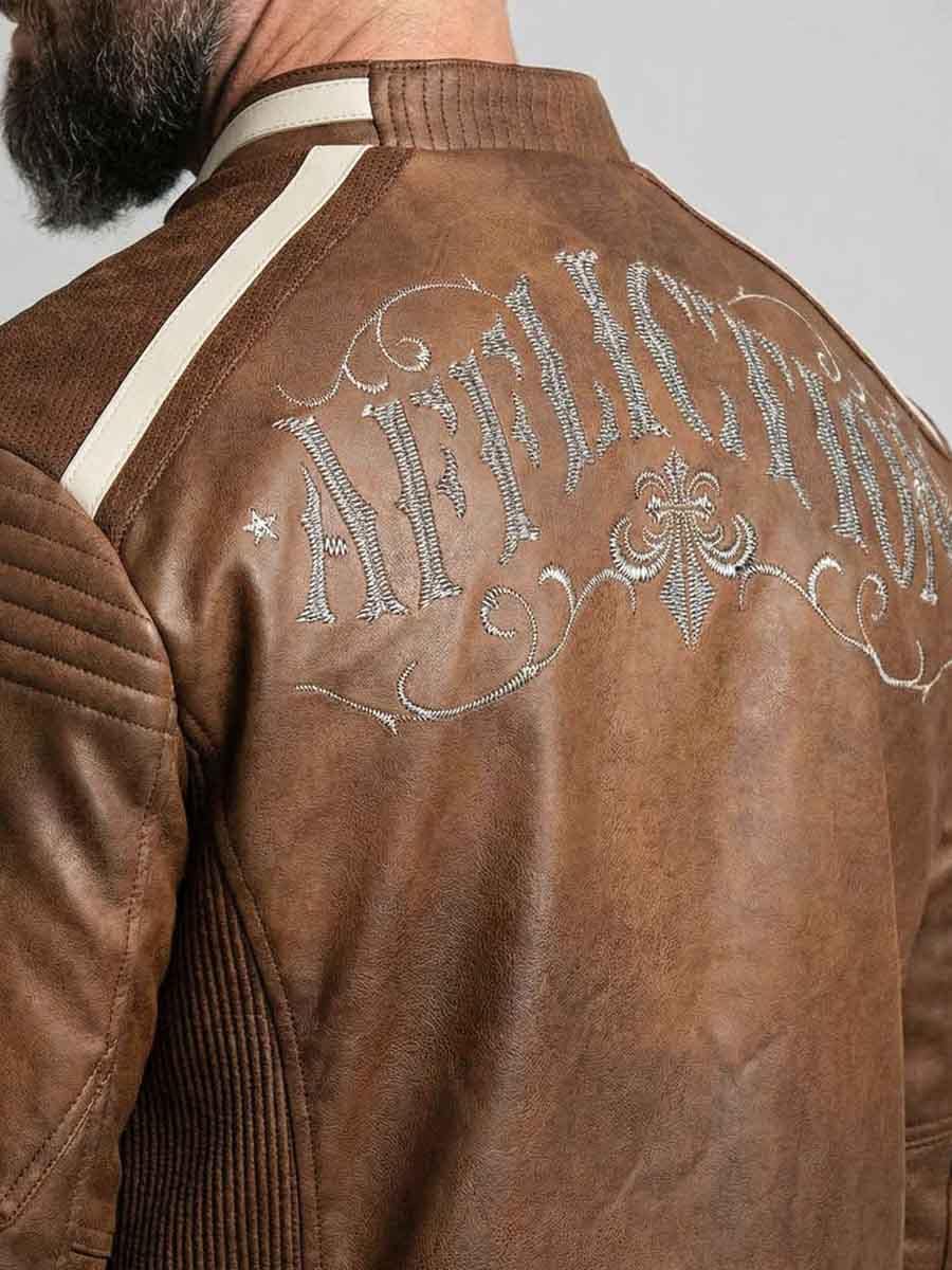 A motorcycle-inspired jacket made from PU leather with a nubuck effect that gives a soft, lightly sanded surface and a premium appearance. The brown tone is paired with contrasting white stripes and embroidered details that enhance the jacket’s unique character. Designed with durable zippers, ribbed panels at the shoulders and elbows, and a comfortable fit that follows the body without feeling stiff. The back features a large embroidered Affliction motif that delivers a distinctive, rock-inspired look. Perfect for those who want a jacket with a premium feel without using real leather.