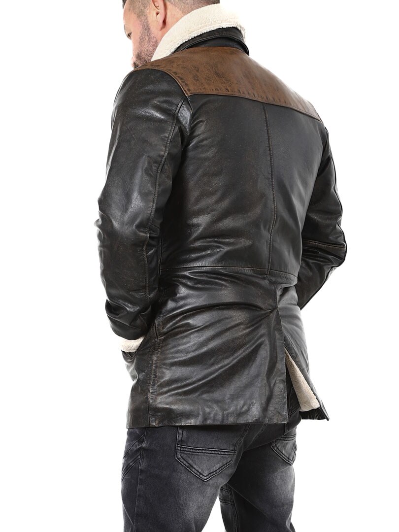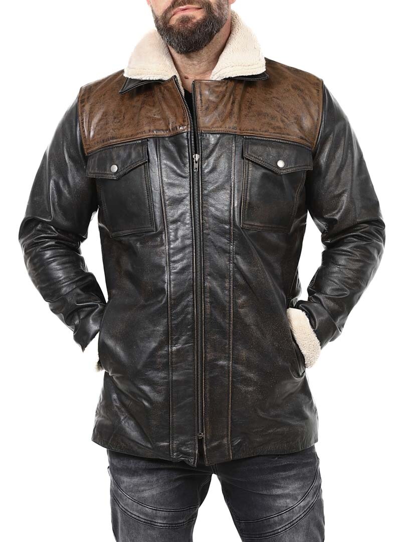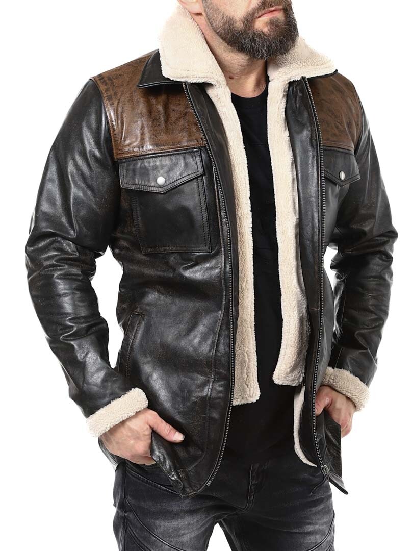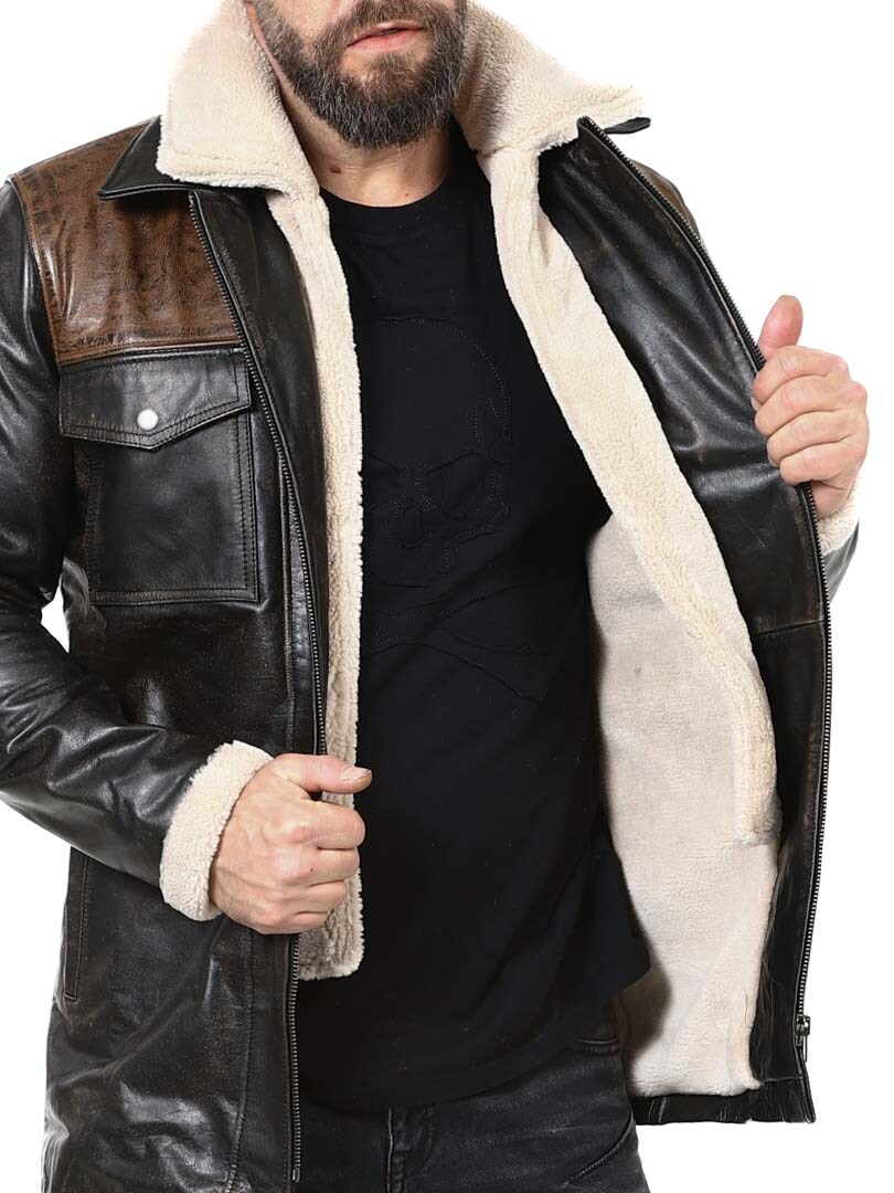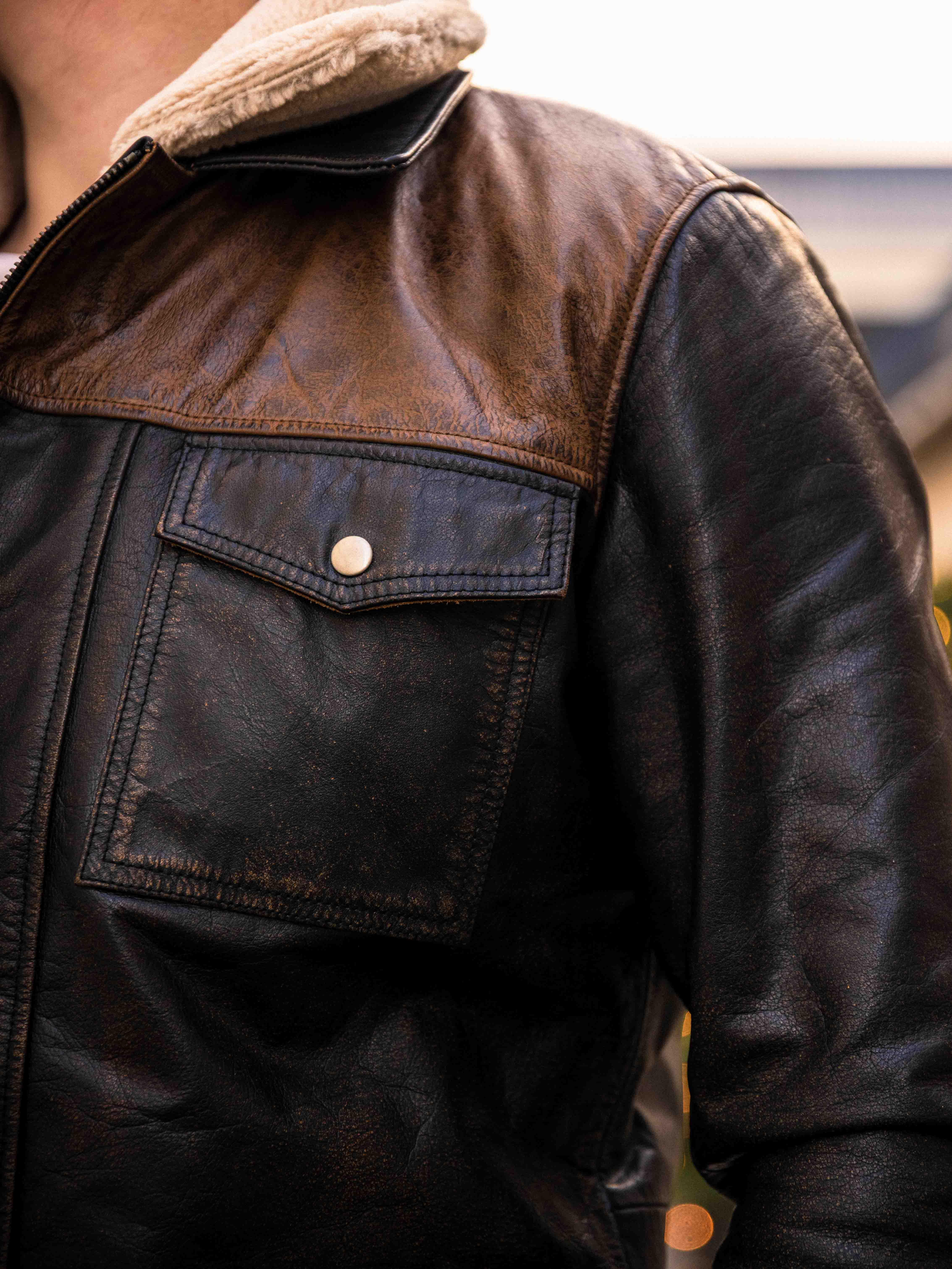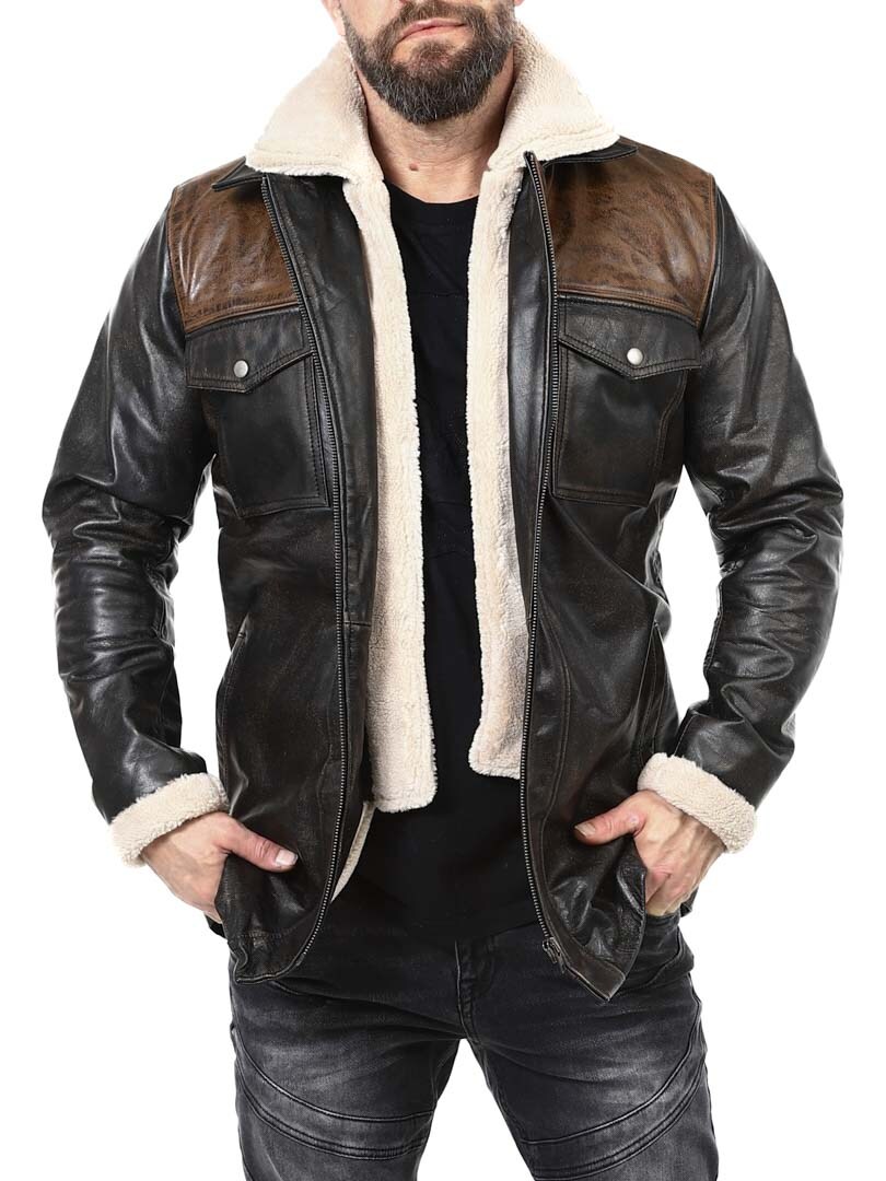 A robust and powerful jacket made from genuine buffalo leather with a design that radiates confidence and attitude. It combines black leather with contrasting brown shoulder panels for a distinctive look. The interior is lined with warm teddy fleece, providing comfort and warmth during cold days. The jacket features multiple pockets and a removable teddy collar, allowing you to easily switch up your style depending on the weather and occasion. A jacket for the man who demands style, strength, and lasting quality – exclusively at RockDenim!