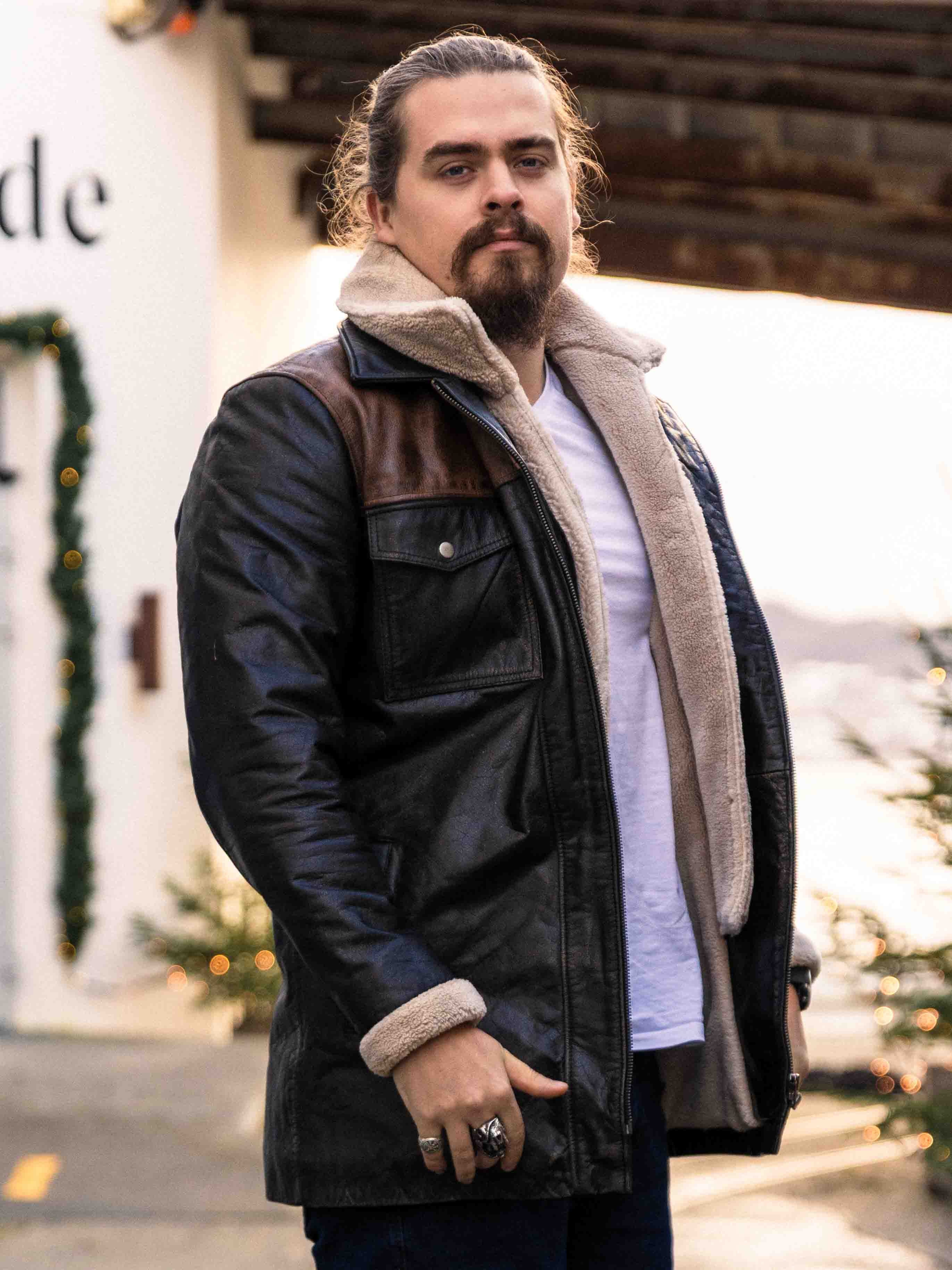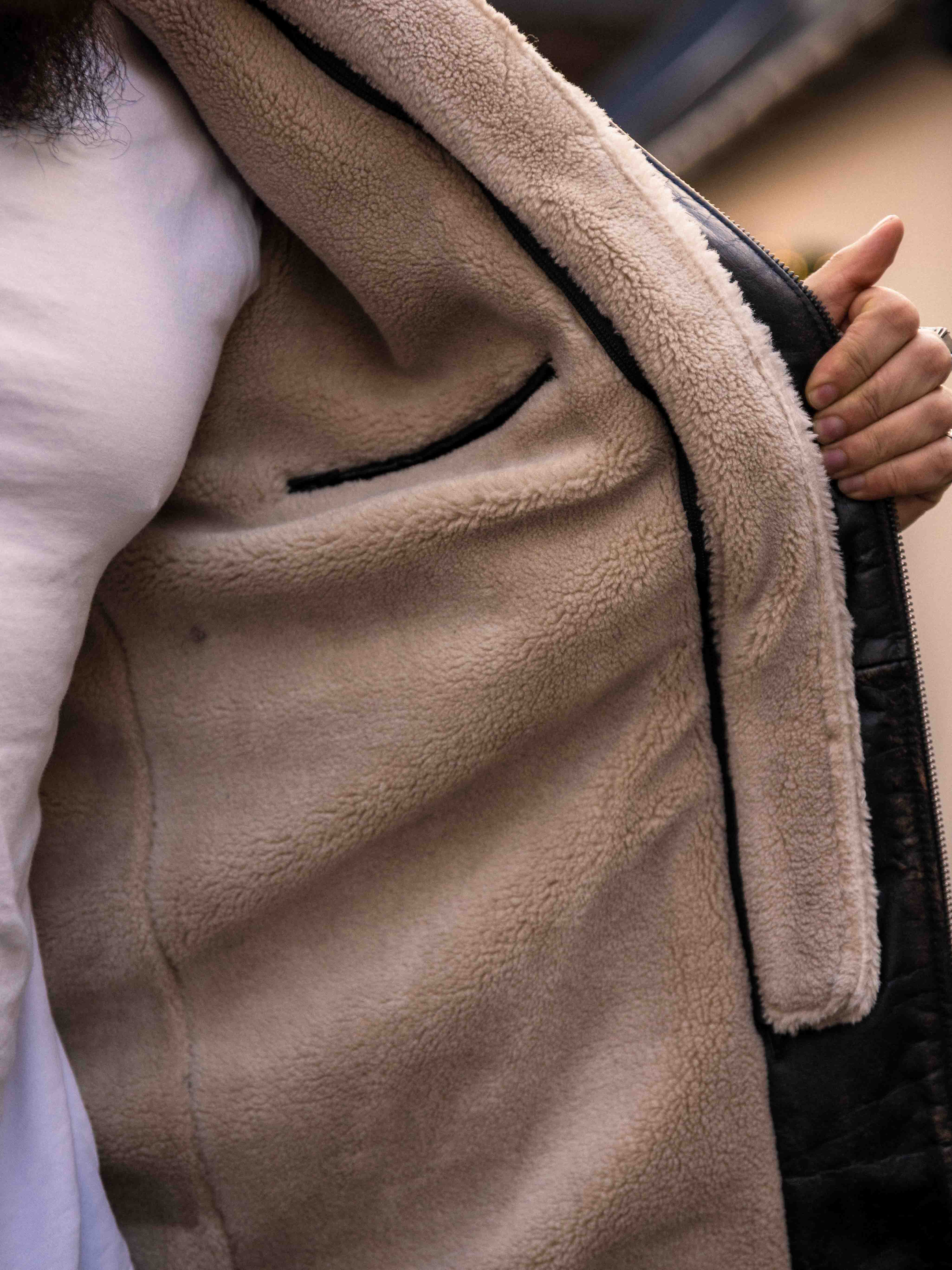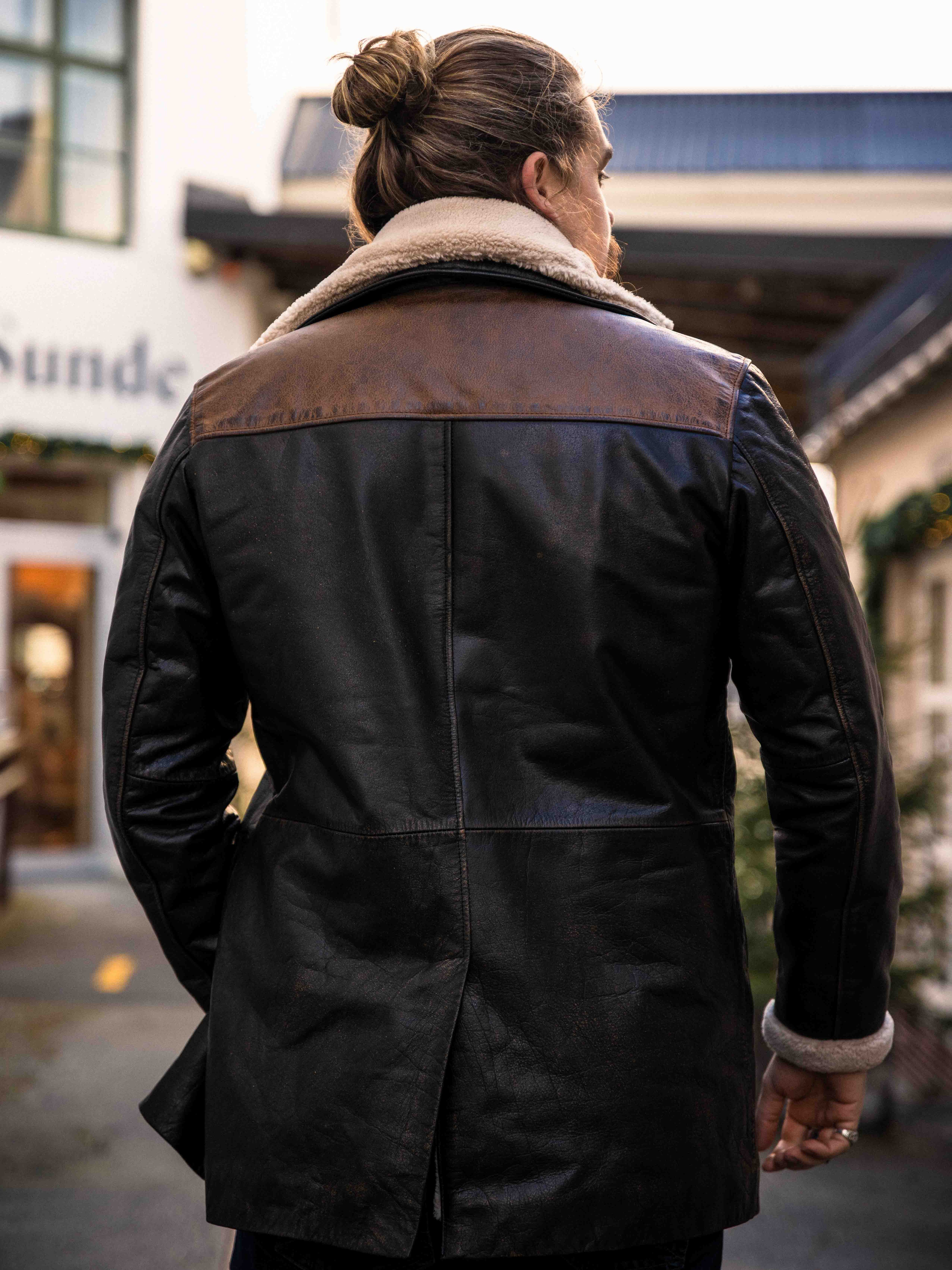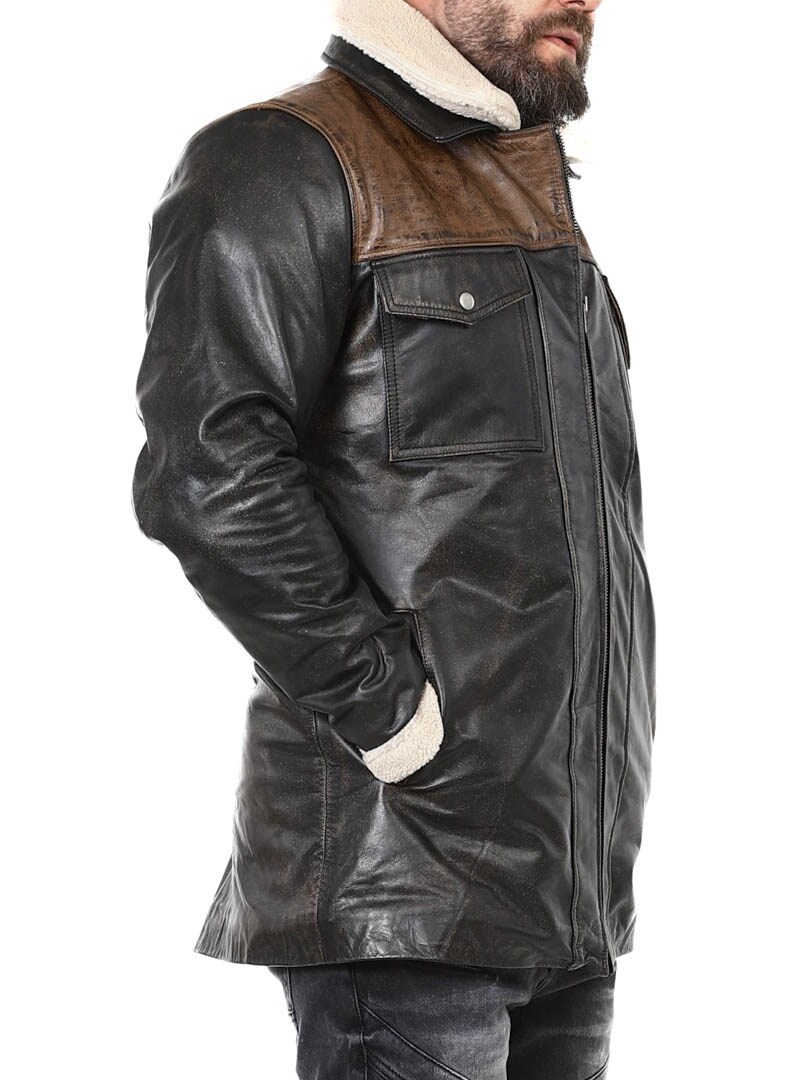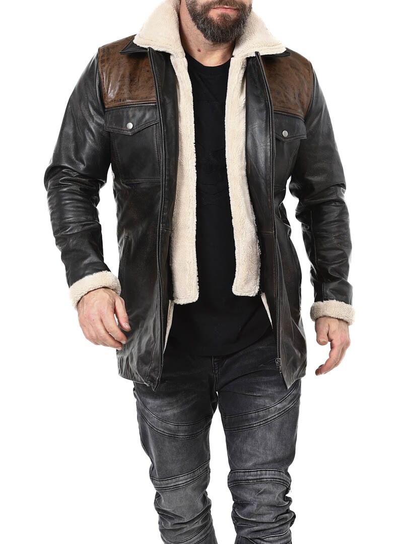 A robust and powerful jacket made from genuine buffalo leather with a design that radiates confidence and attitude. It combines black leather with contrasting brown shoulder panels for a distinctive look. The interior is lined with warm teddy fleece, providing comfort and warmth during cold days. The jacket features multiple pockets and a removable teddy collar, allowing you to easily switch up your style depending on the weather and occasion. A jacket for the man who demands style, strength, and lasting quality – exclusively at RockDenim!