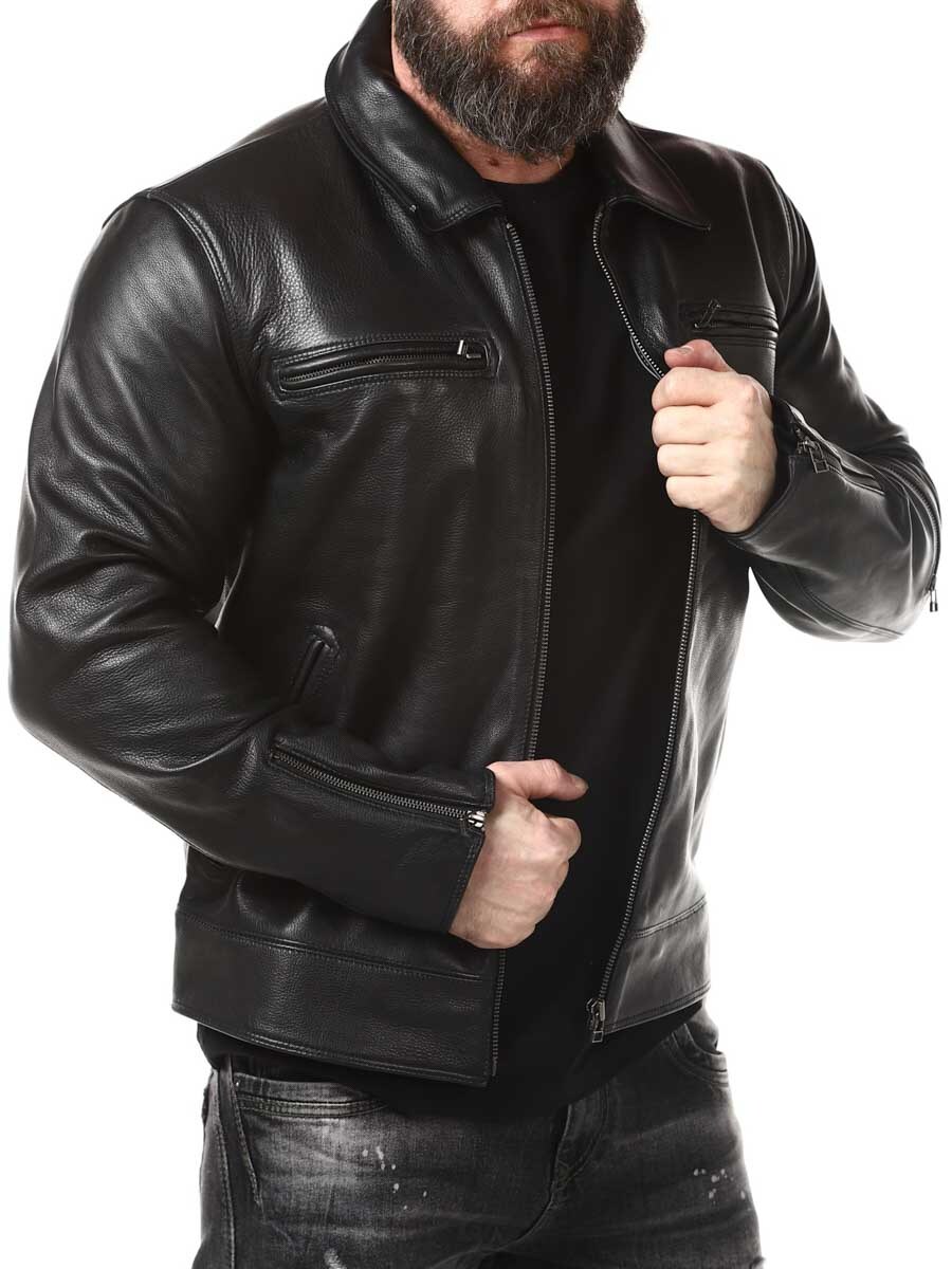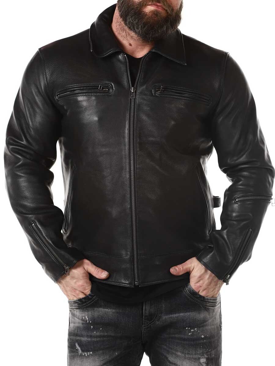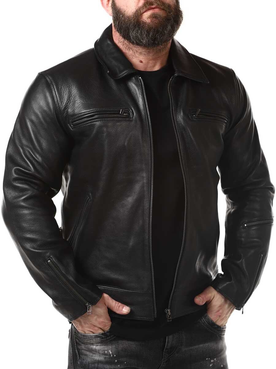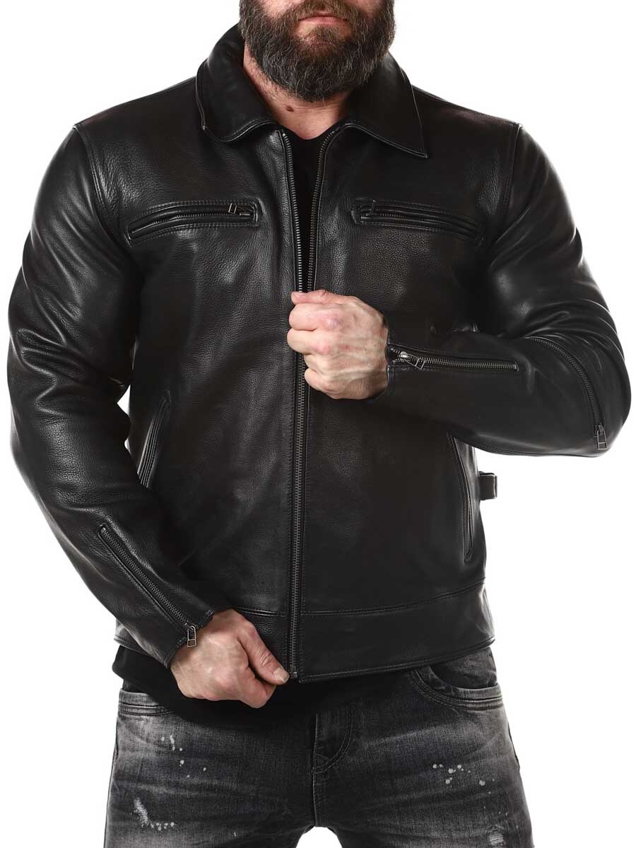 Strong and heavy jacket in genuine leather. Designed with collar and adjustable waist and cuffs. Four front pockets, one arm pocket and two inner pockets.  Perfect for those who want a timeless jacket in good quality!