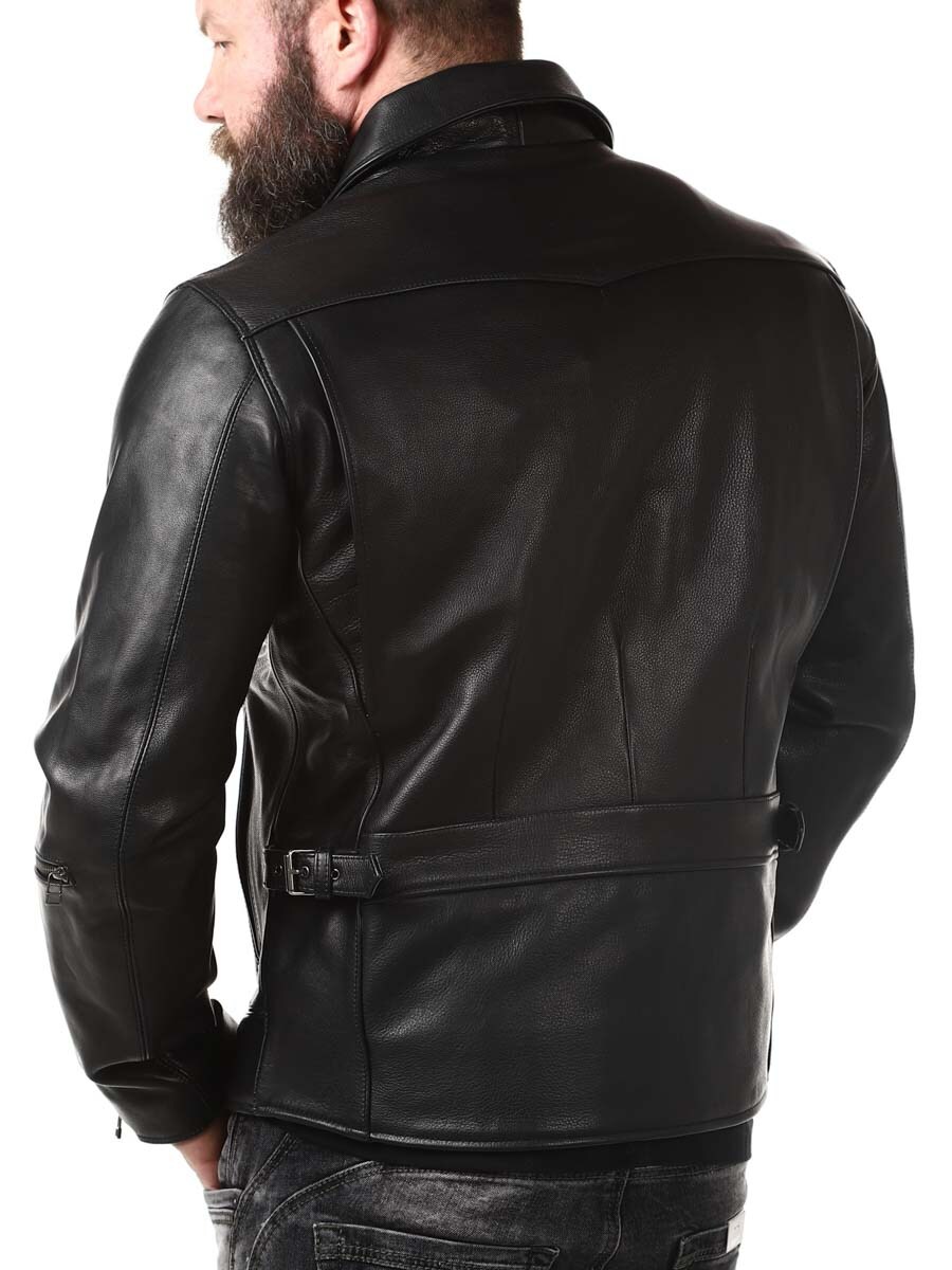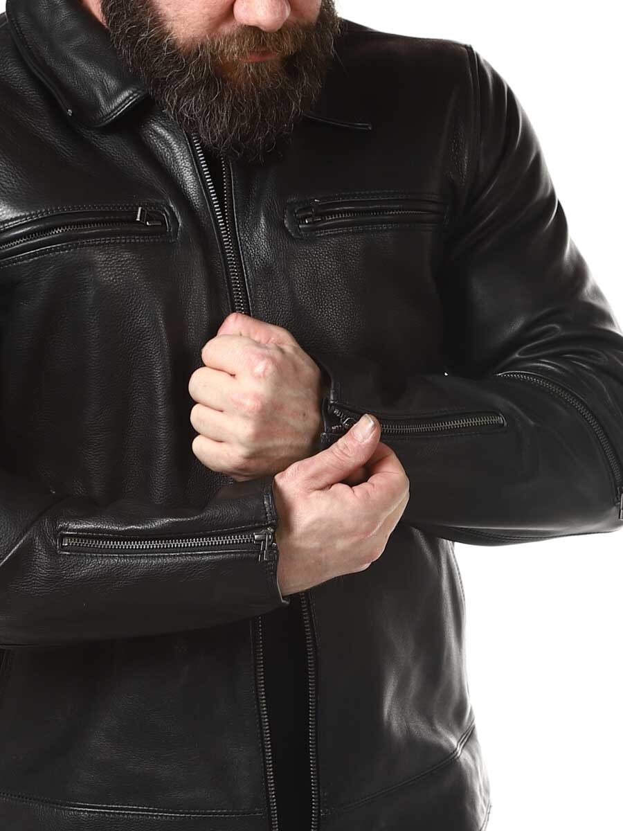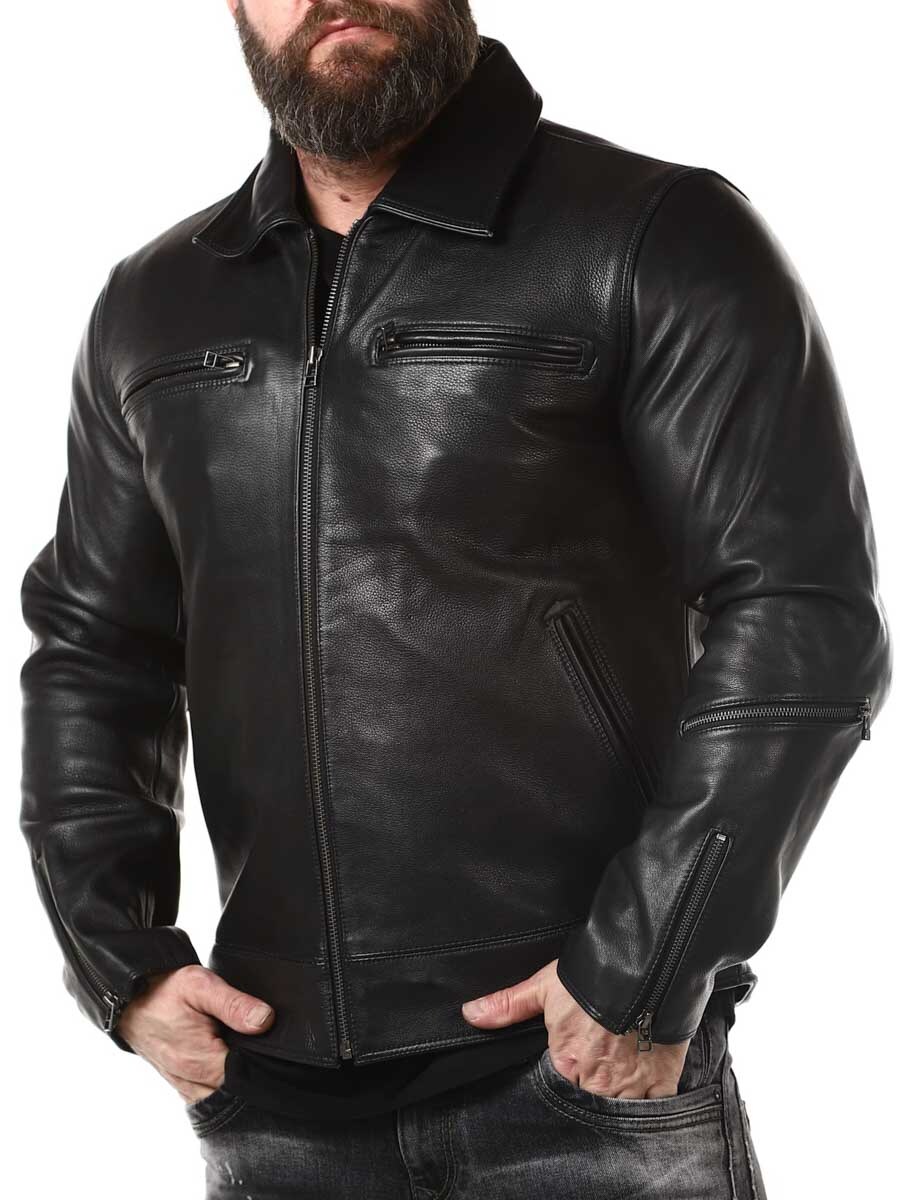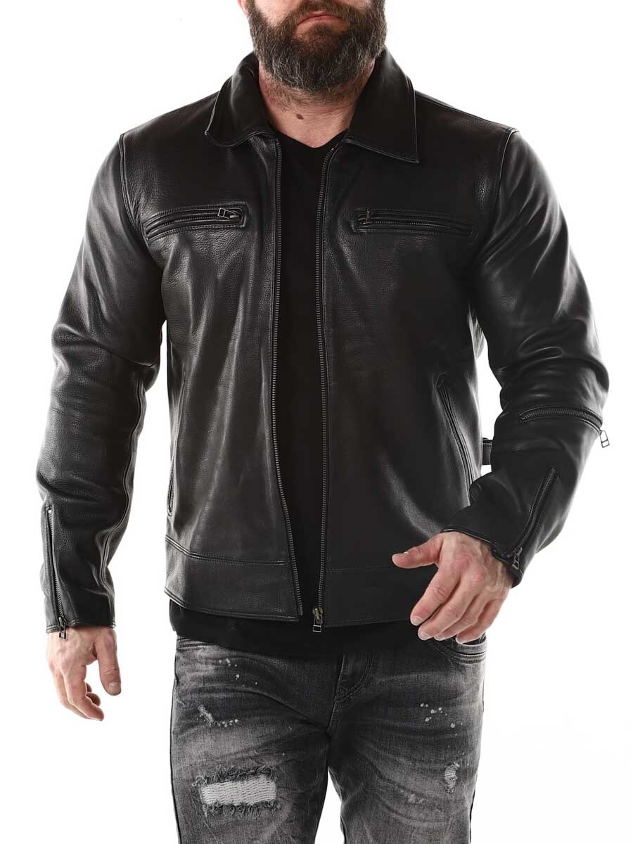 Strong and heavy jacket in genuine leather. Designed with collar and adjustable waist and cuffs. Four front pockets, one arm pocket and two inner pockets.  Perfect for those who want a timeless jacket in good quality!