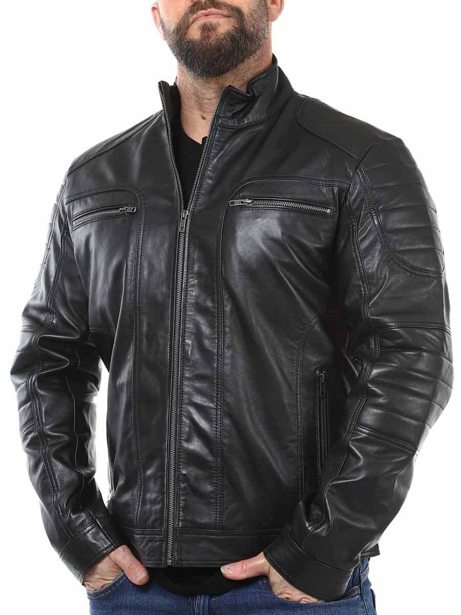 Stylish and stylish leather jacket with collar that closes with a zipper. It is adjustable at the cuffs with a zipper and has padded parts. There are four closable front pockets and two inner pockets. This jacket can only be found at Rockdenim!