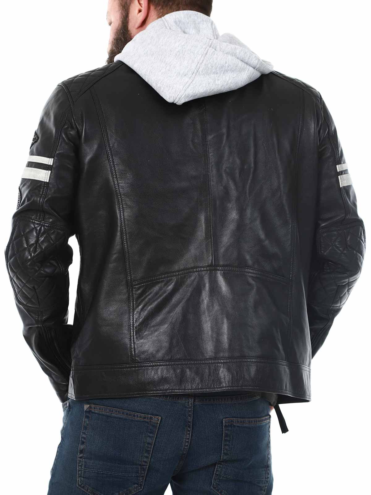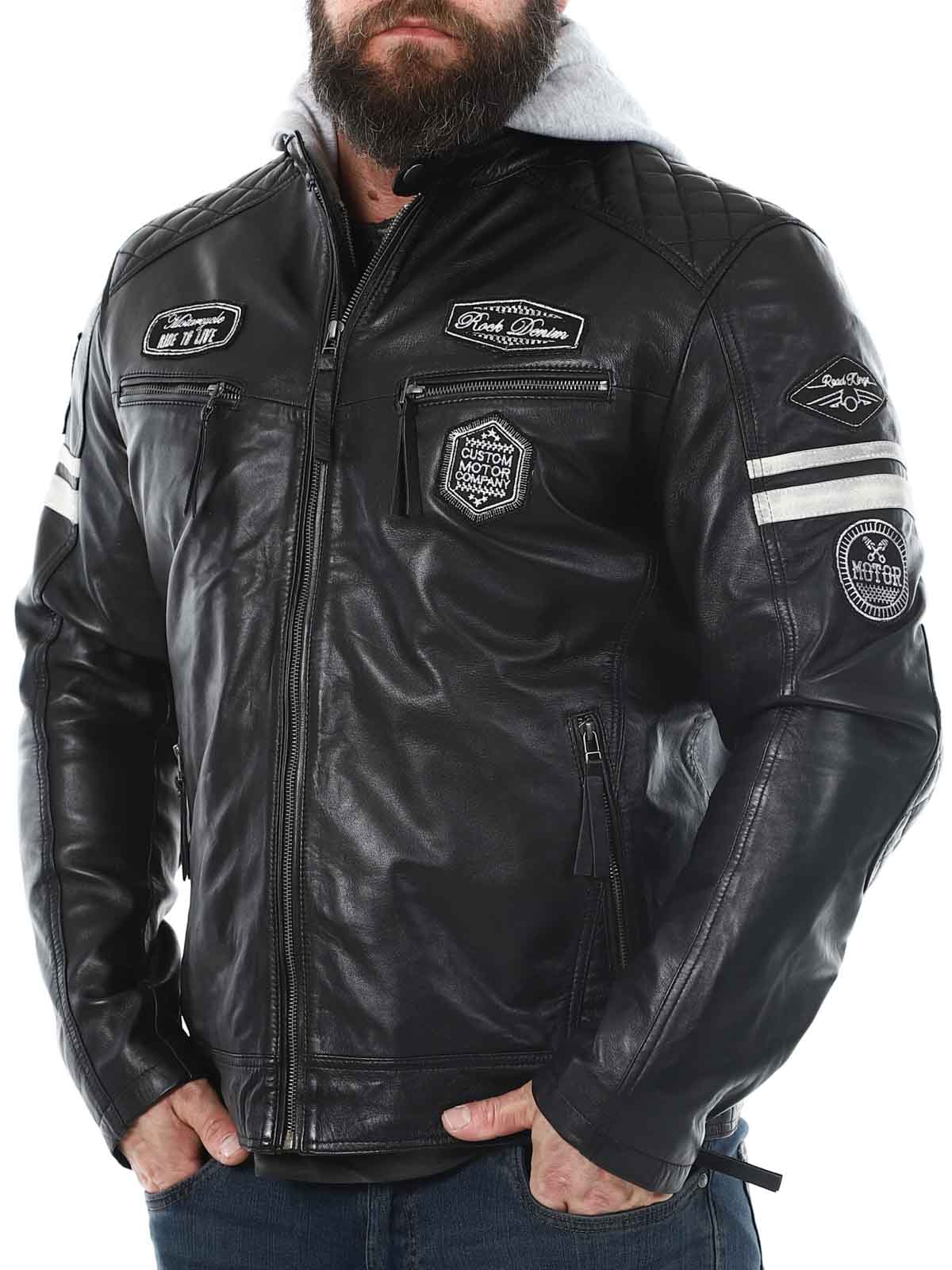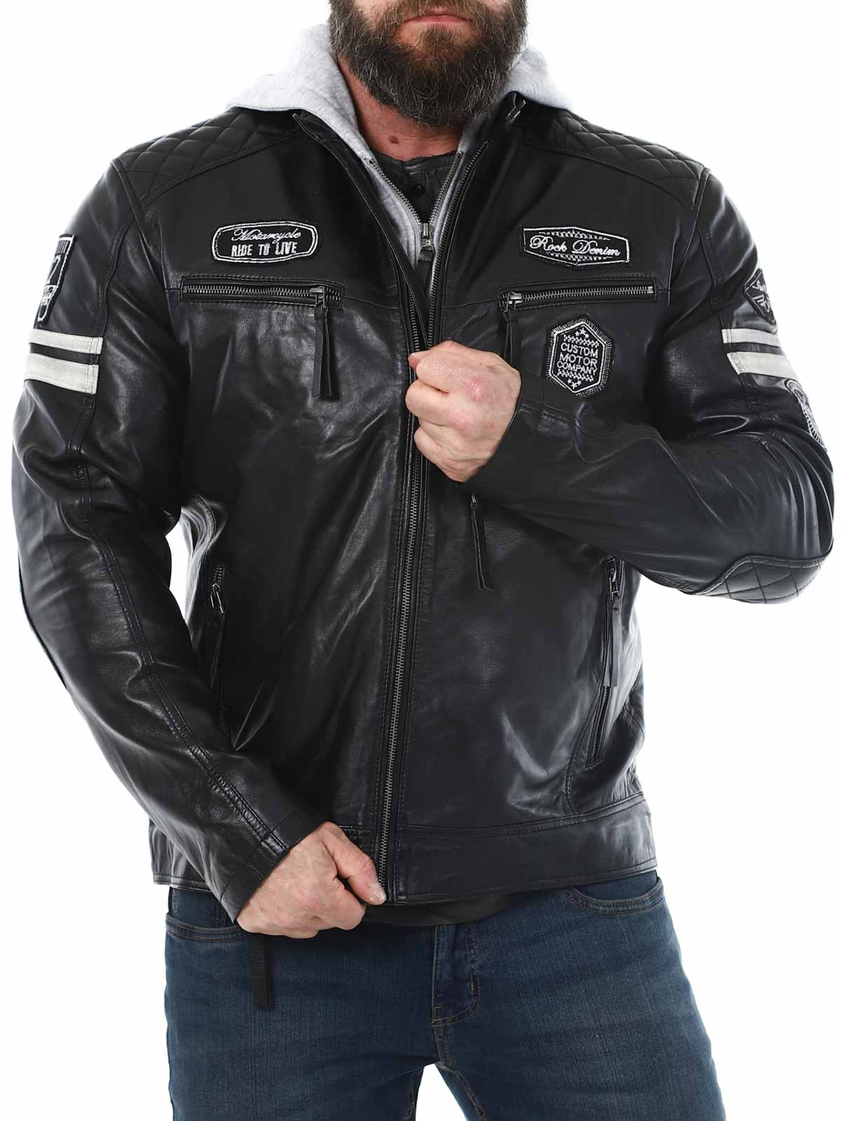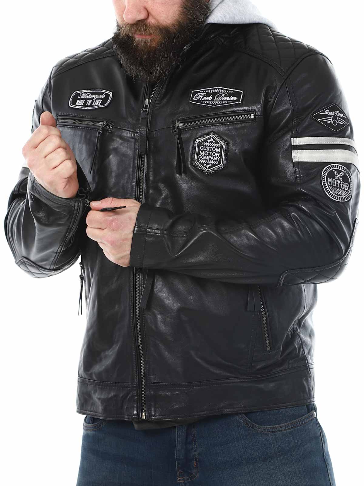 Racing-inspired jacket in soft and supple leather. Designed with fabric patches and a removable hood made of sweatshirt material. Features four front zippered pockets, two inner pockets, and adjustable sleeve cuffs. A stylish jacket available only at RockDenim!