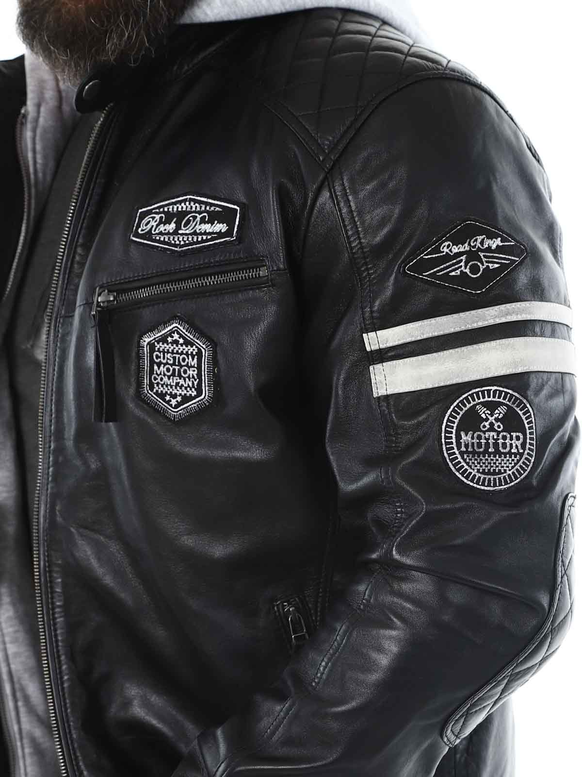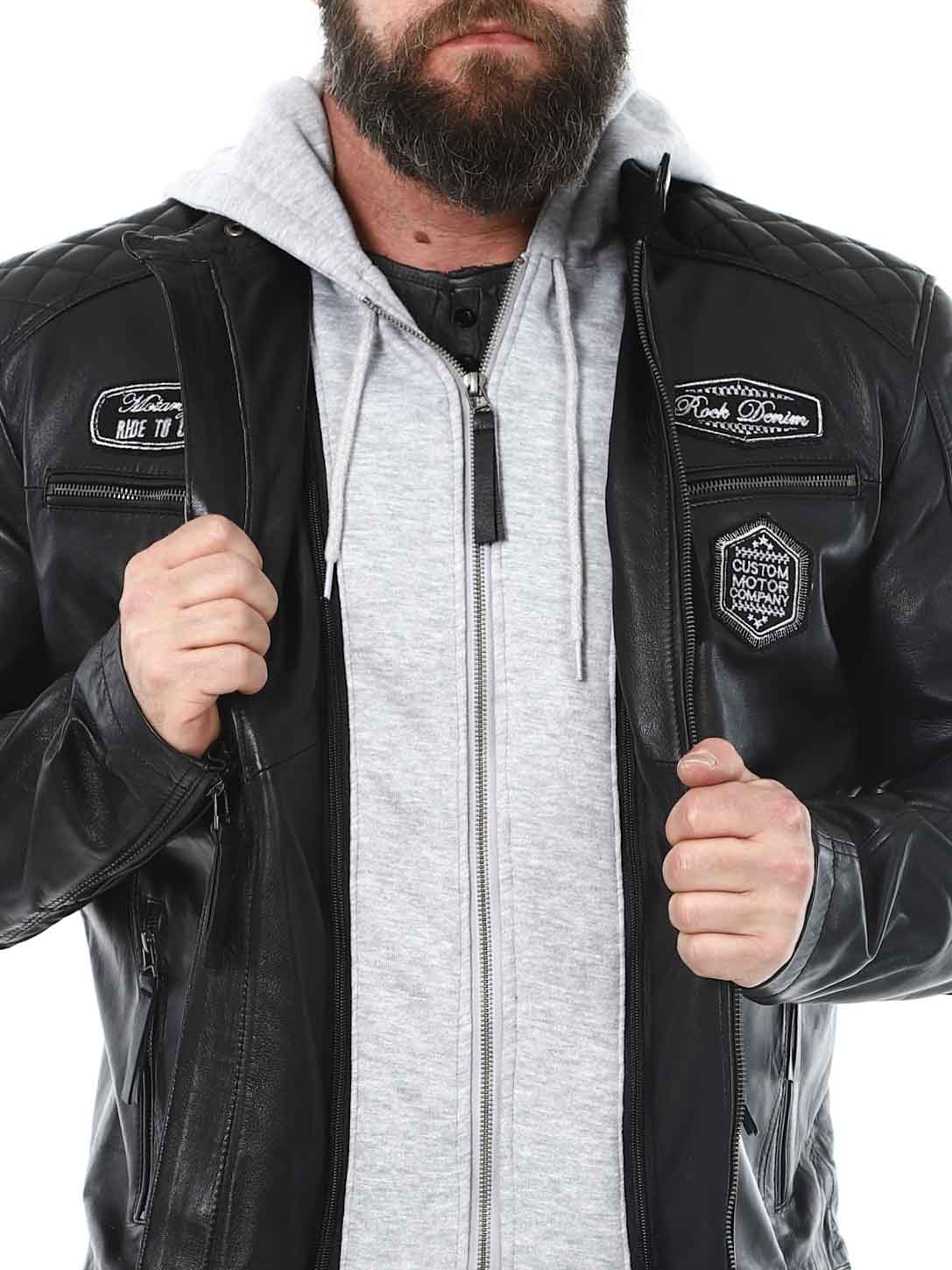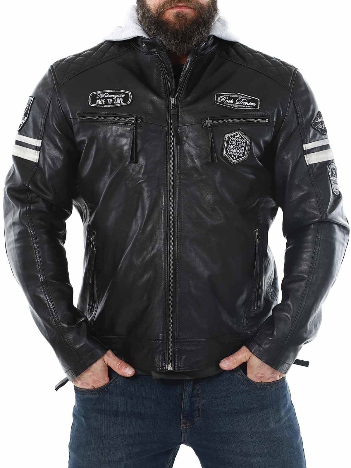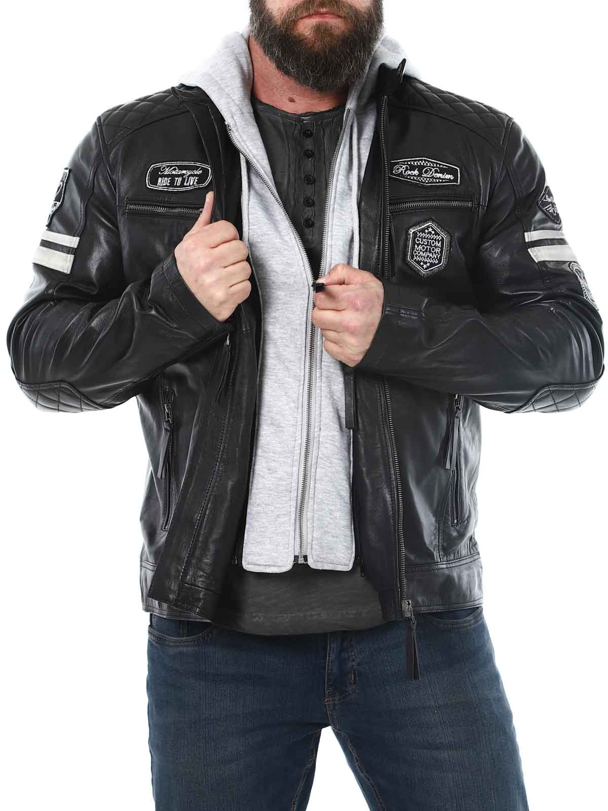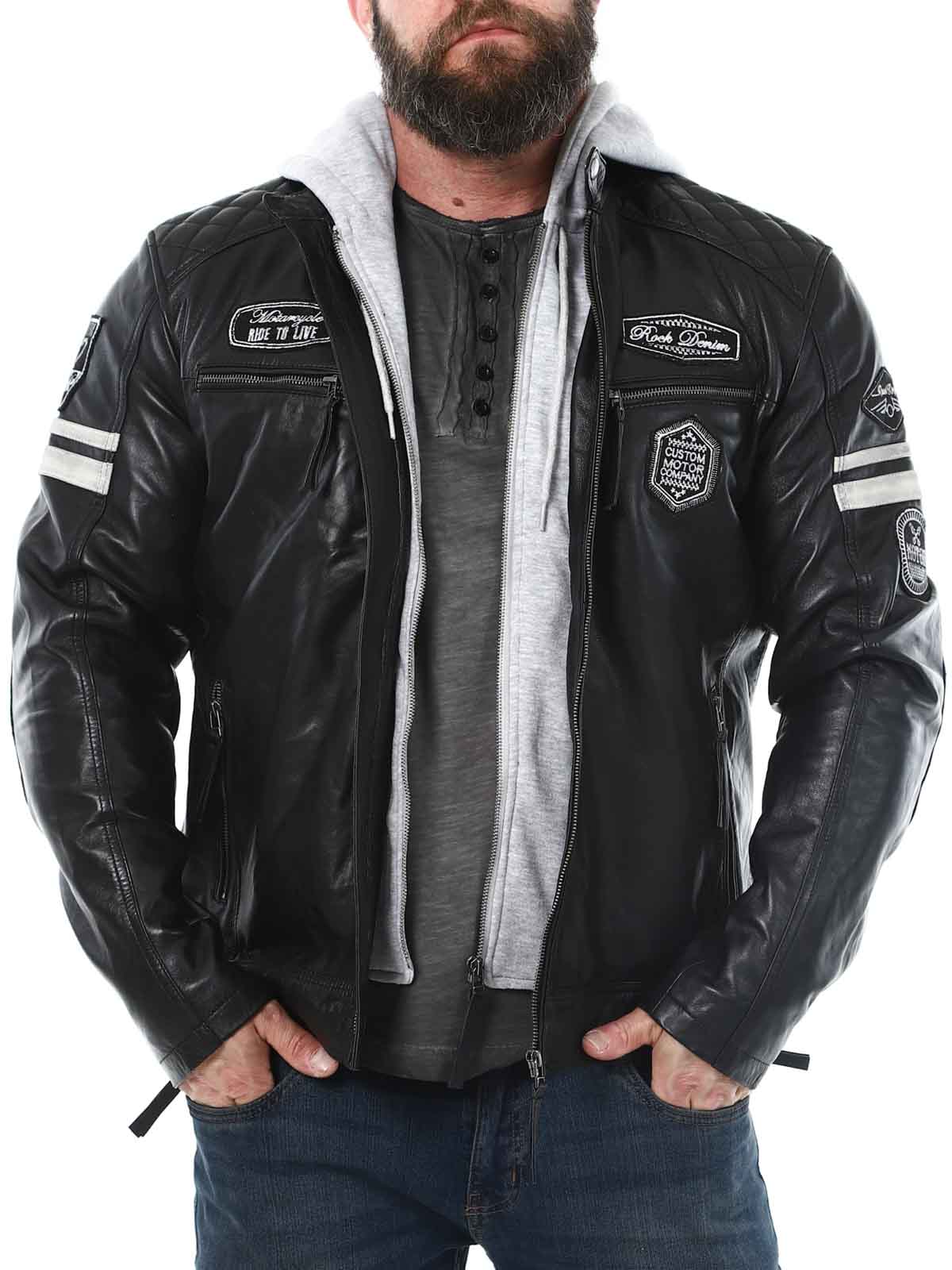 Racing-inspired jacket in soft and supple leather. Designed with fabric patches and a removable hood made of sweatshirt material. Features four front zippered pockets, two inner pockets, and adjustable sleeve cuffs. A stylish jacket available only at RockDenim!