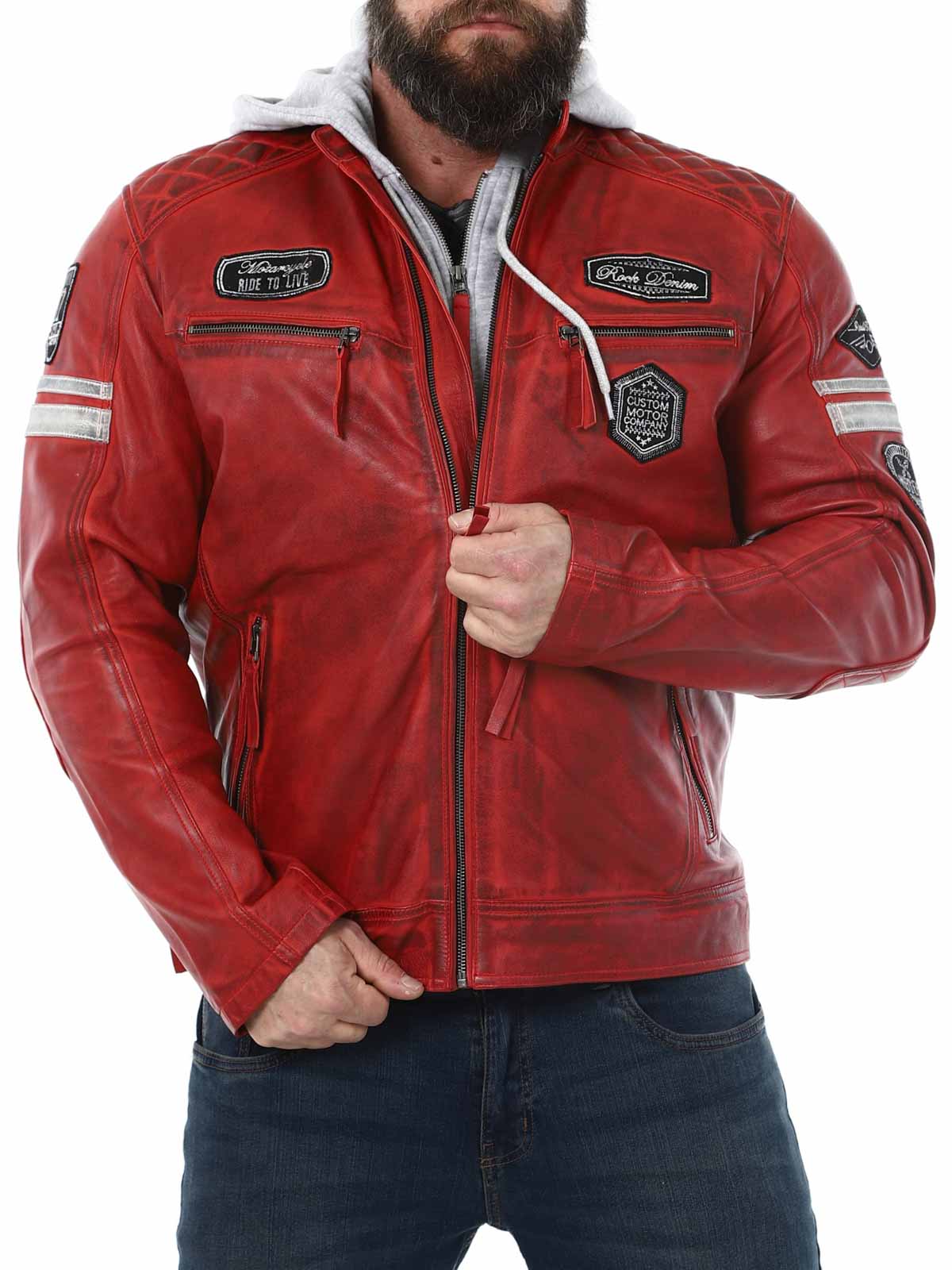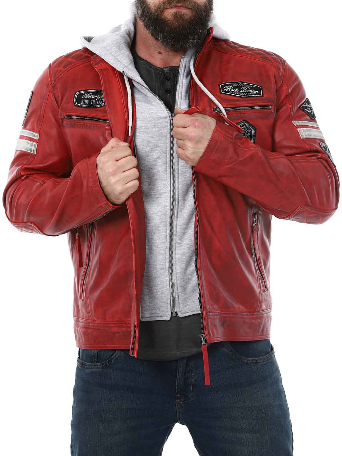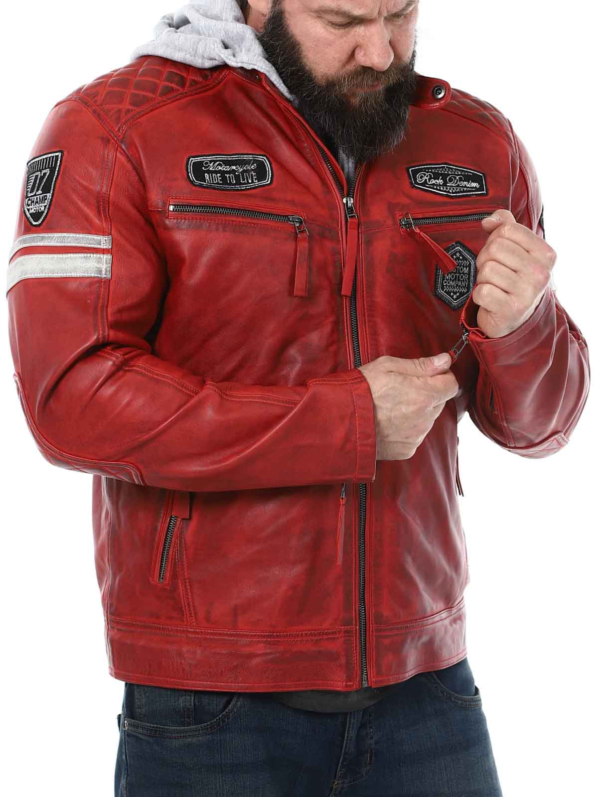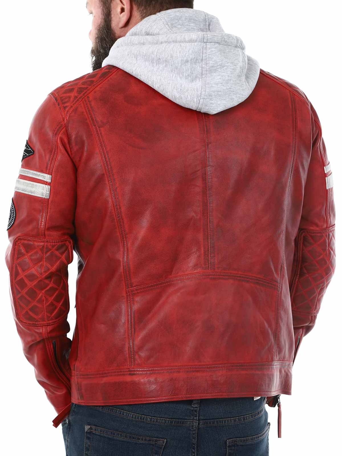 Racing-inspired jacket in soft and supple leather. Designed with fabric patches and a removable hood made of sweatshirt material. Features four front zippered pockets, two inner pockets, and adjustable sleeve cuffs. A stylish jacket available only at RockDenim!