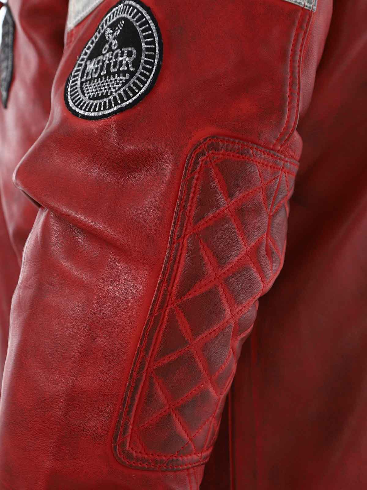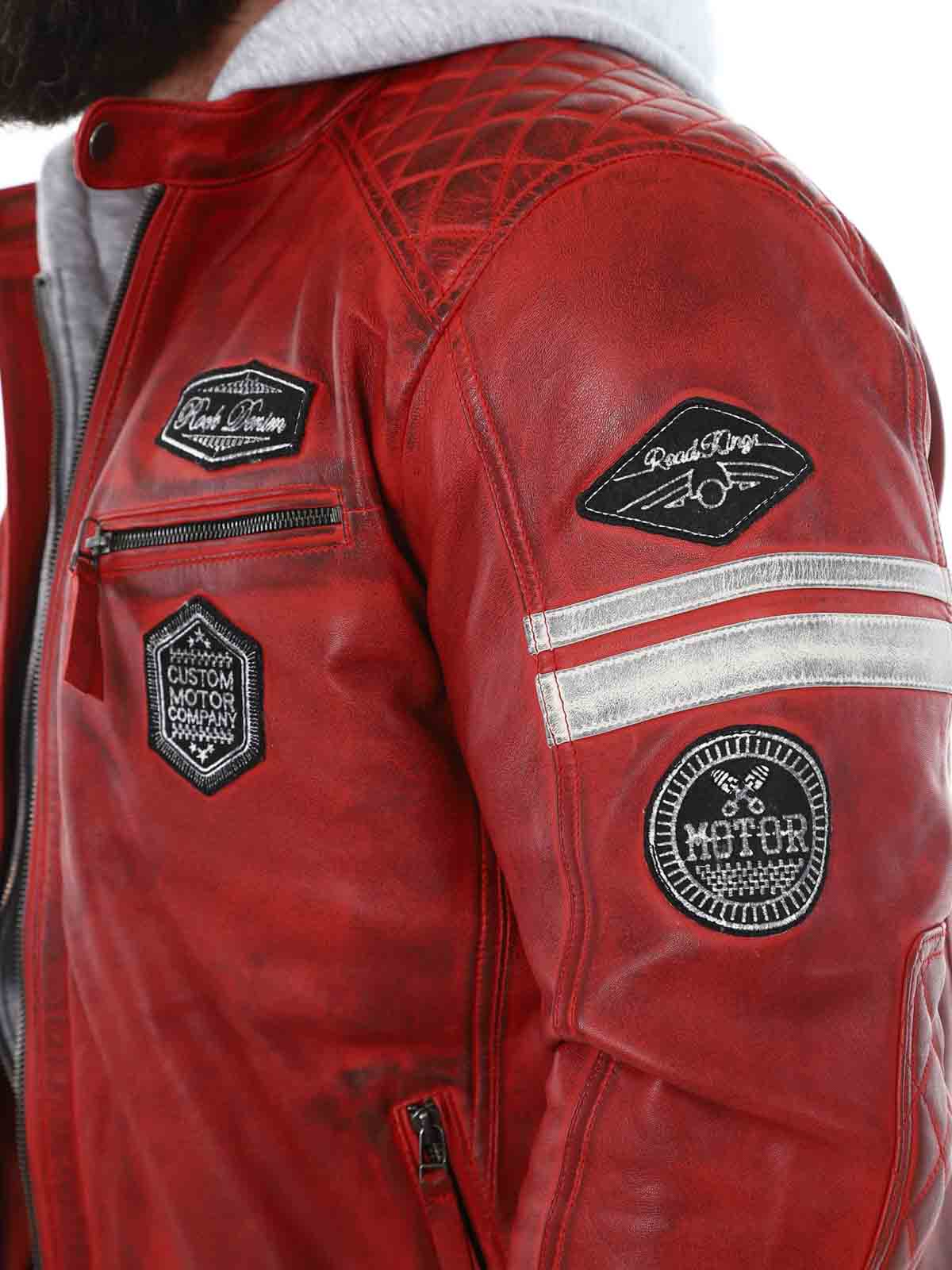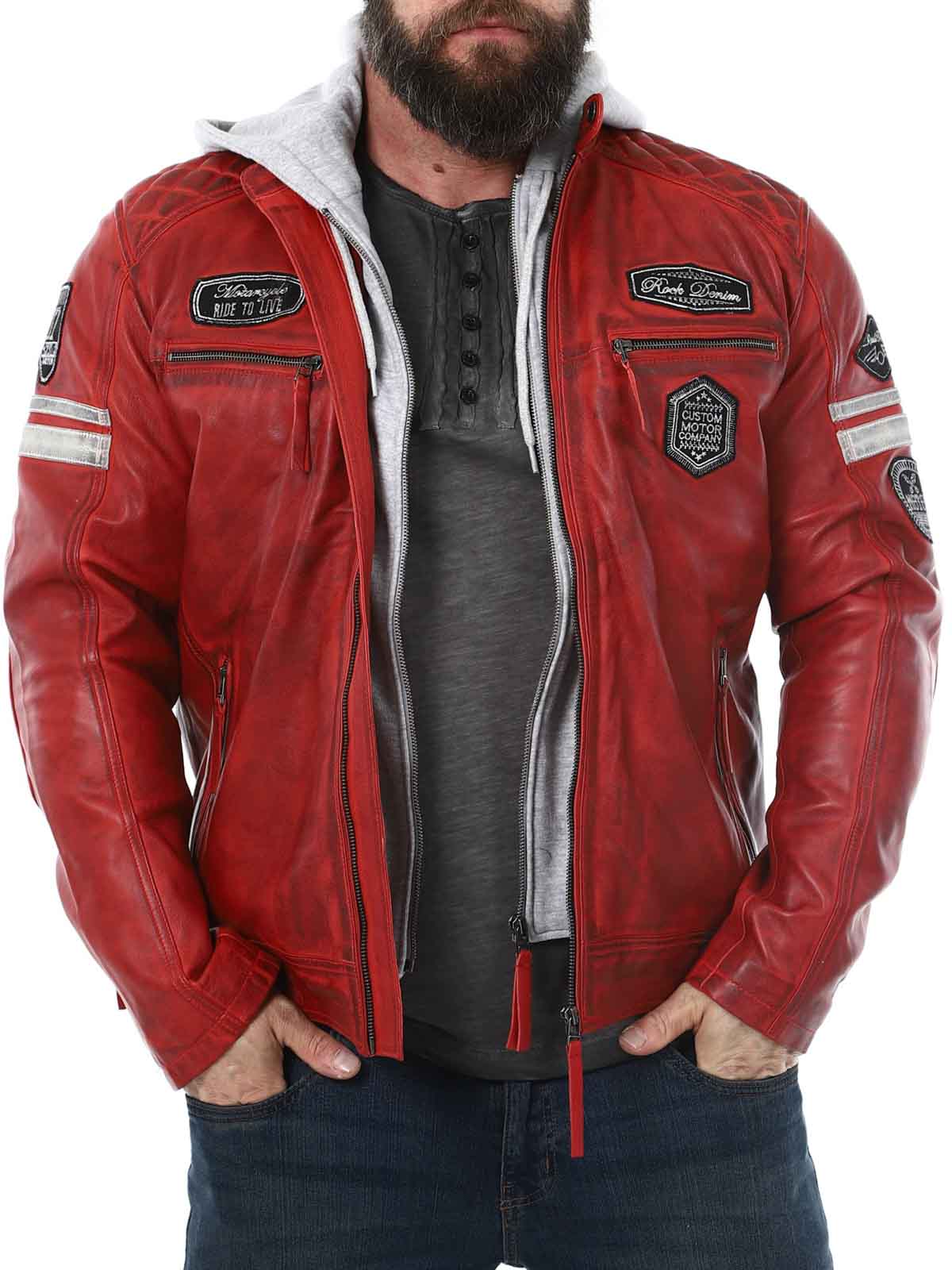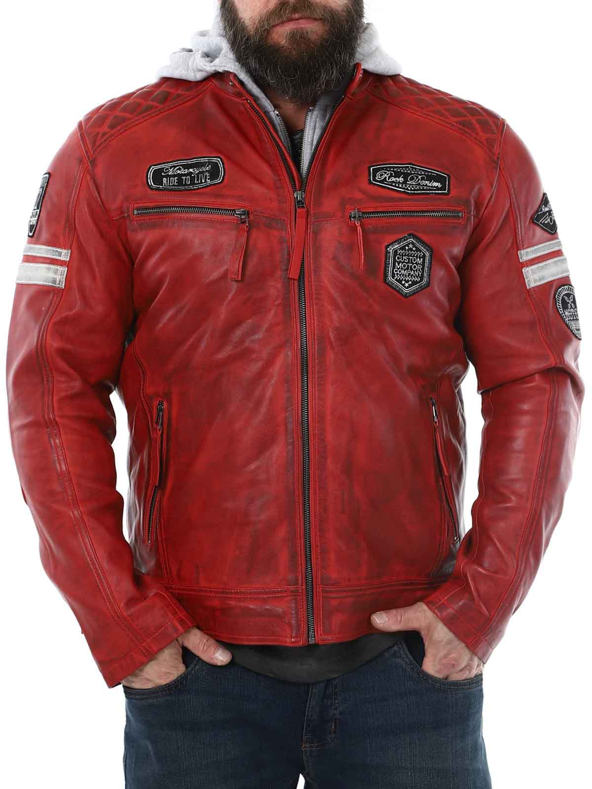 Racing-inspired jacket in soft and supple leather. Designed with fabric patches and a removable hood made of sweatshirt material. Features four front zippered pockets, two inner pockets, and adjustable sleeve cuffs. A stylish jacket available only at RockDenim!