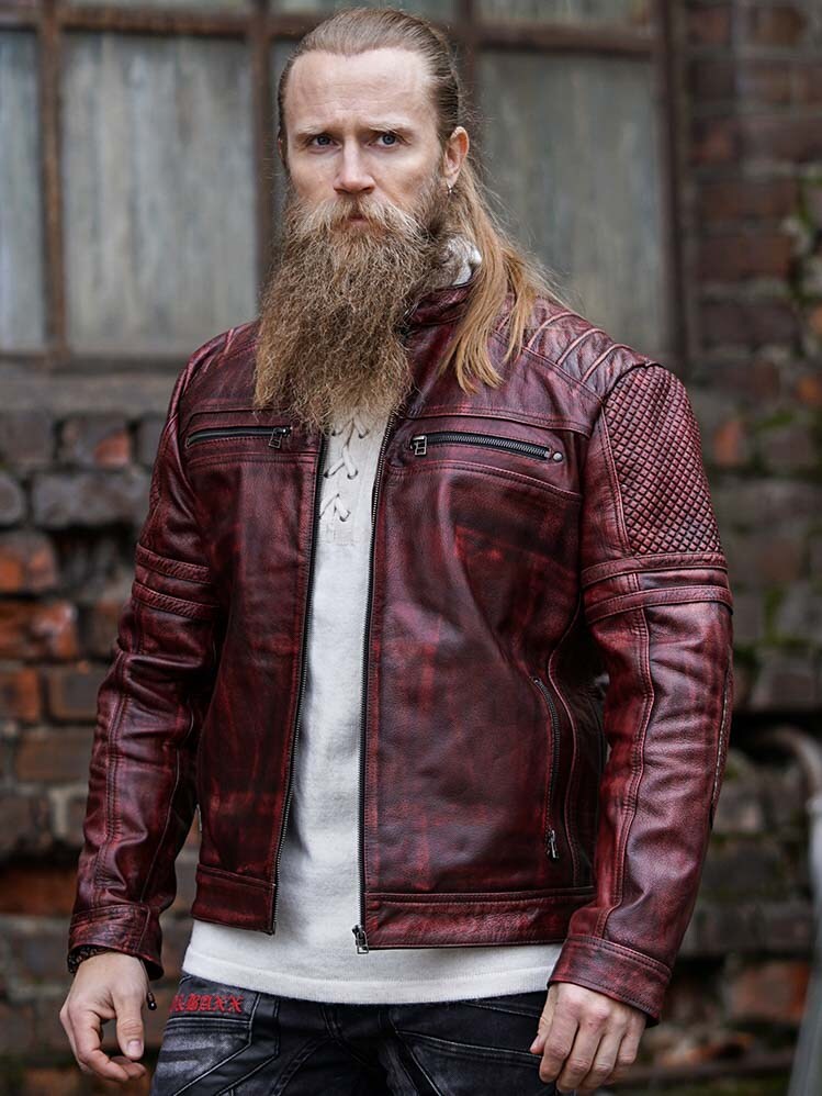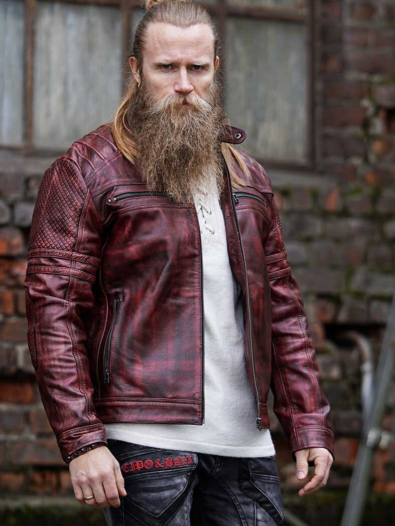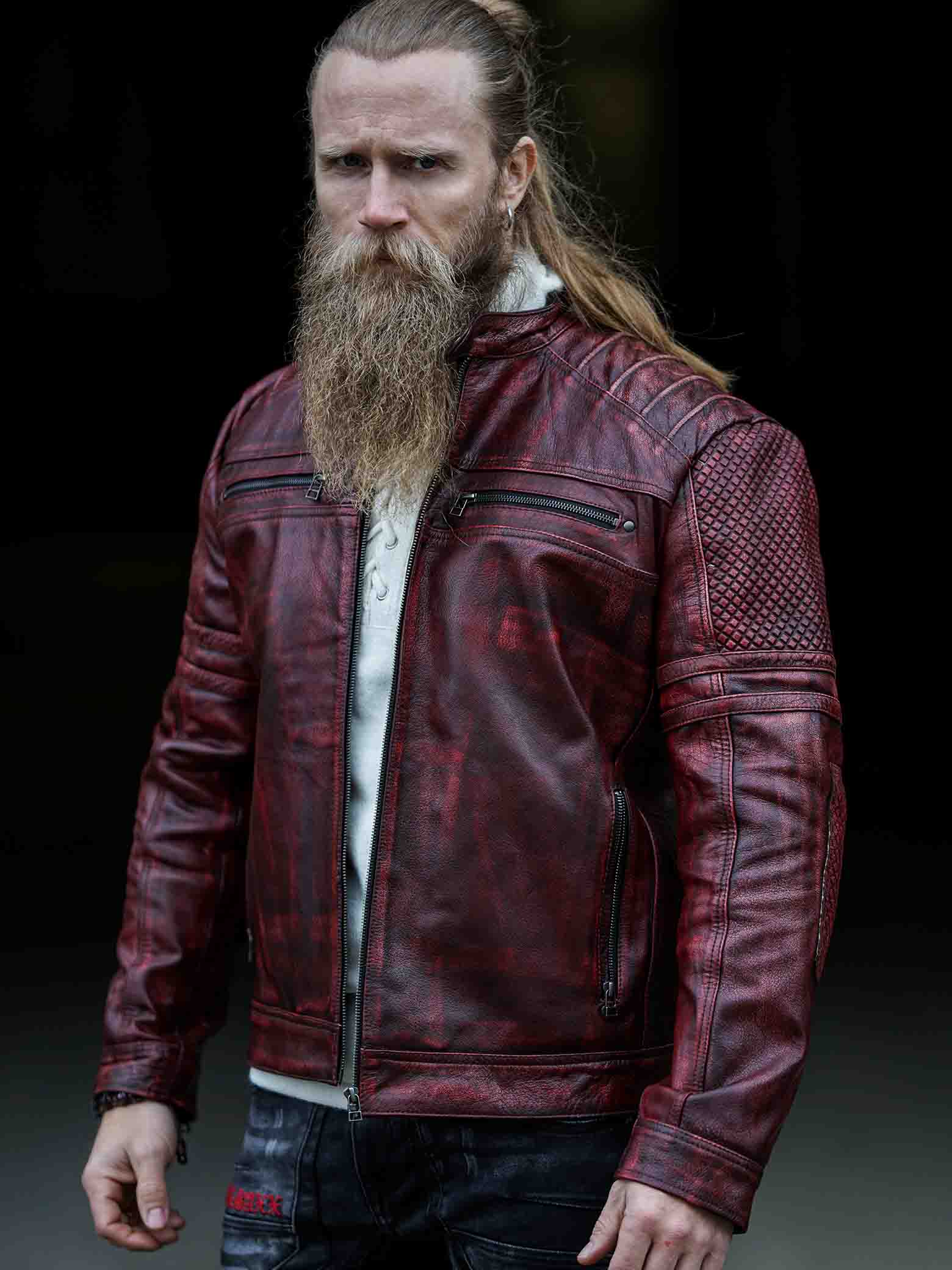 Heavy jacket in buffalo leather. It features stylish details and four front zippered pockets, as well as two inner pockets.