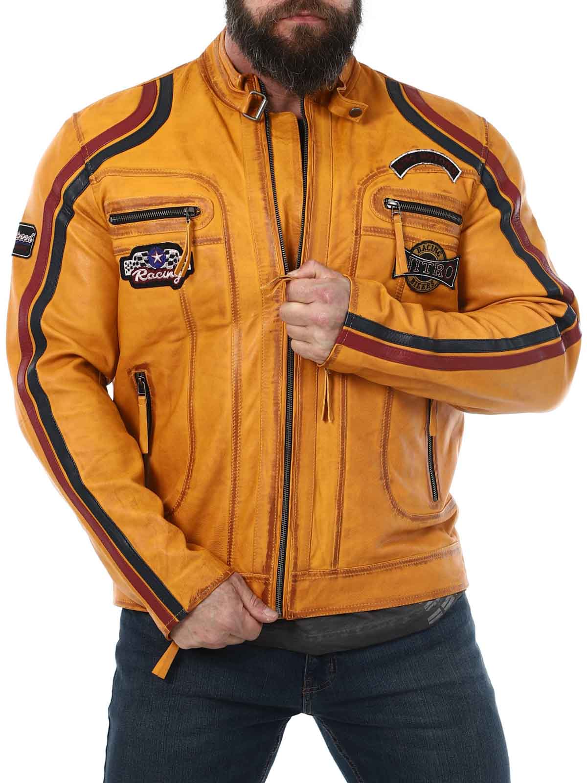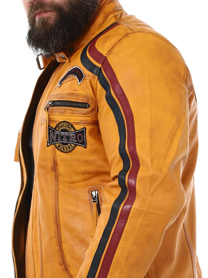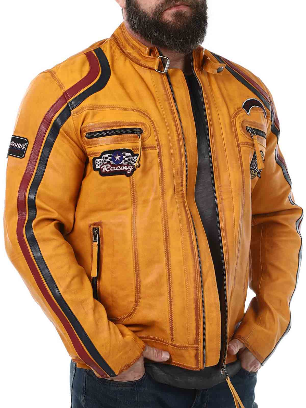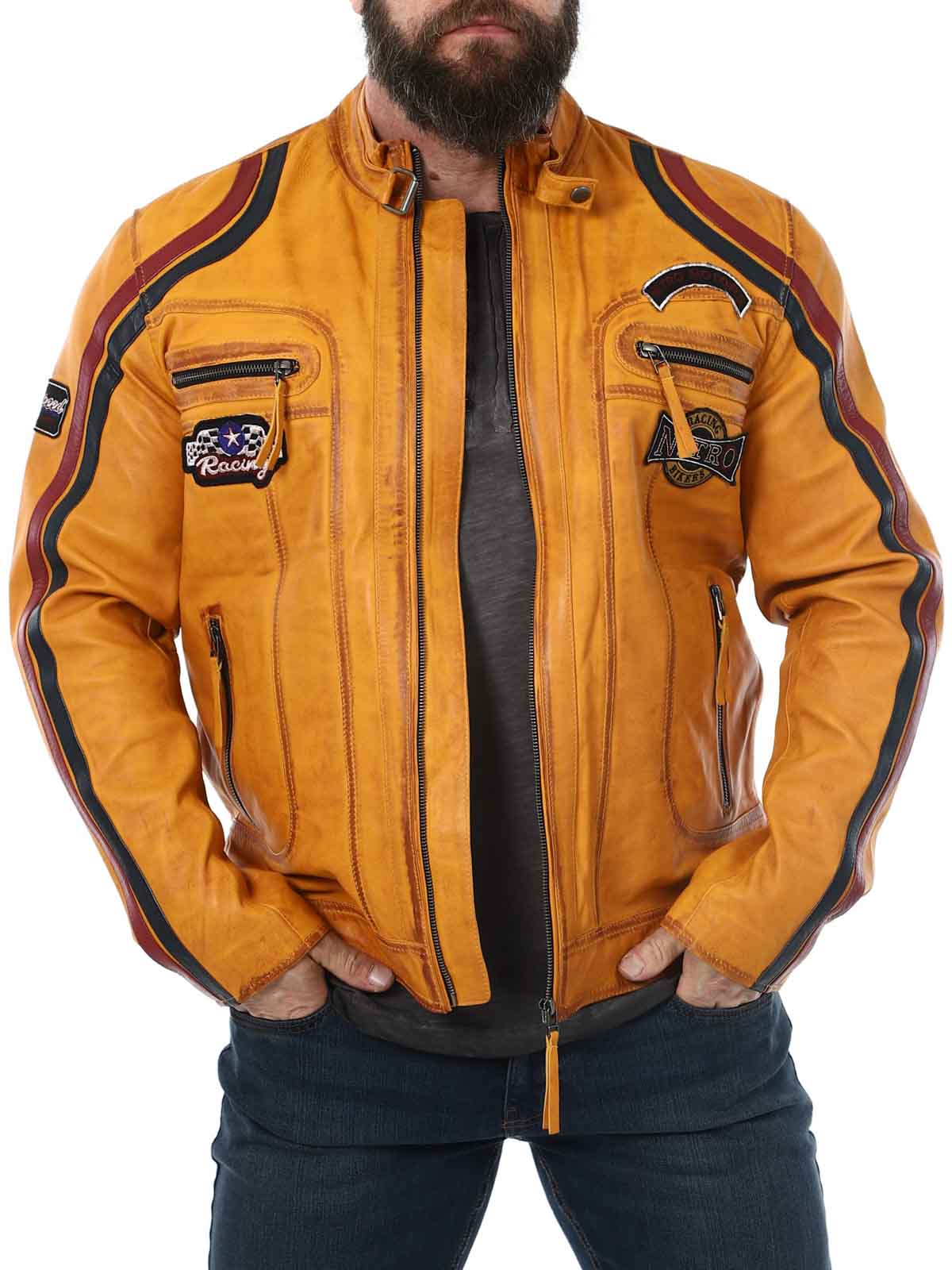 Jacket with fabric patches and stripes for a stylish racing look. Made from soft and supple leather. It has four front zip pockets, two inner pockets and adjustable cuffs. A bold jacket only available at RockDenim!