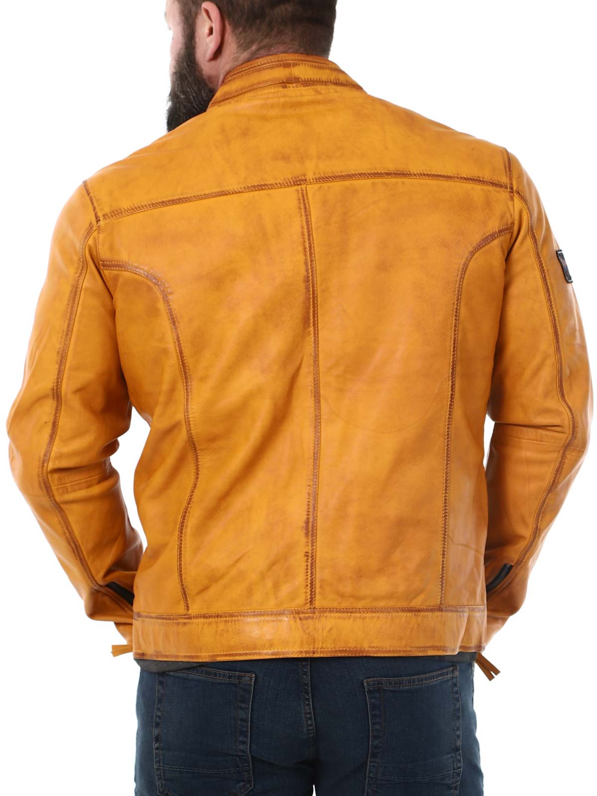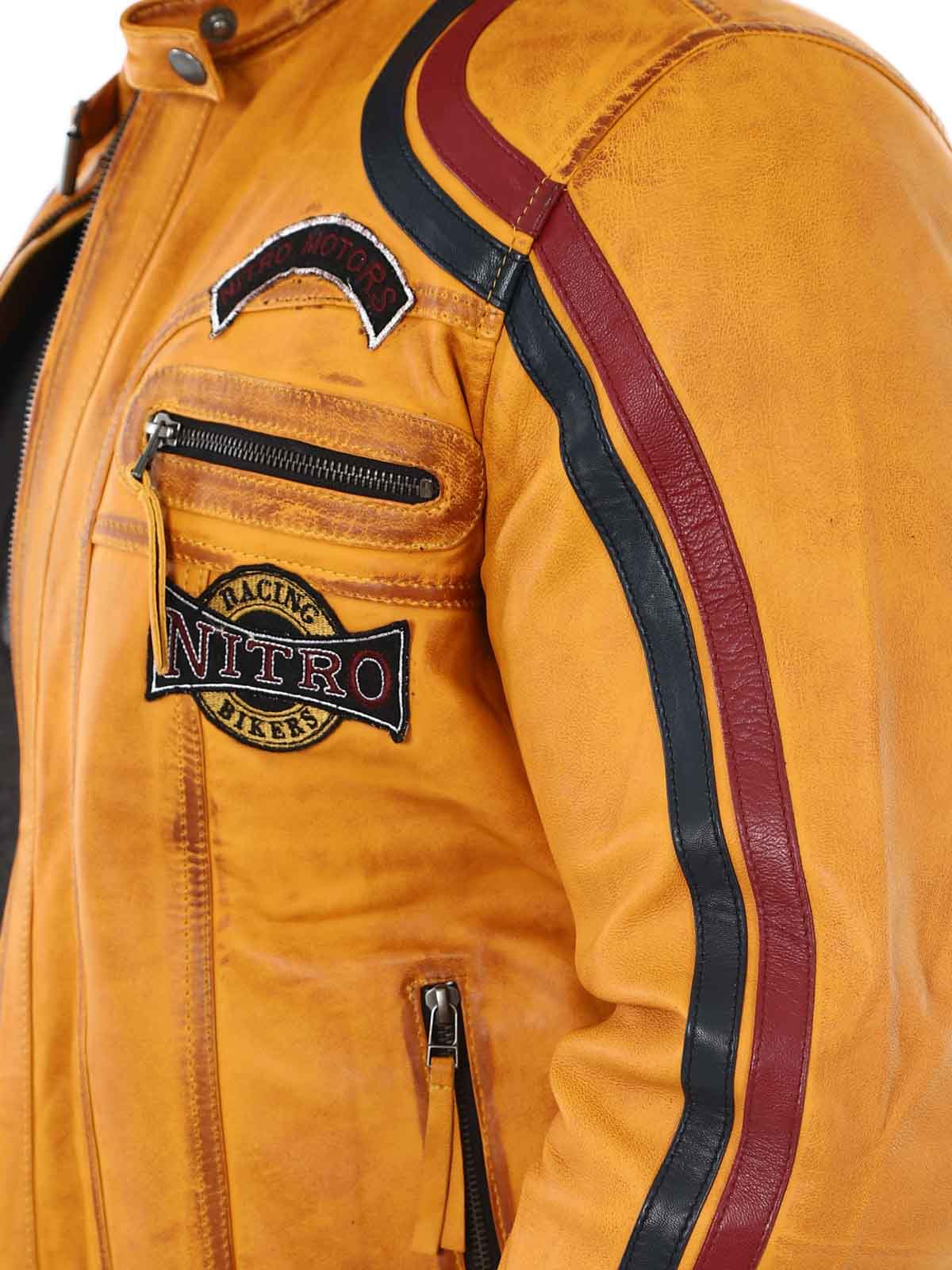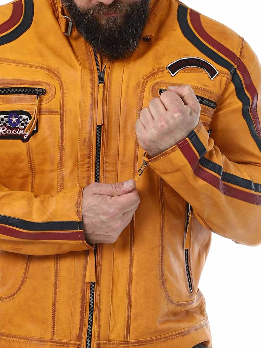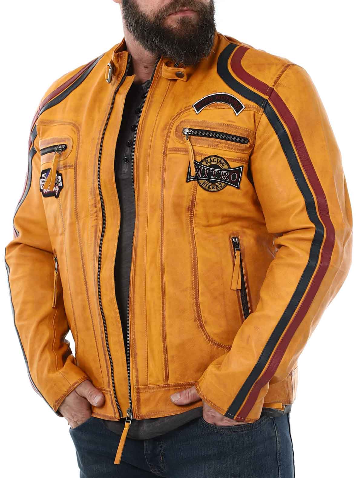 Jacket with fabric patches and stripes for a stylish racing look. Made from soft and supple leather. It has four front zip pockets, two inner pockets and adjustable cuffs. A bold jacket only available at RockDenim!