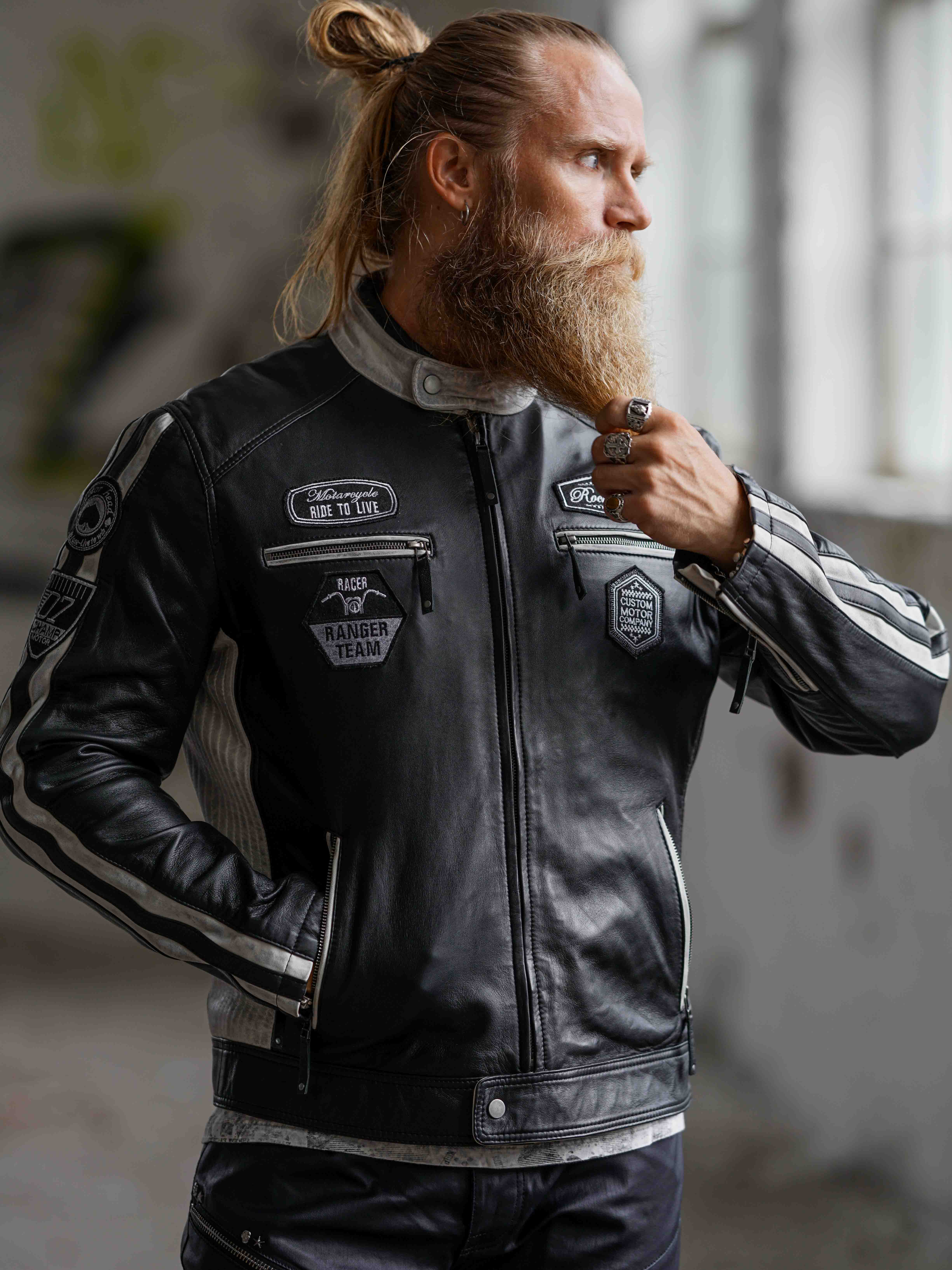 Comfortable leather jacket with a bold design featuring patches and white stripes. It closes with a sturdy zipper and can also be fastened with snaps at the neck and hem. The jacket has four zippered front pockets and two pockets in the quilted lining. The sleeve cuffs can be adjusted!
