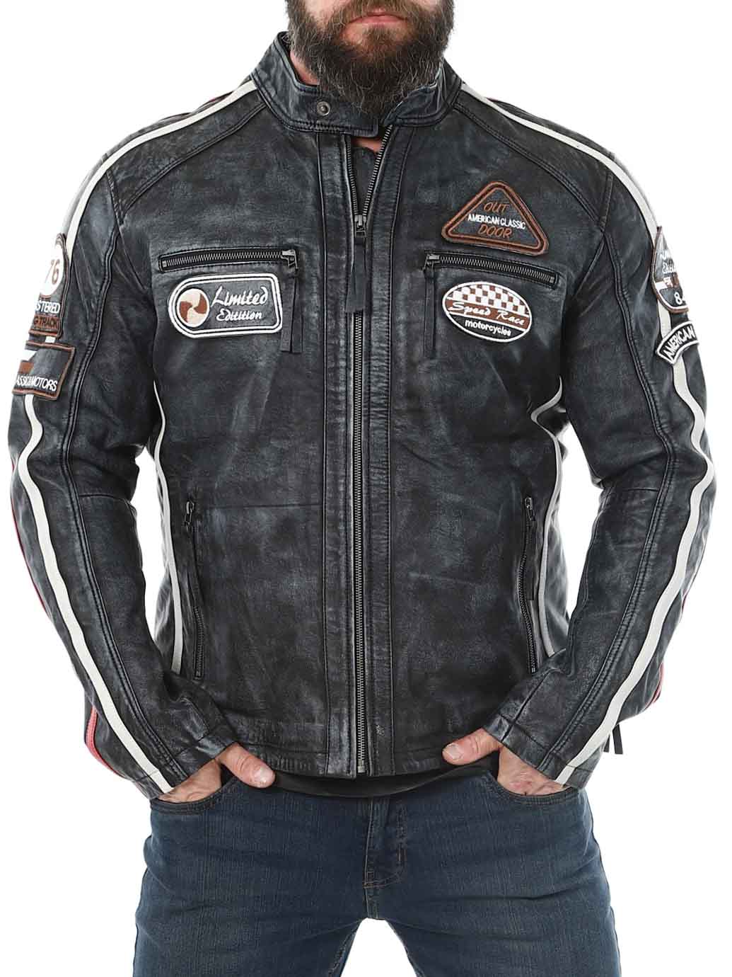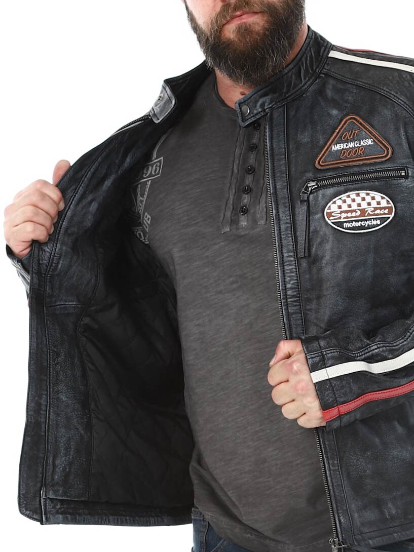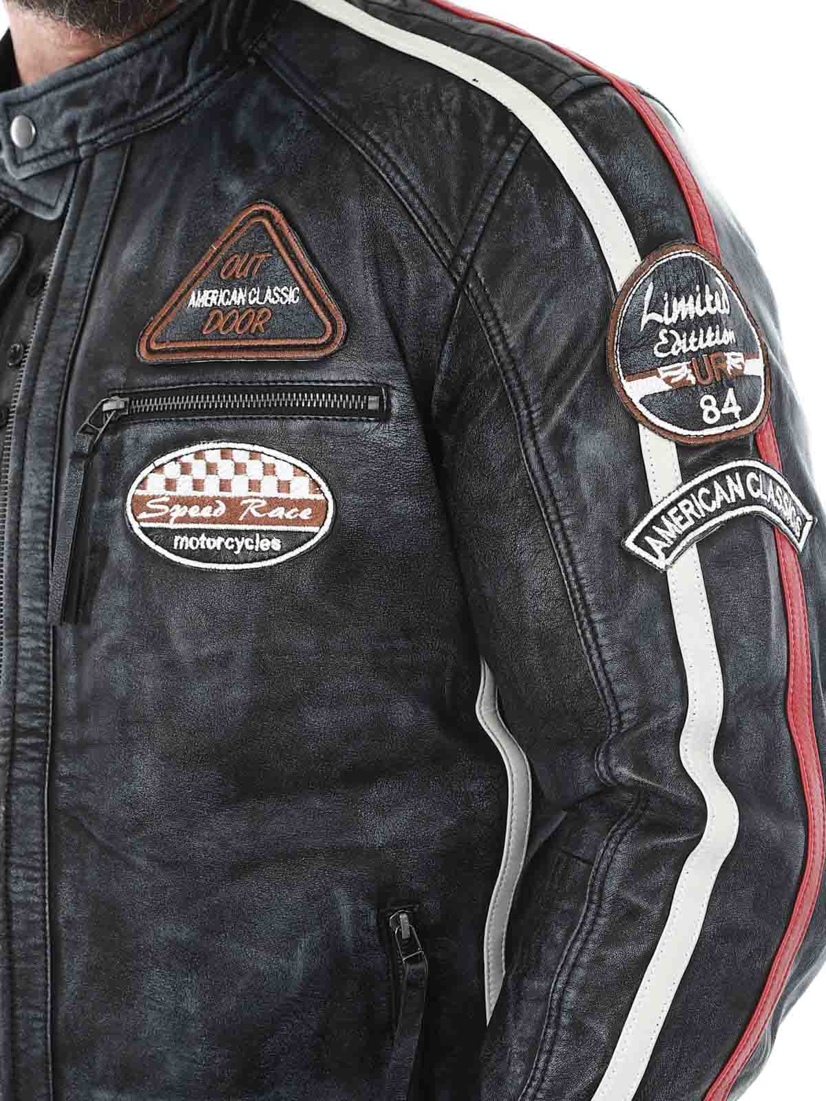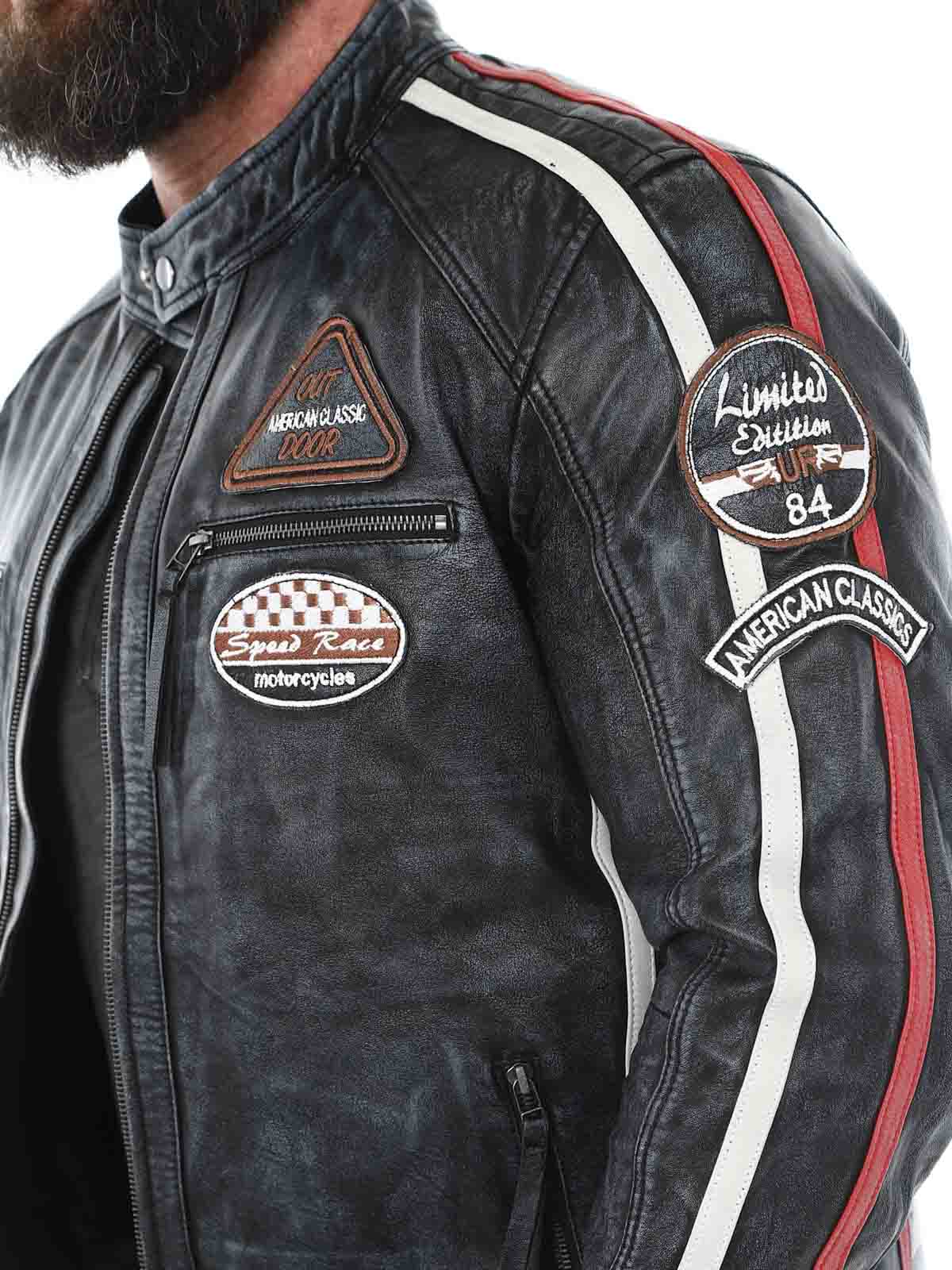 Racing inspired jacket with fabric patches and stripes. Made of soft and supple leather with a vintage look. It has four front zippered pockets, two inner pockets and adjustable cuffs. This jacket is only available at RockDenim!