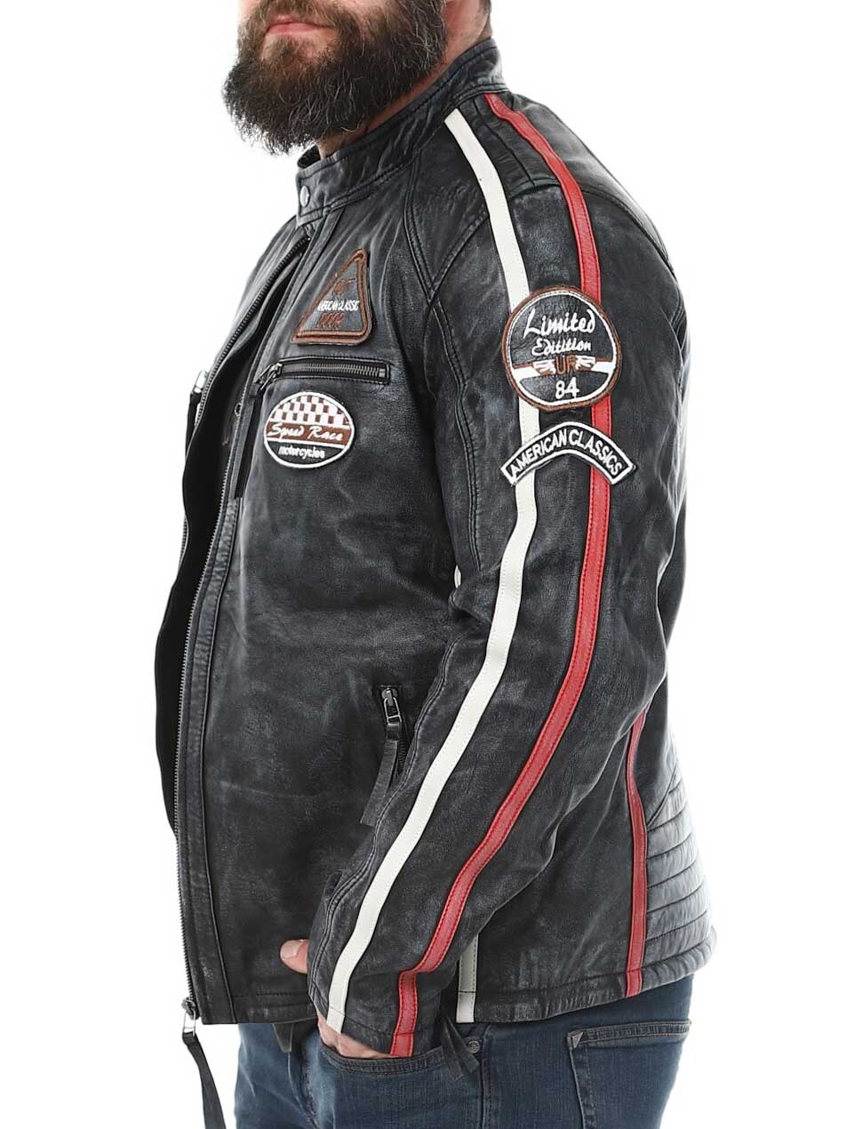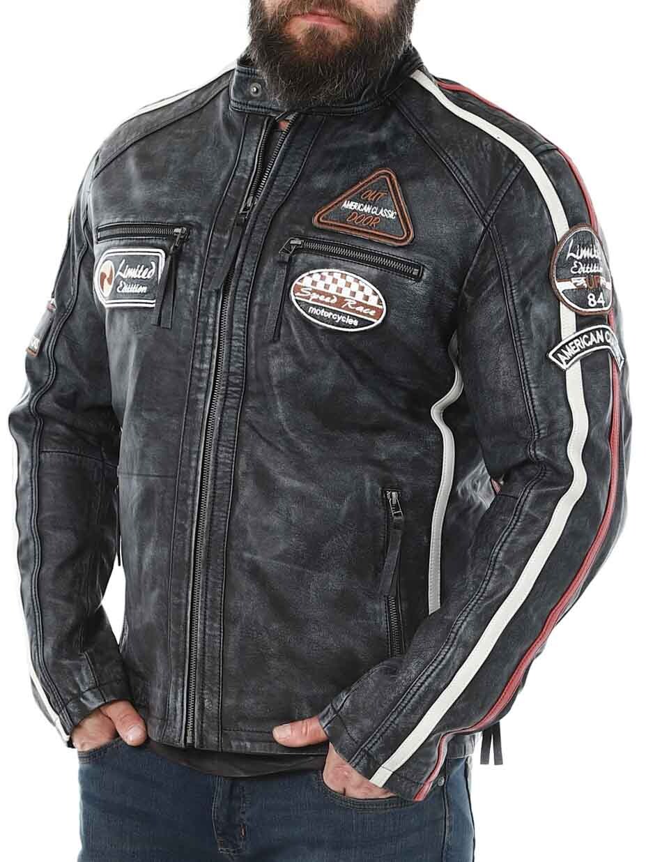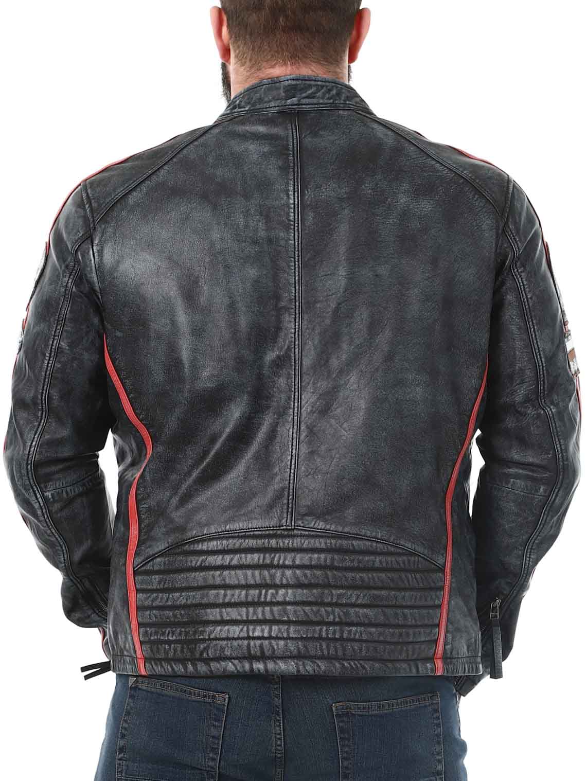 Racing inspired jacket with fabric patches and stripes. Made of soft and supple leather with a vintage look. It has four front zippered pockets, two inner pockets and adjustable cuffs. This jacket is only available at RockDenim!