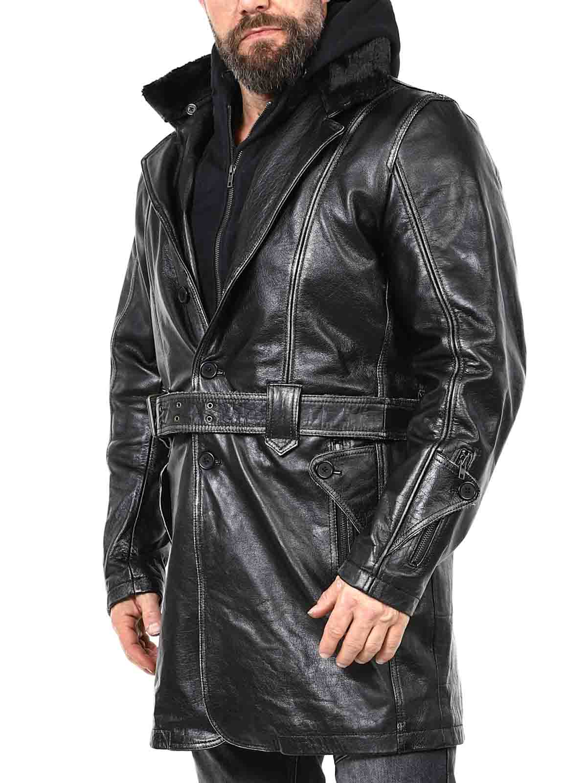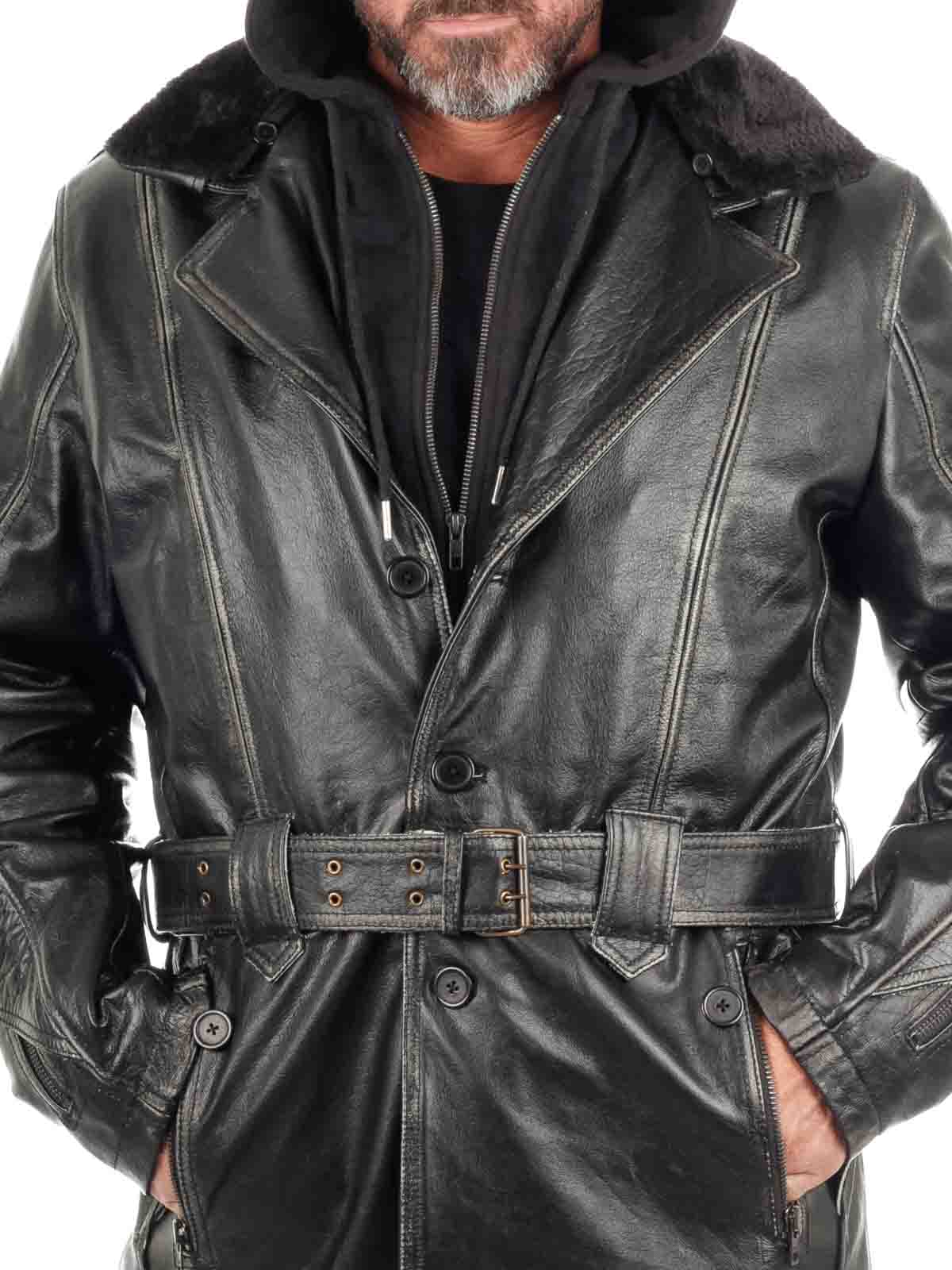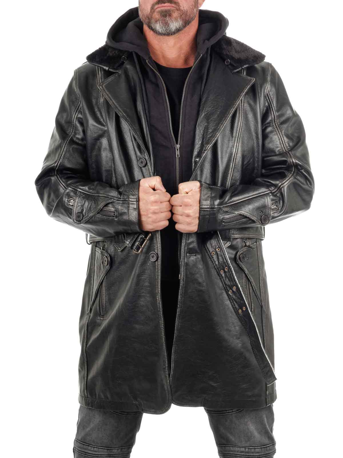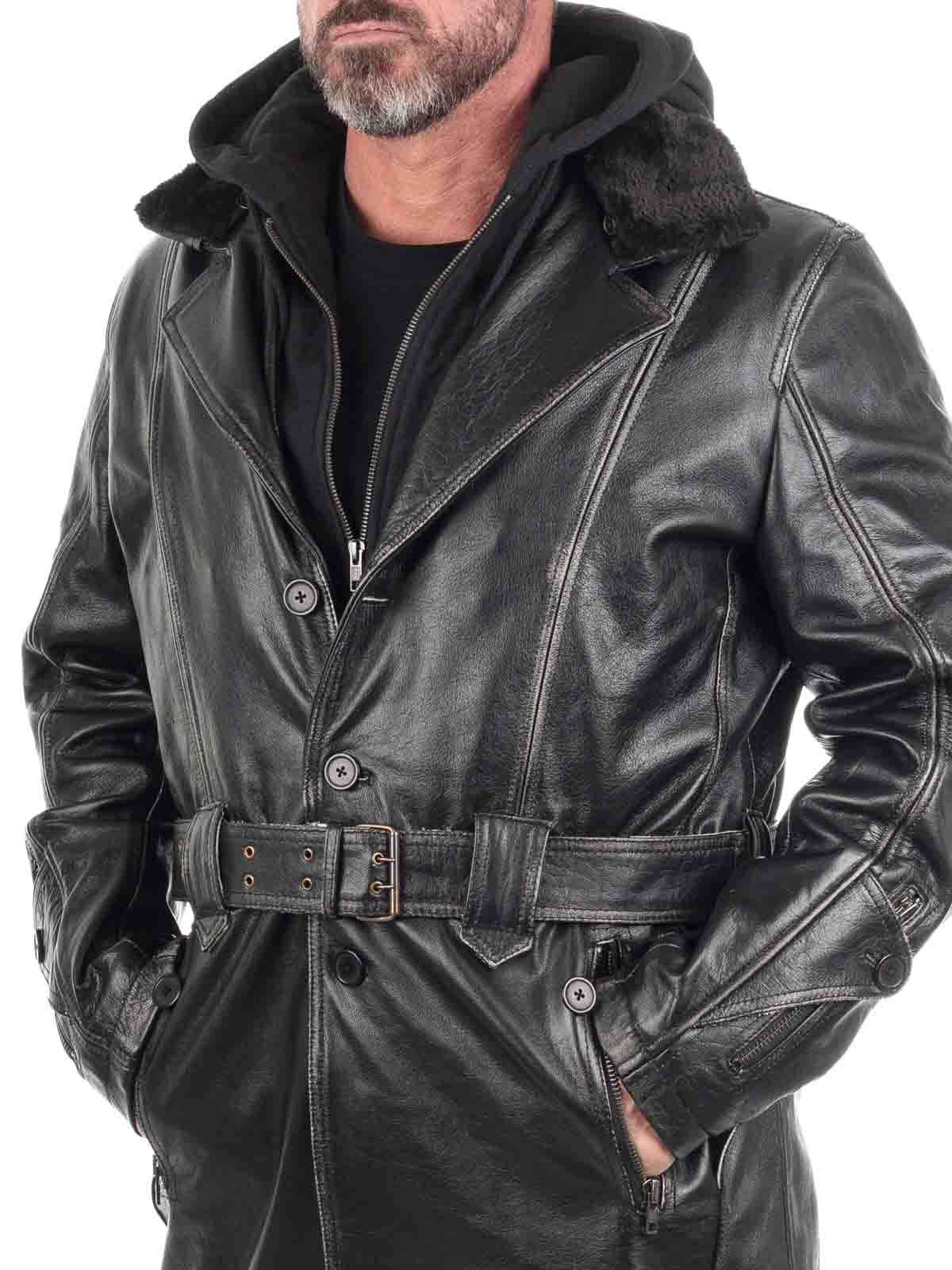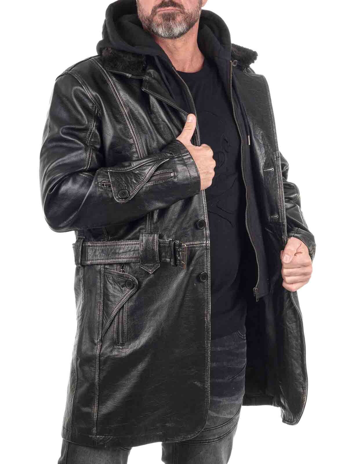 A bold and rugged coat made from genuine buffalo leather – built for the man who values both style and quality. The long cut and heavy-duty leather create a strong, masculine silhouette with attitude. Features a removable sweatshirt insert with hood, allowing you to switch between a raw biker look and a more casual everyday style. Inside, a detachable teddy lining provides warmth on cold days and can be removed when the weather gets milder. Equipped with multiple zippered pockets and practical inner pockets.
