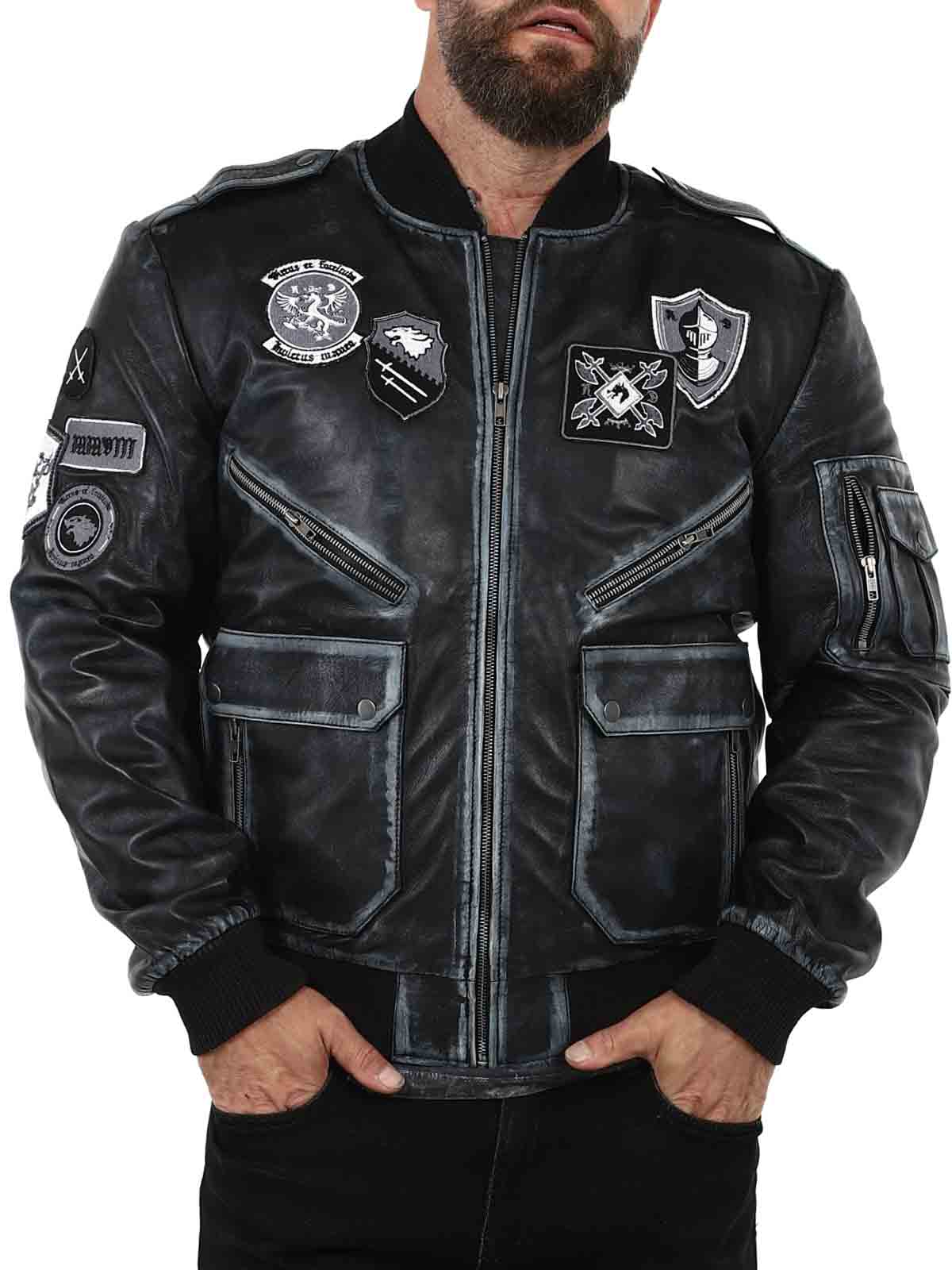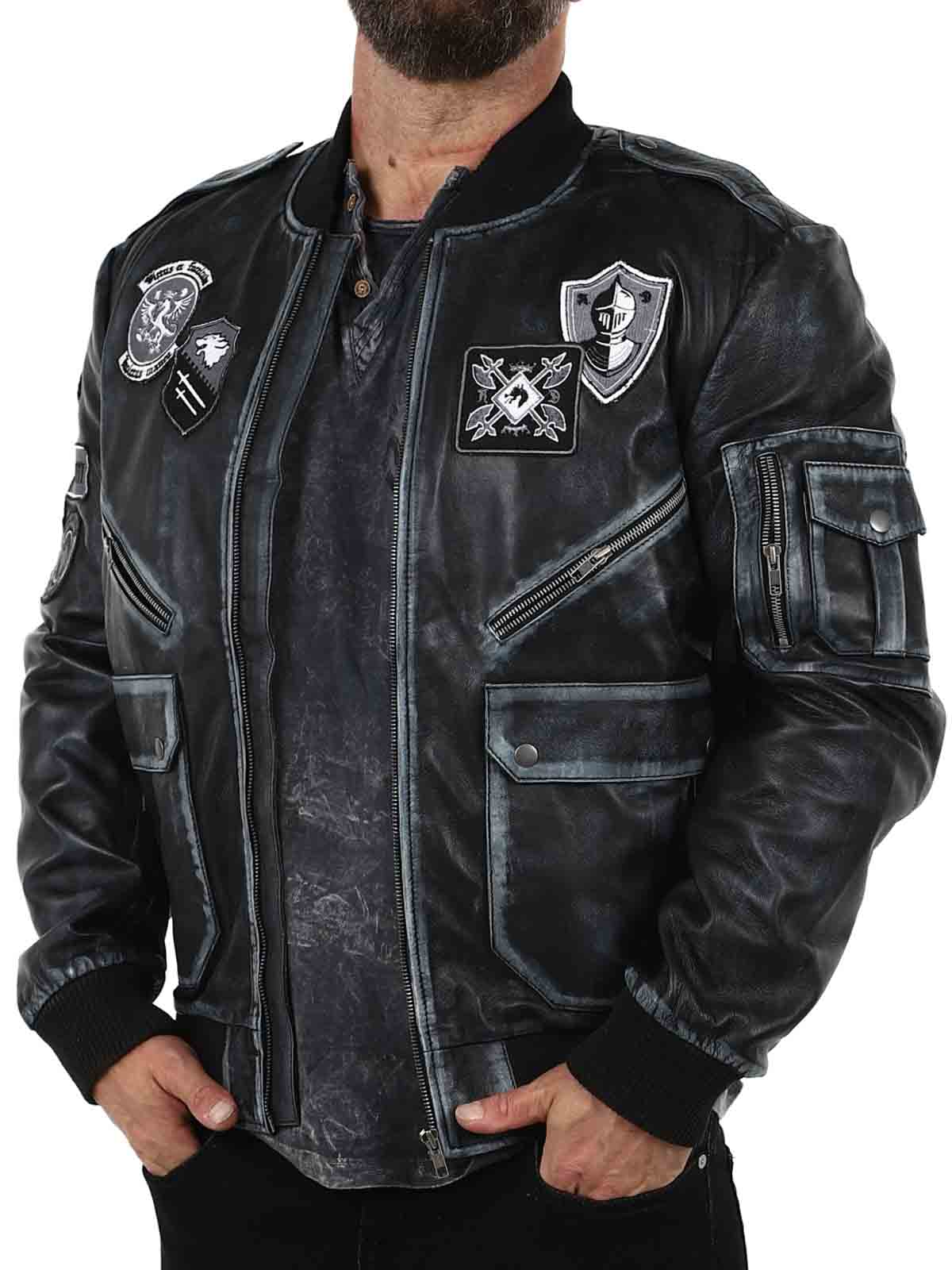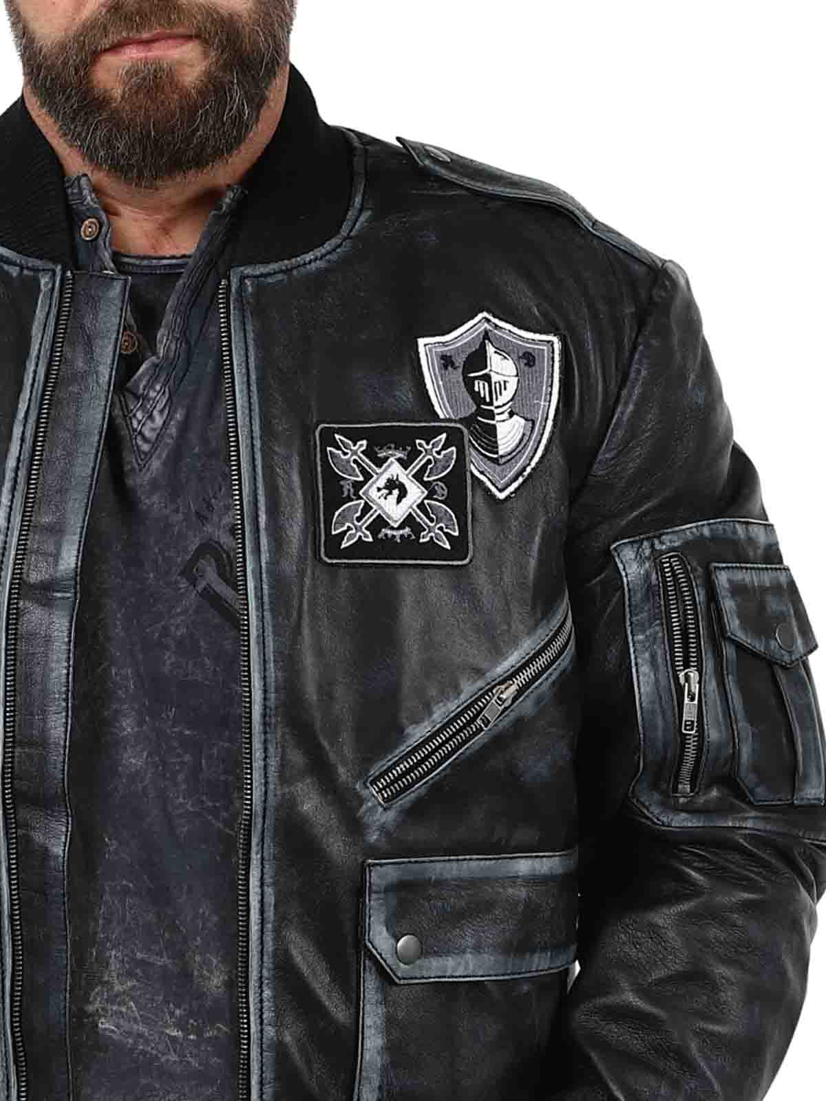 A retro-inspired jacket in a sleek vintage black shade, featuring decorative patches. Made from soft, supple high-quality leather with ribbed trims for an optimal fit. It includes multiple closable pockets that offer both practical function and stylish design. A signature piece created by our own team!