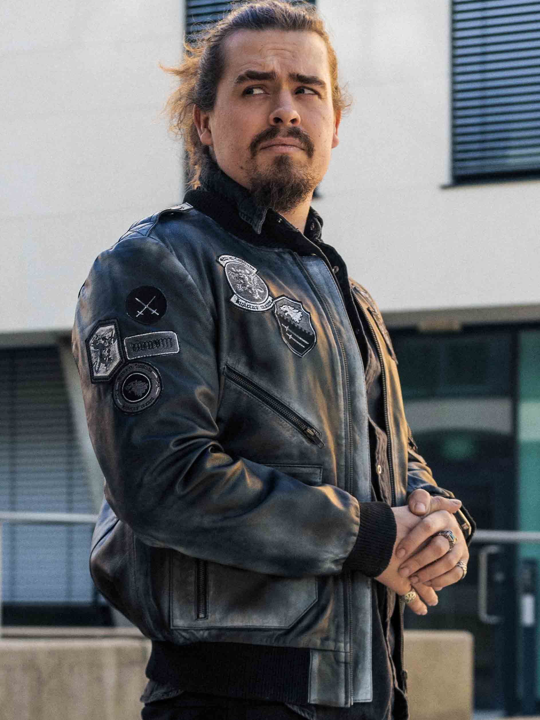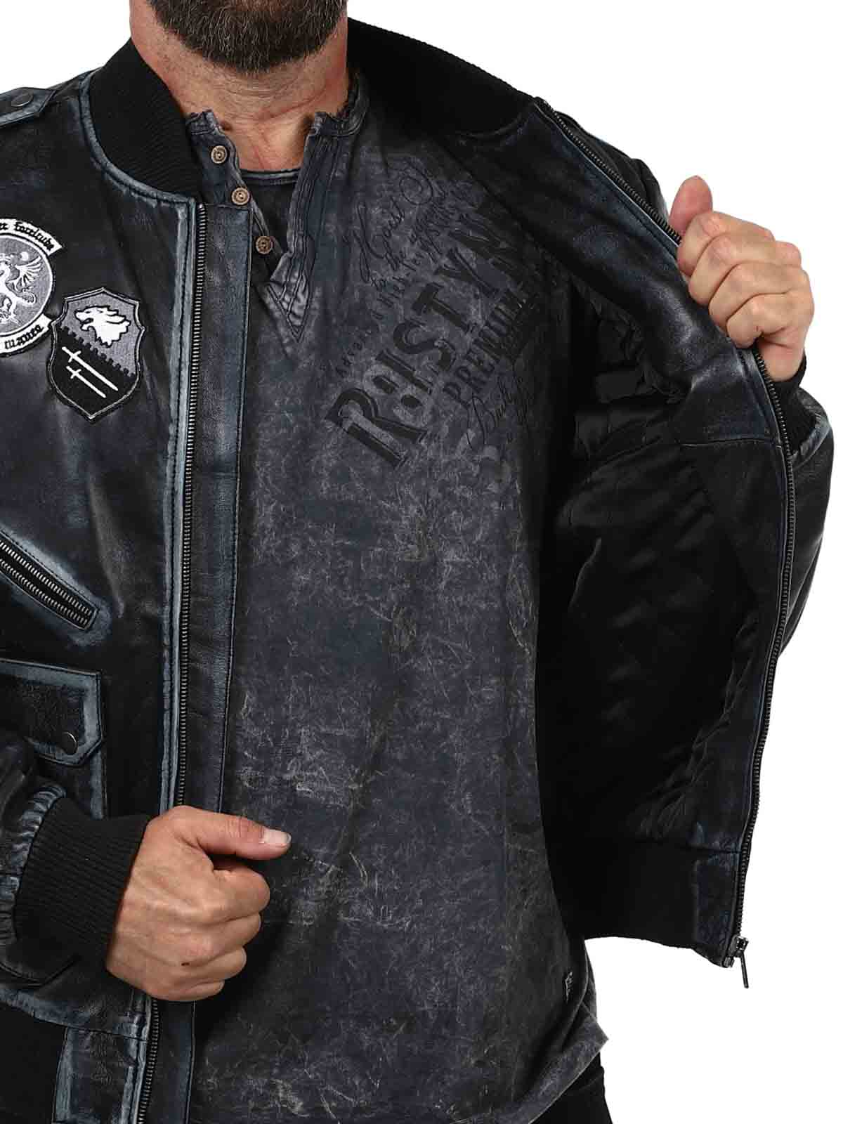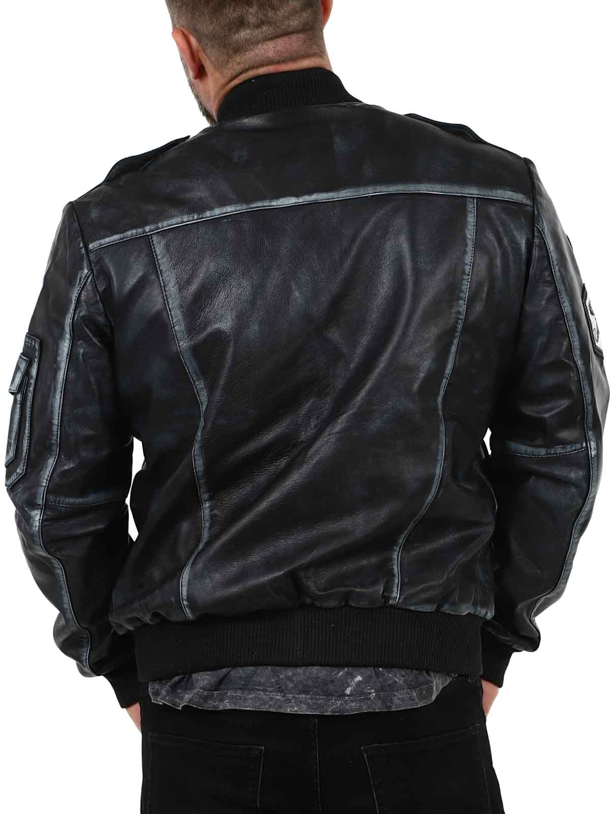 A retro-inspired jacket in a sleek vintage black shade, featuring decorative patches. Made from soft, supple high-quality leather with ribbed trims for an optimal fit. It includes multiple closable pockets that offer both practical function and stylish design. A signature piece created by our own team!