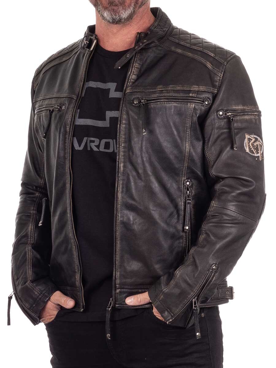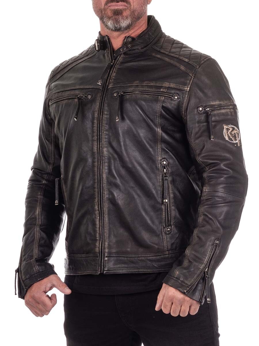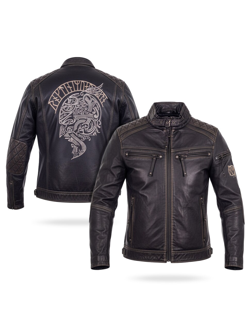 Tough jacket made of genuine leather with a worn vintage look and embroidered Viking motifs that give it a unique character. Designed with padded sections, adjustable cuffs and waistband for optimal fit. Four closable front pockets and two practical inner pockets. This jacket has been created exclusively for our customers and is available only at RockDenim!