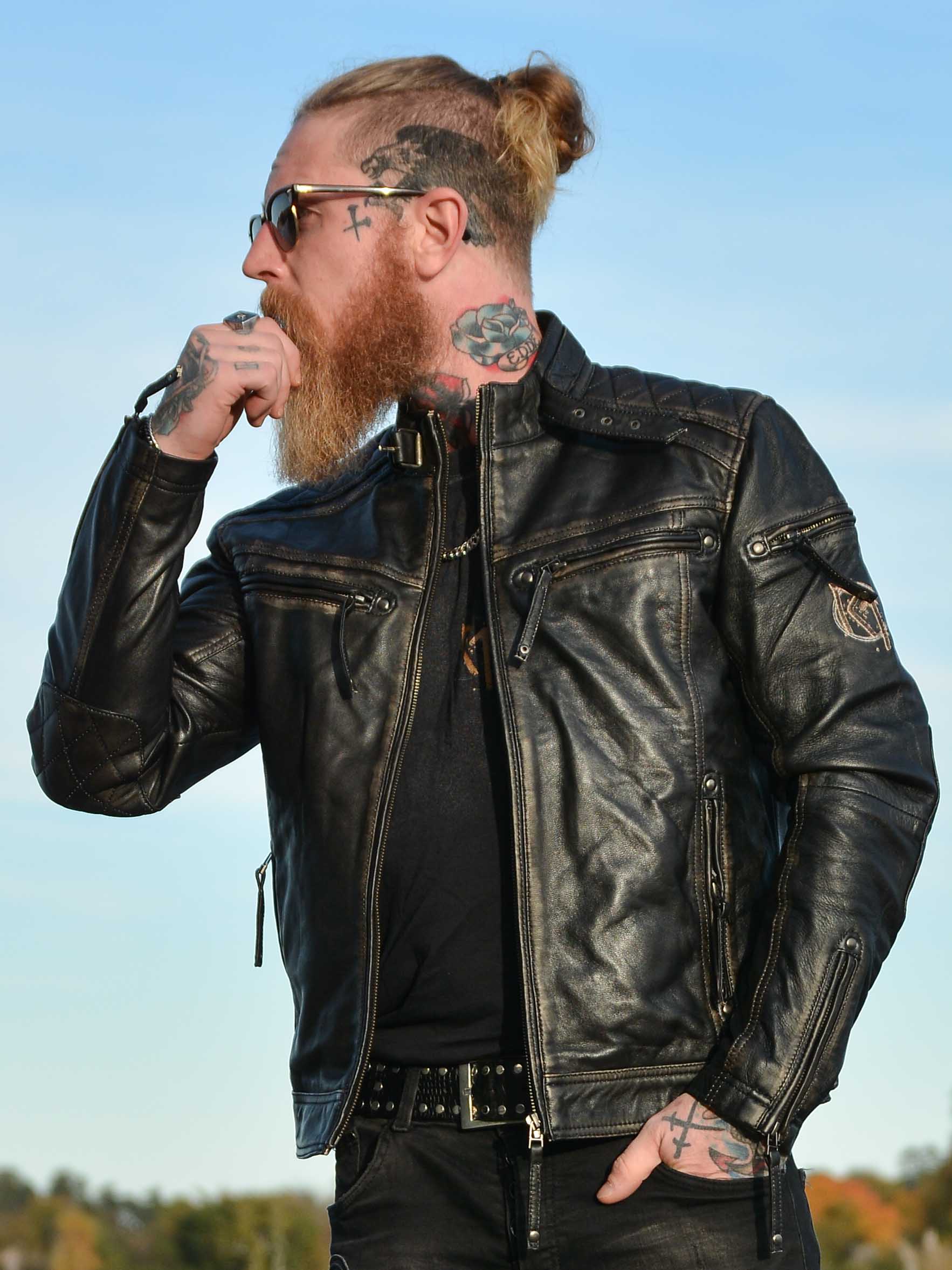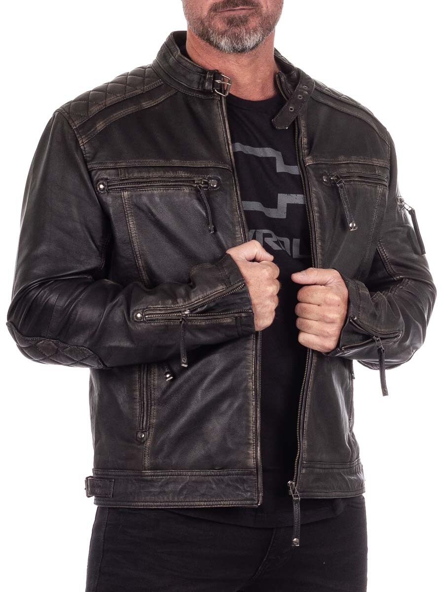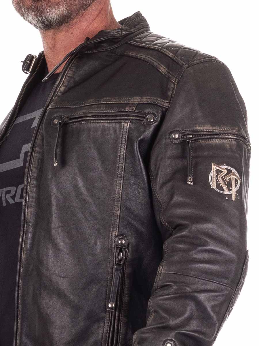 Tough jacket made of genuine leather with a worn vintage look and embroidered Viking motifs that give it a unique character. Designed with padded sections, adjustable cuffs and waistband for optimal fit. Four closable front pockets and two practical inner pockets. This jacket has been created exclusively for our customers and is available only at RockDenim!