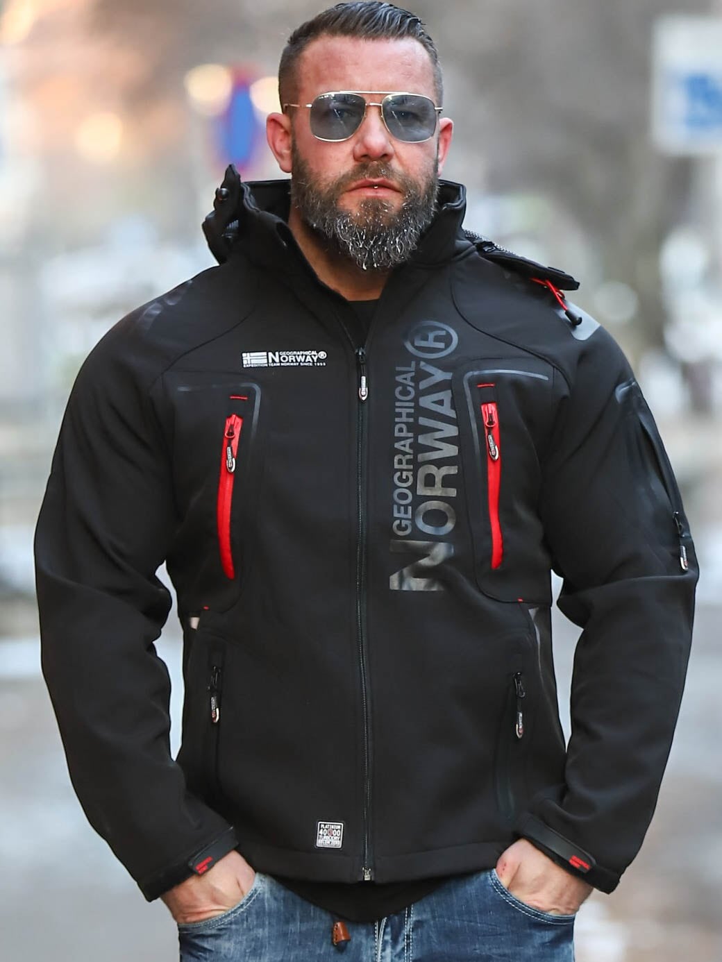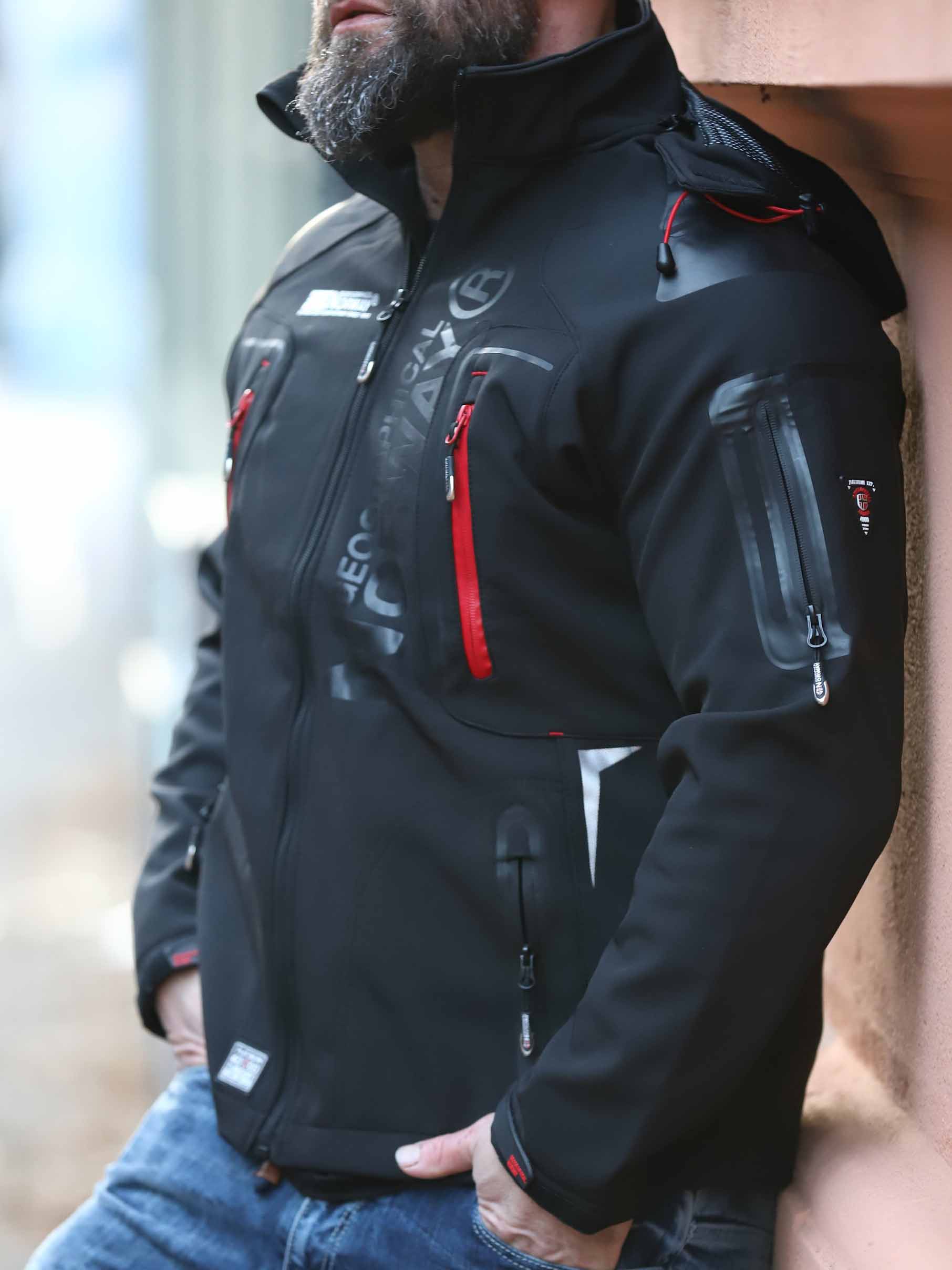 A versatile jacket suitable for all activities requiring windproof and water-resistant material. Thin fleece lining, taped seams, and plenty of pockets make the jacket practical and perfect for spring/summer/autumn. It features a black design with patches and text prints in contrasting colors, four closable front pockets, two inner pockets with zippers, and a detachable hood.