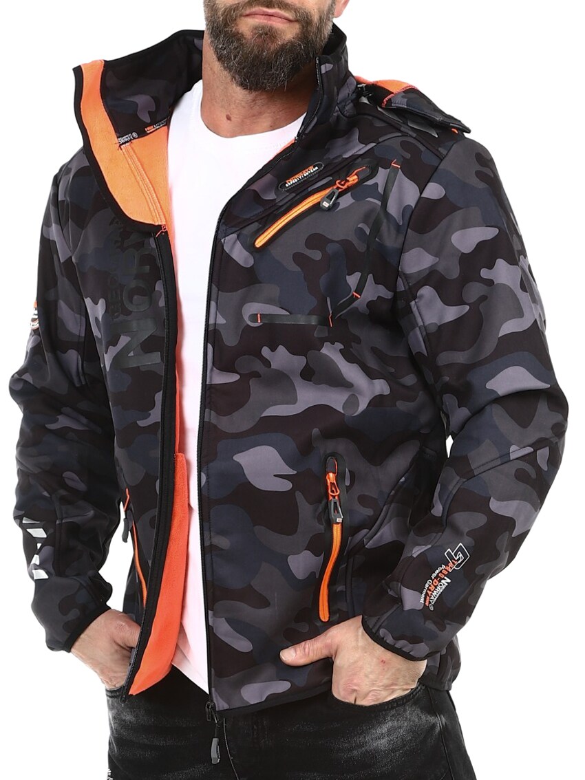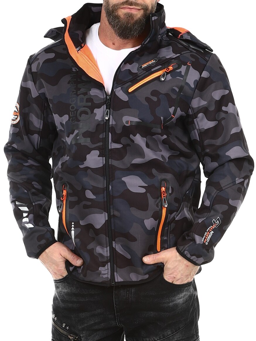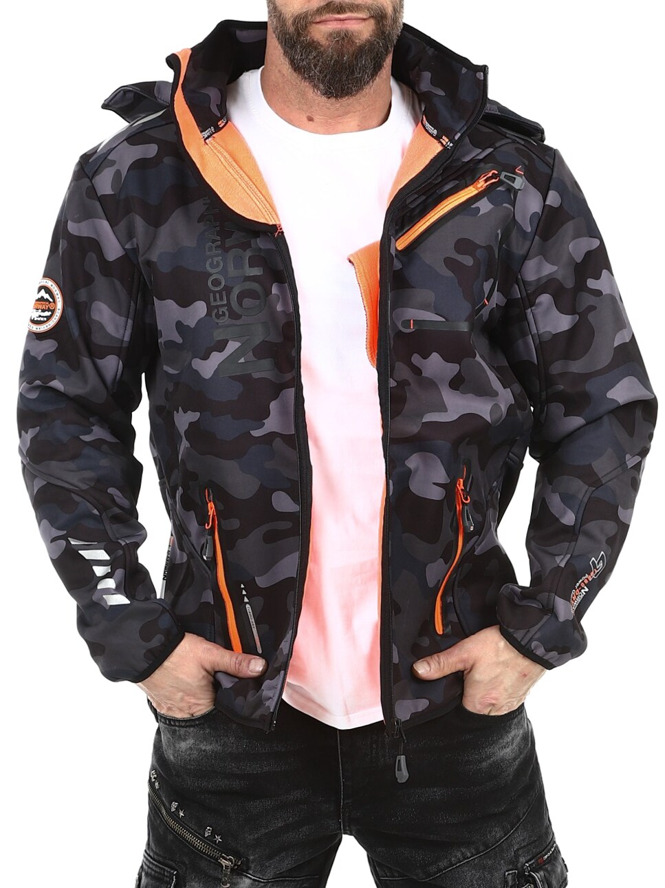 Windproof and water-repellent jacket, perfect for spring, summer, and autumn. Features a thin fleece lining, taped seams, and a detachable hood adjustable with a drawstring. Designed with patches, reflective details, and text print. Equipped with three zippered front pockets.