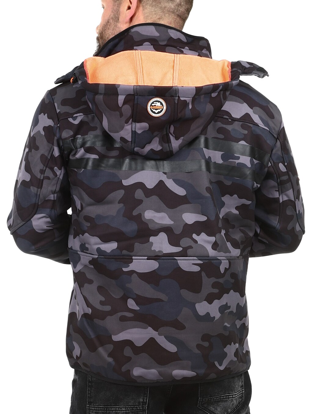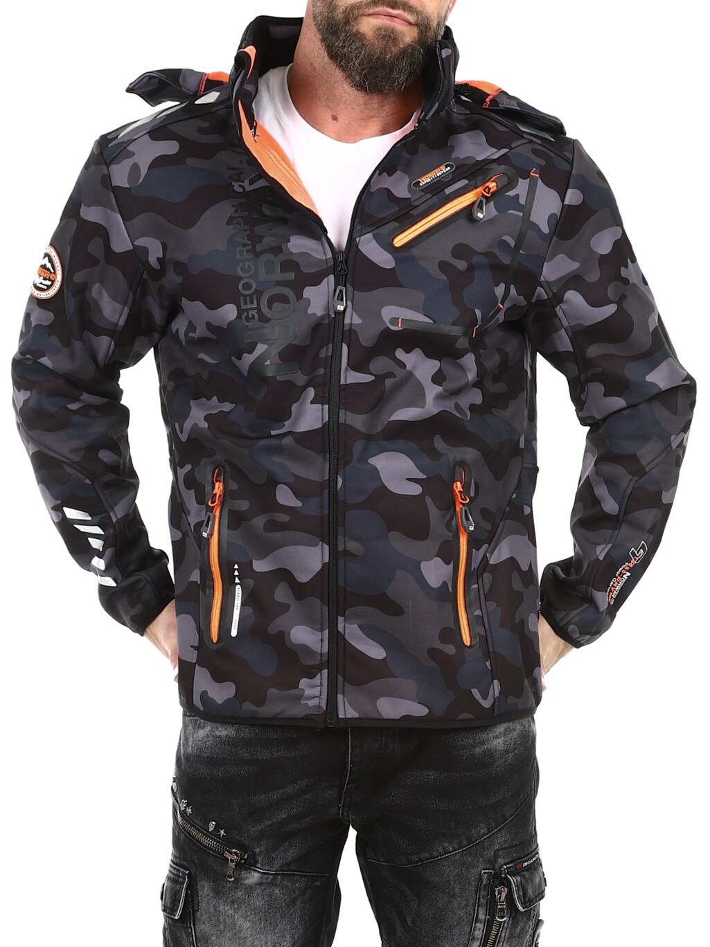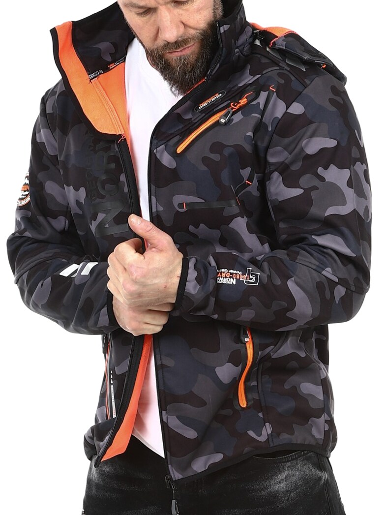 Windproof and water-repellent jacket, perfect for spring, summer, and autumn. Features a thin fleece lining, taped seams, and a detachable hood adjustable with a drawstring. Designed with patches, reflective details, and text print. Equipped with three zippered front pockets.