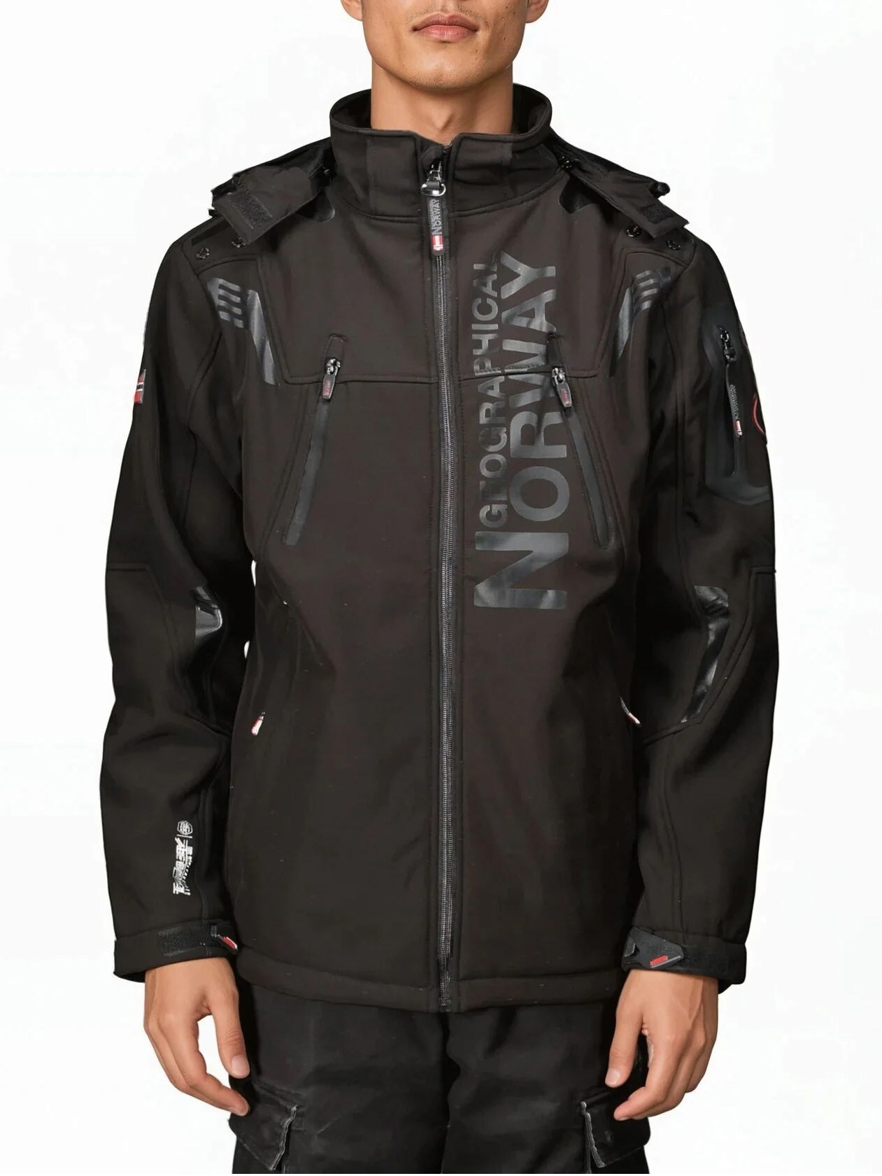 Functional and sporty softshell jacket designed for both comfort and style. The jacket features a windproof and water-repellent exterior and a soft fleece lining that keeps you warm on chilly days. Equipped with multiple practical zip pockets, an adjustable hood, and detailed logo prints for a modern look.