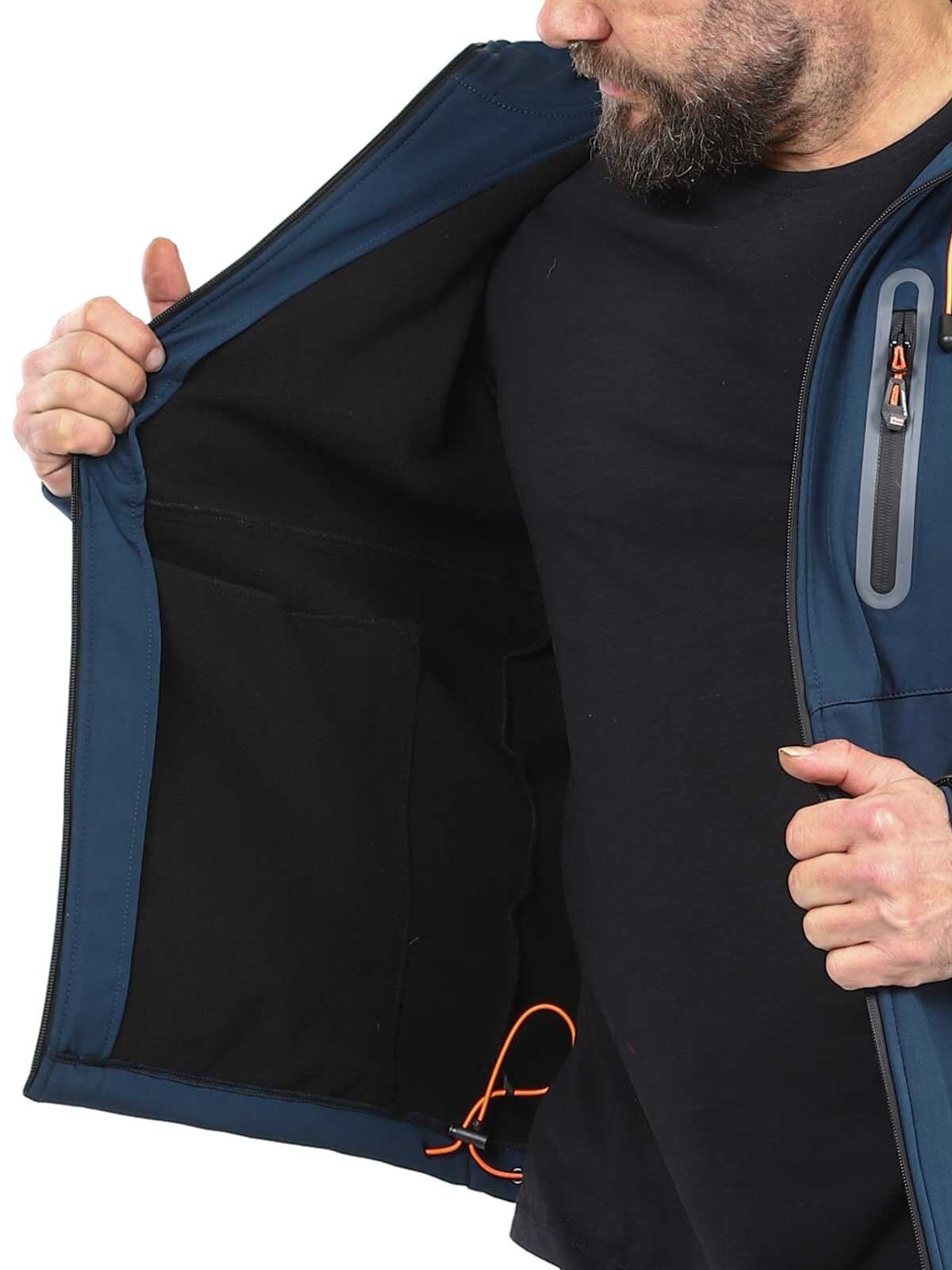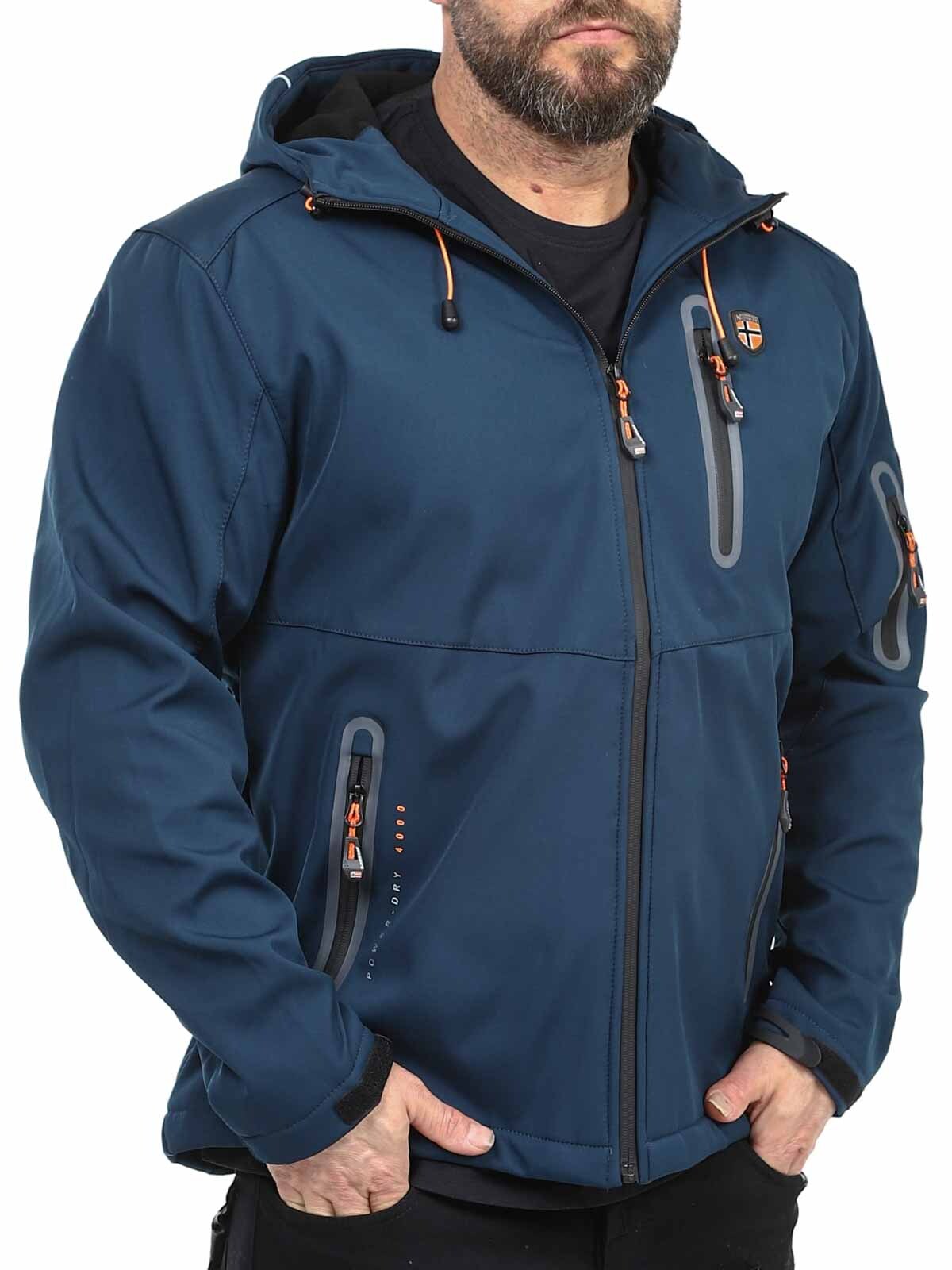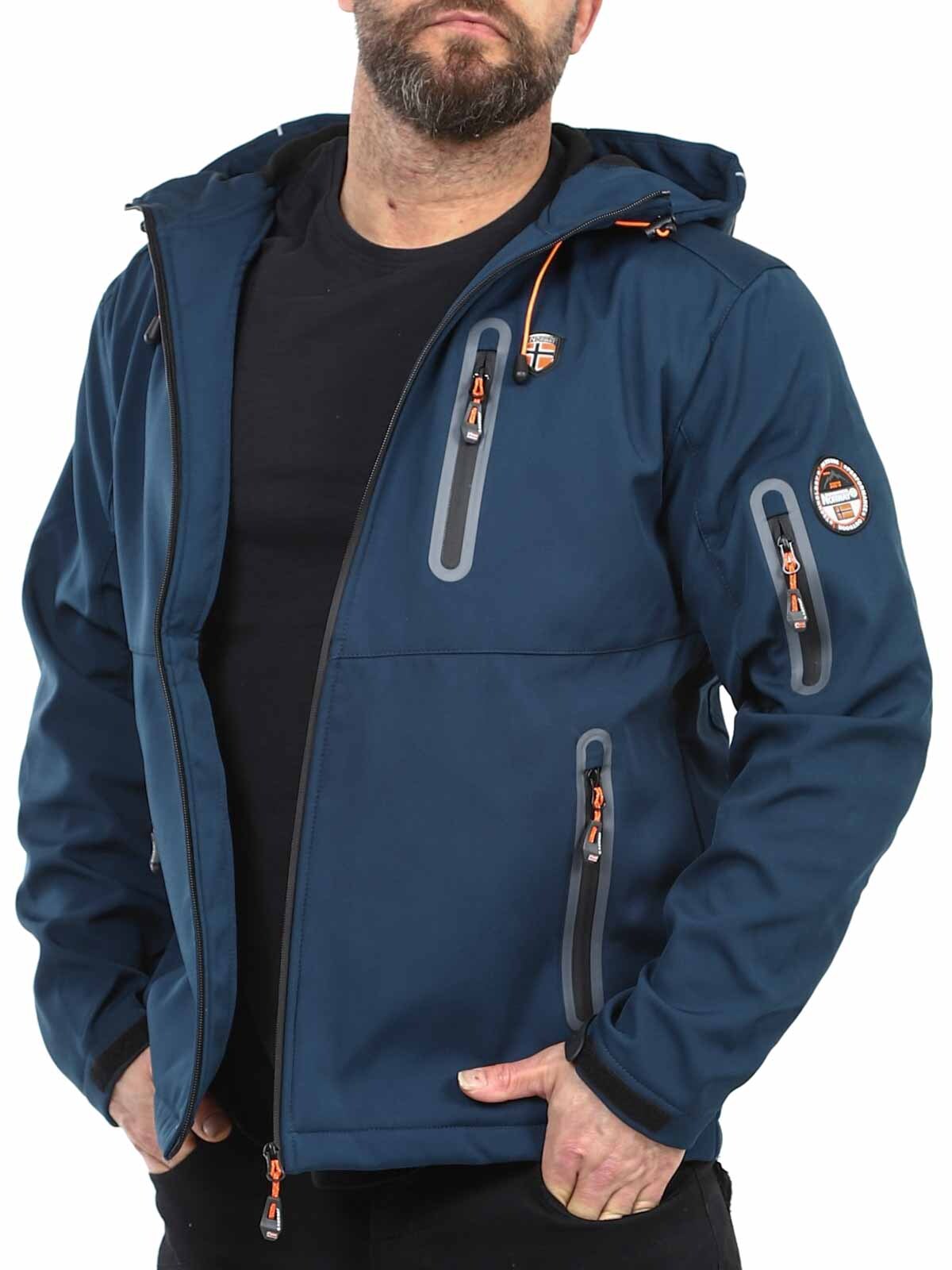 Functional softshell jacket with taped seams and weather and wind resistant properties. Adjustable hood and several closable pockets. Adjustable cuffs and hem.