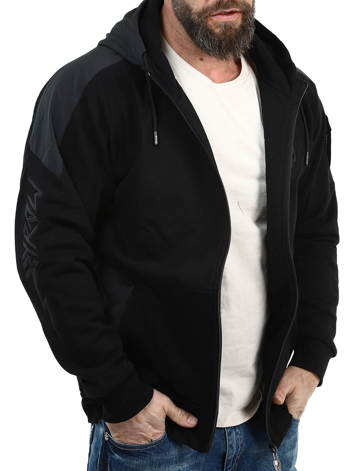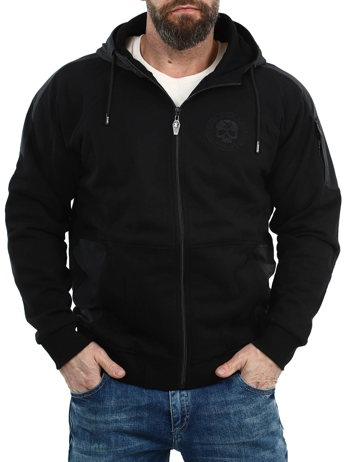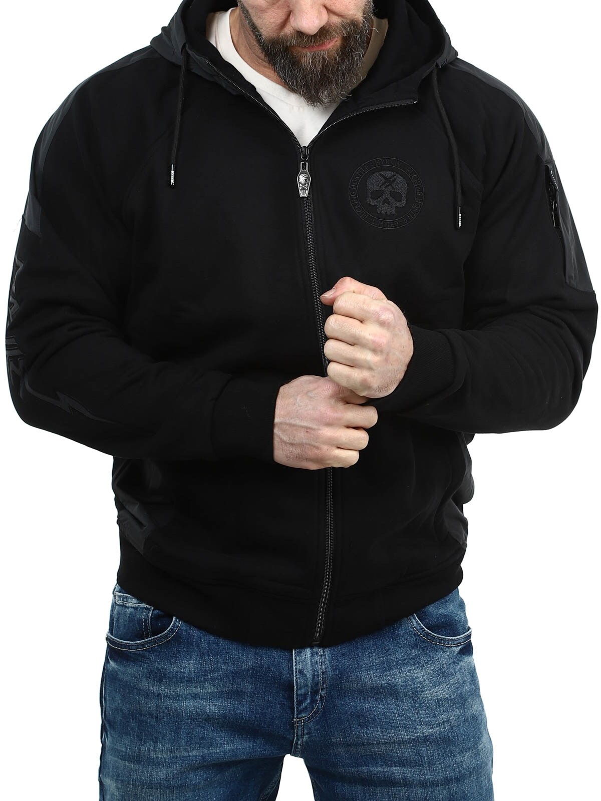 A powerful streetwear jacket that combines comfort, attitude and details in true rock style. The jacket is designed in a clean two-tone combination of black and dark grey, where contrasting panels on the hood, shoulders and sleeves give it a raw and urban look. On the back there is a large embroidered skull motif, while the chest features an embroidered logo. The sleeve also has Hyraw text in embroidery that enhances the jacket’s characteristic style. It features several practical zip pockets and ribbed cuffs at the sleeves and hem.