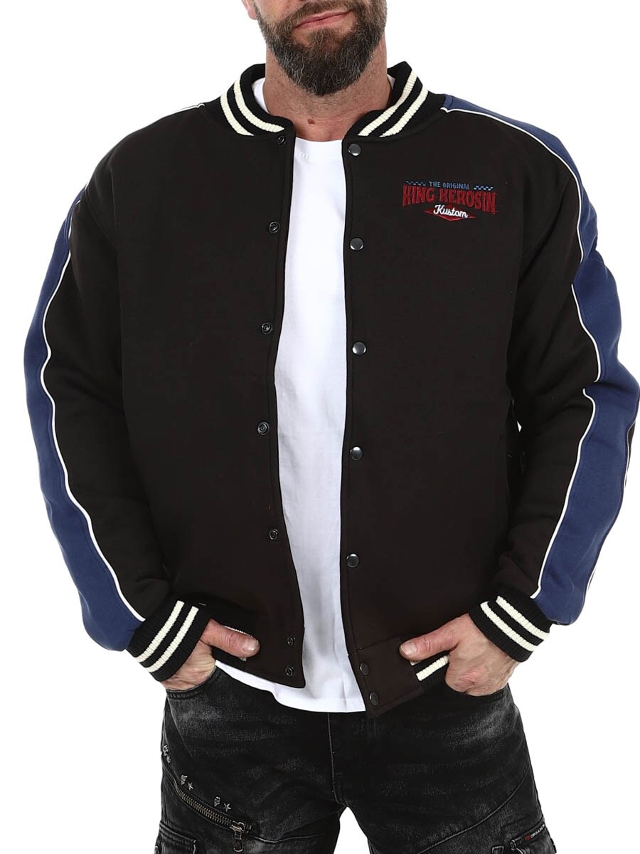 Black jacket designed with embroidered artwork on both the front and back. It features a collar, two open pockets, and ribbed finishes. On the inside, the jacket is lined with padded quilted lining that provides extra warmth and comfort, making it ideal even for cooler days.