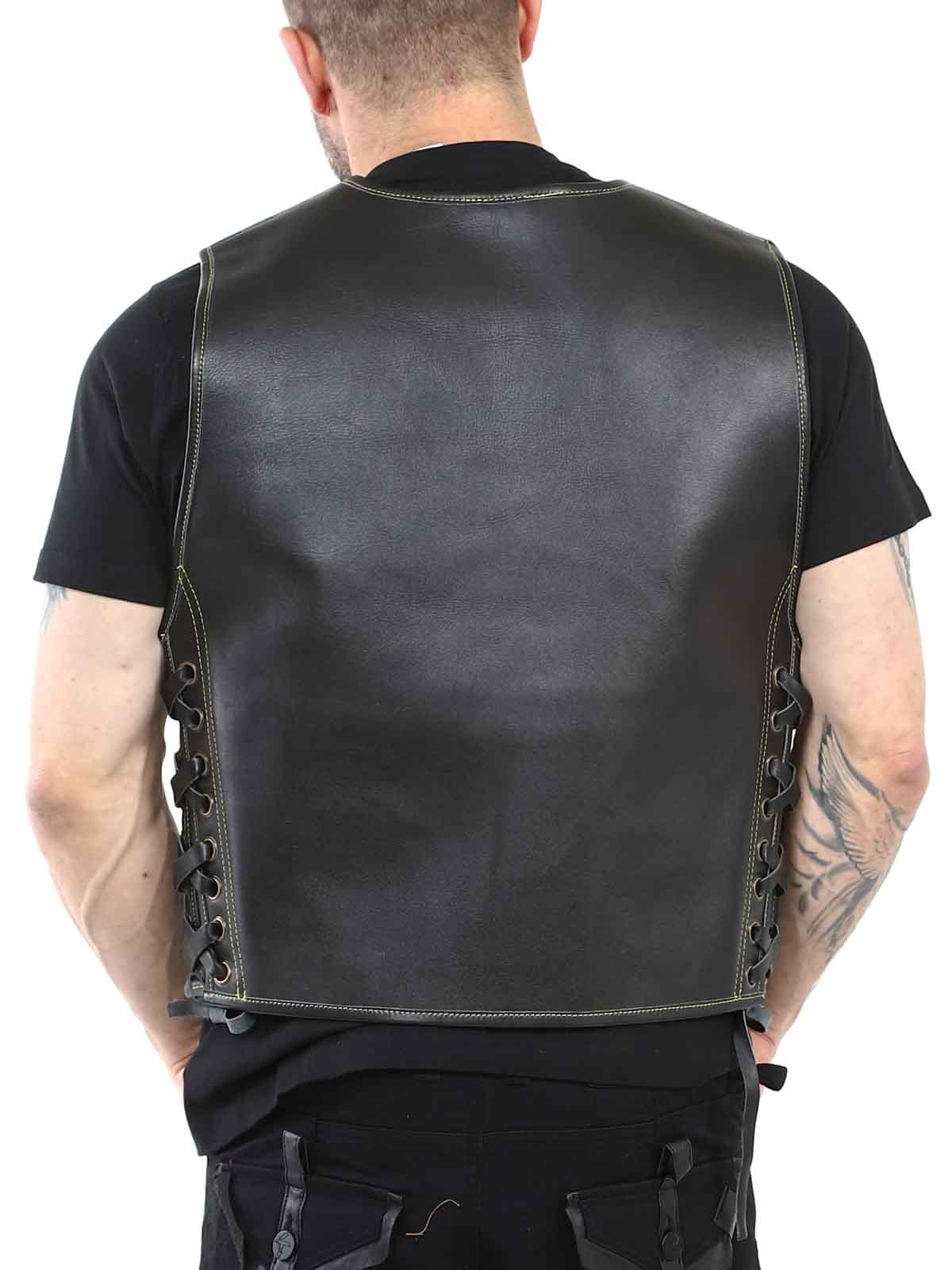 Robust buffalo leather vest with distinctive stitching. It has three front pockets and three inside pockets, all with zip closure for secure storage. Side ties for an adjustable fit and a stylish touch. With its durable construction and quality details, this vest is just as suitable for the road as it is for those who want to add a real statement piece to their wardrobe!