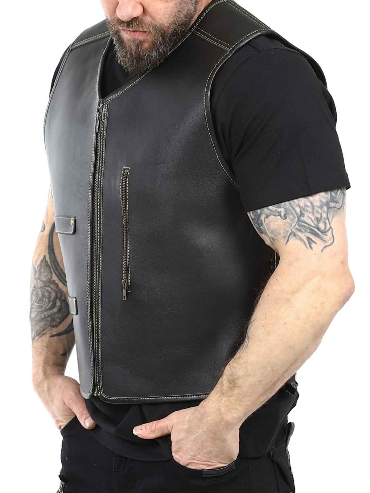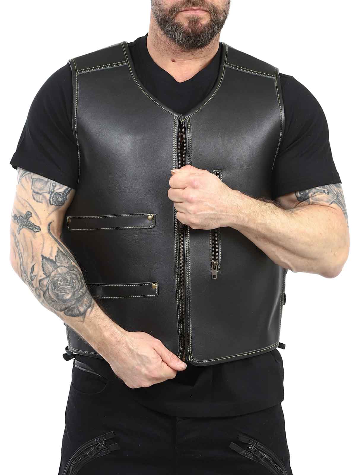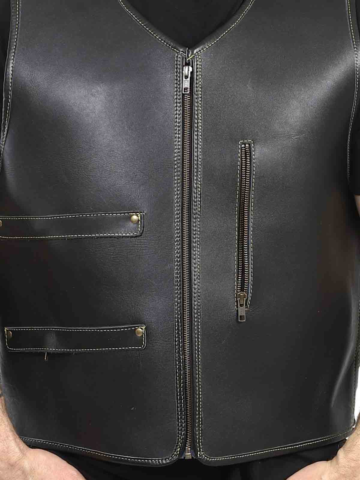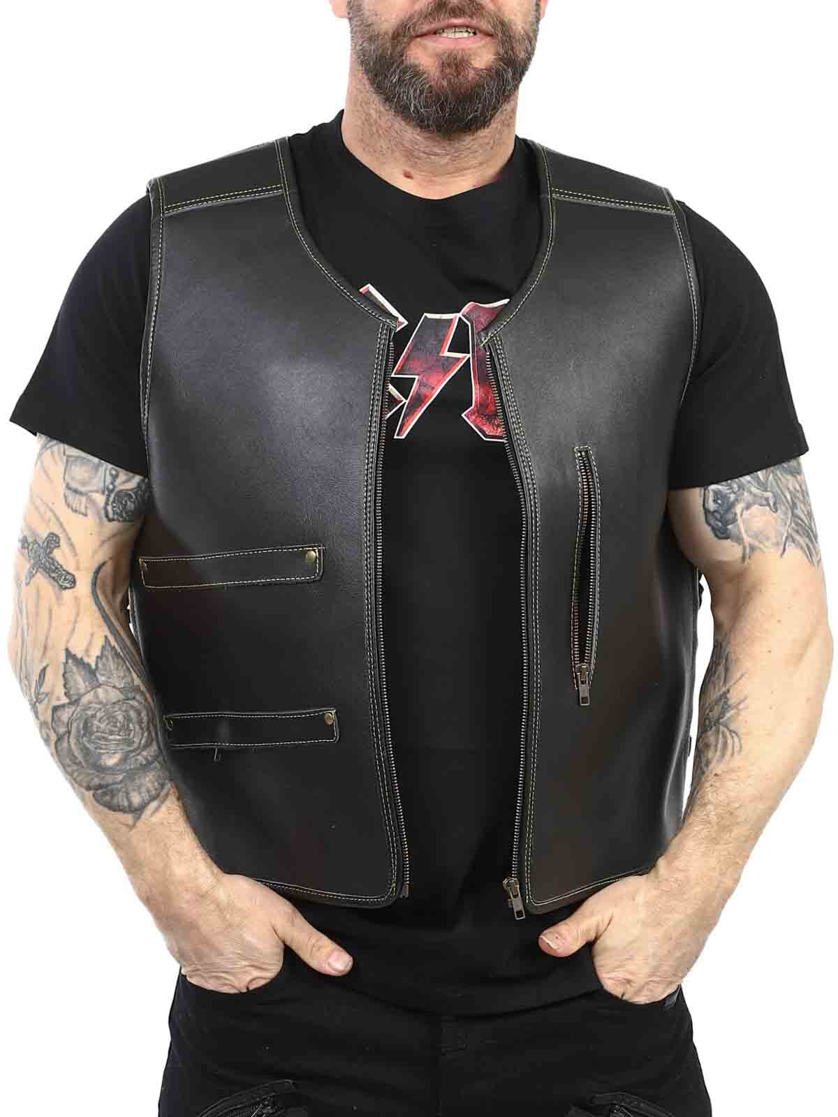 Robust buffalo leather vest with distinctive stitching. It has three front pockets and three inside pockets, all with zip closure for secure storage. Side ties for an adjustable fit and a stylish touch. With its durable construction and quality details, this vest is just as suitable for the road as it is for those who want to add a real statement piece to their wardrobe!