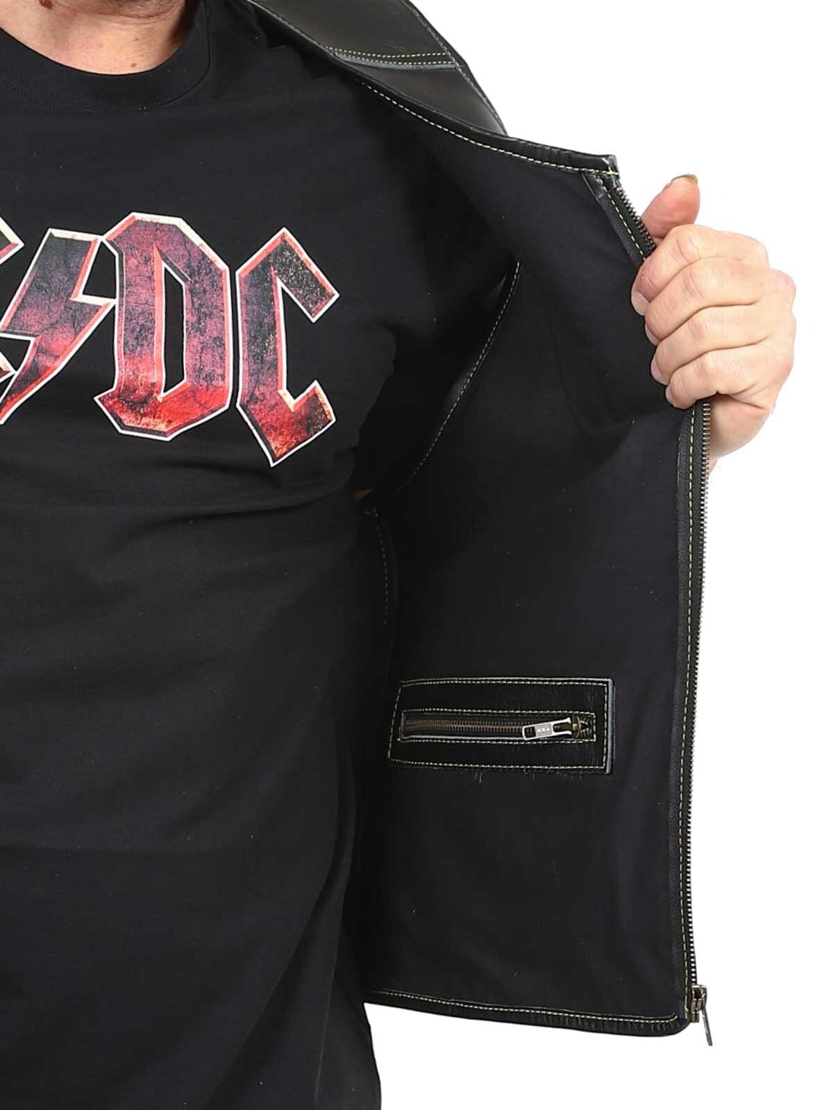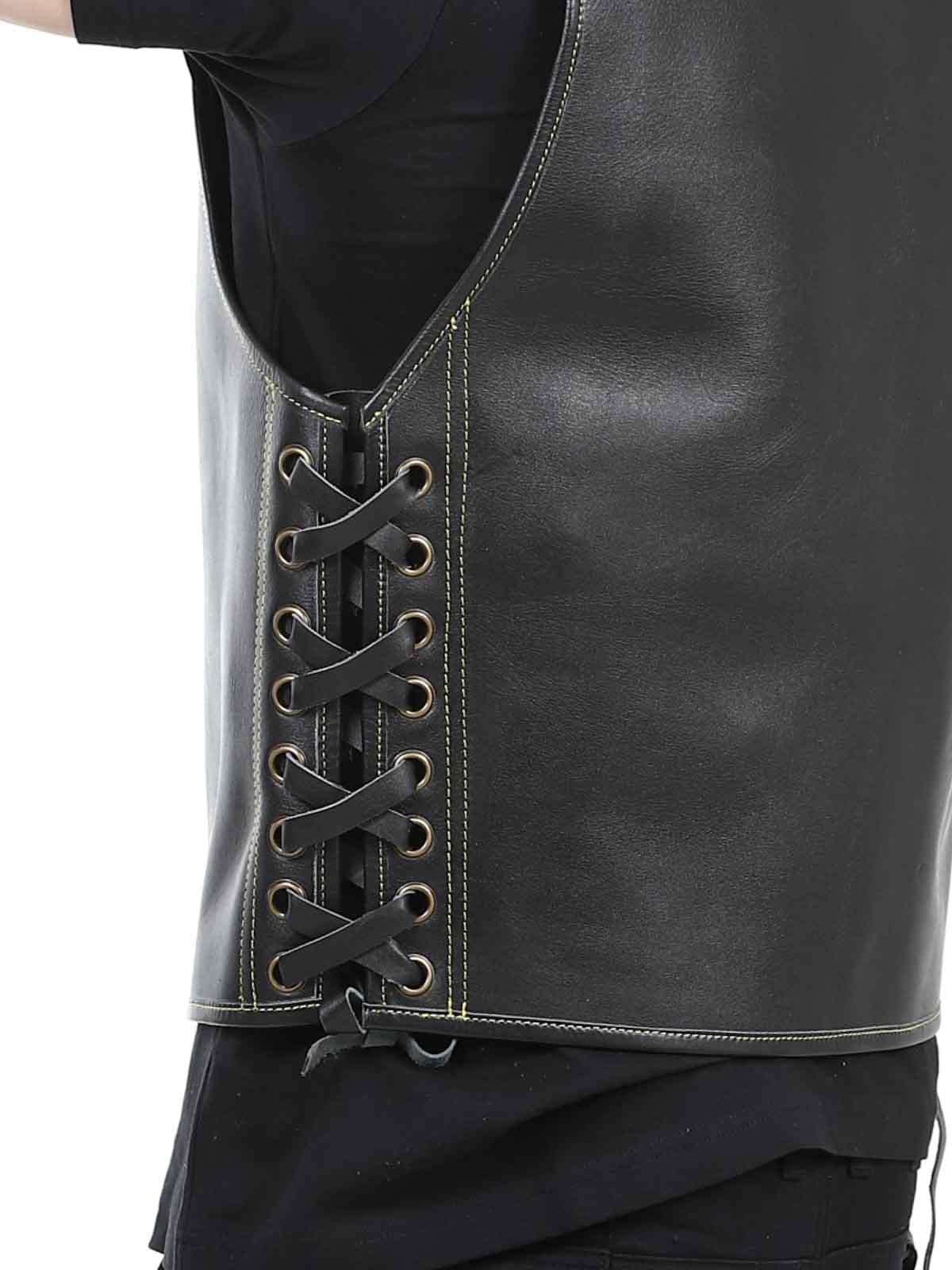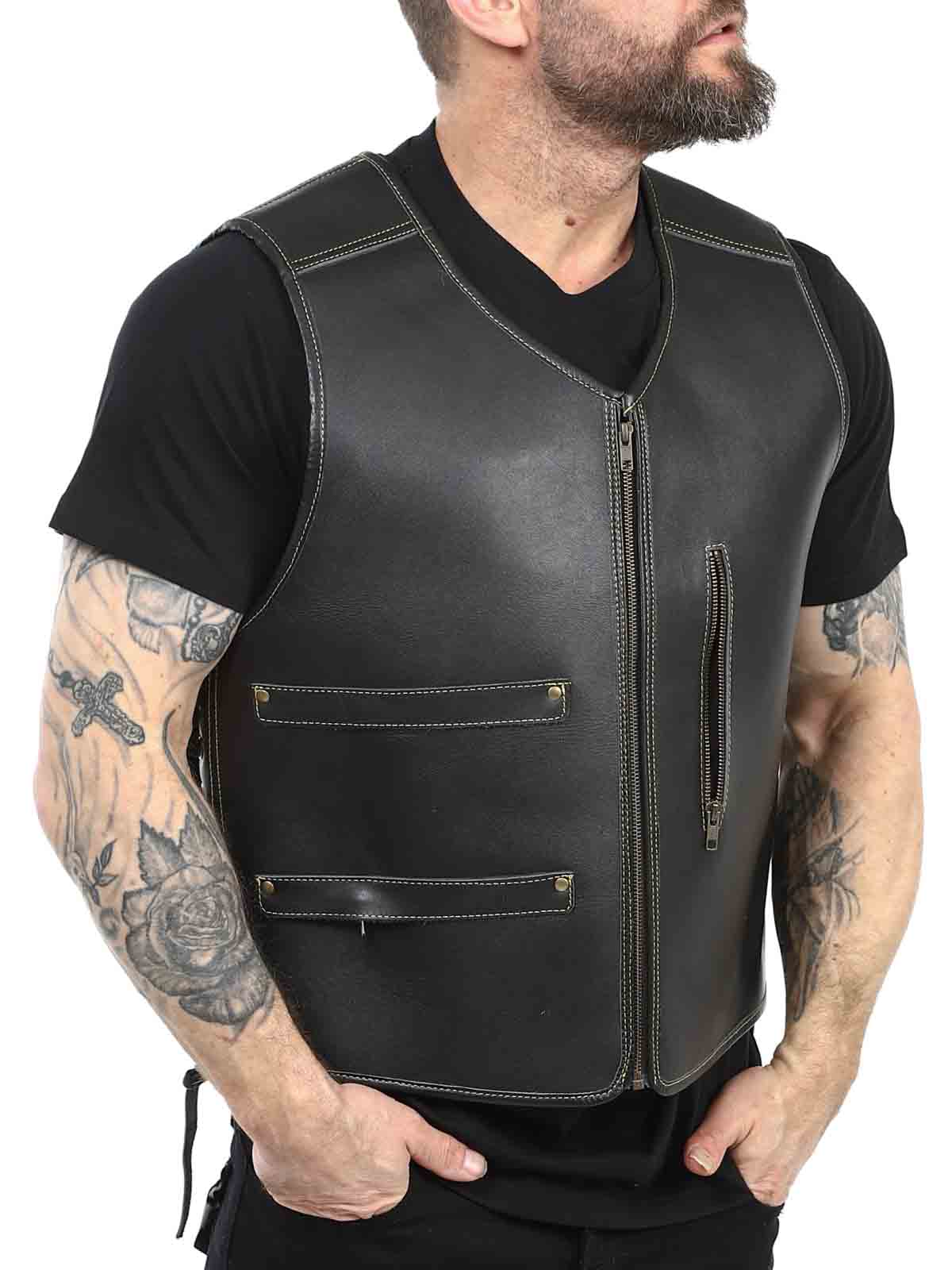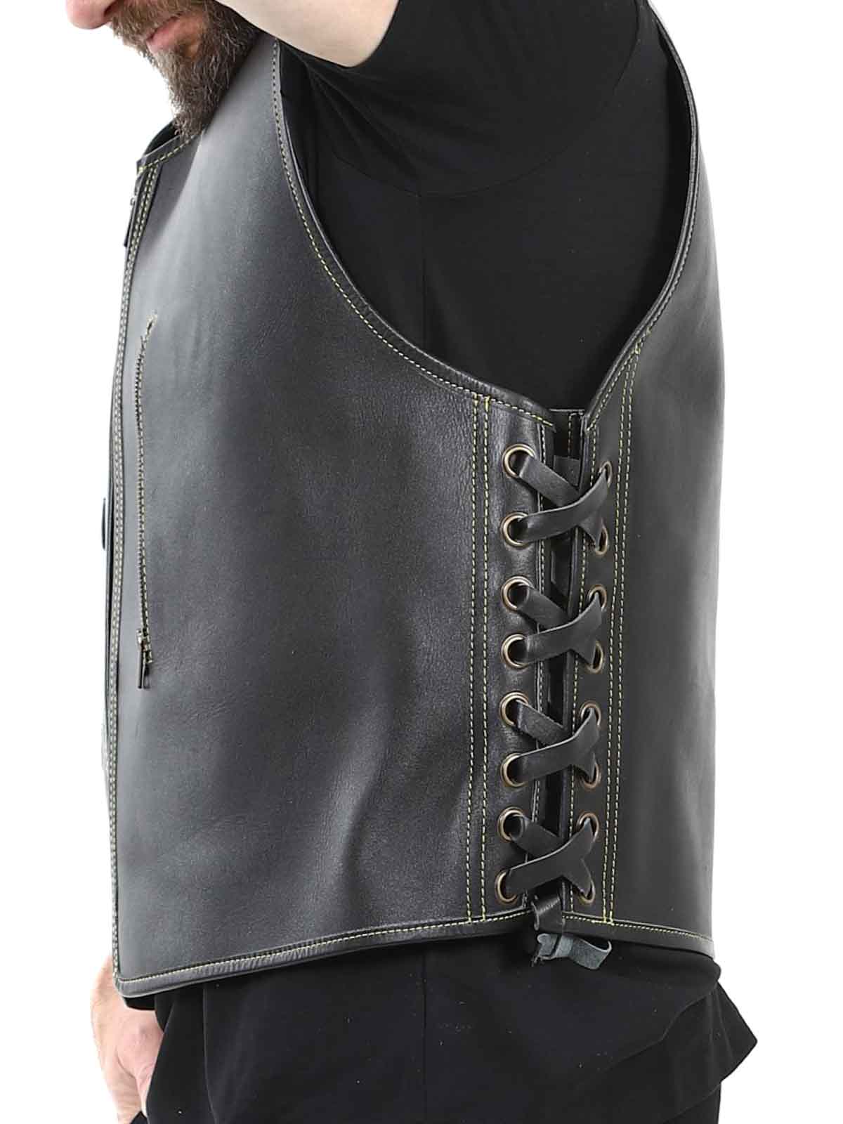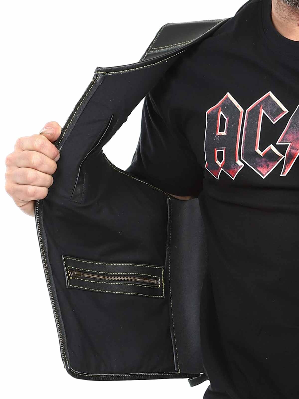 Robust buffalo leather vest with distinctive stitching. It has three front pockets and three inside pockets, all with zip closure for secure storage. Side ties for an adjustable fit and a stylish touch. With its durable construction and quality details, this vest is just as suitable for the road as it is for those who want to add a real statement piece to their wardrobe!