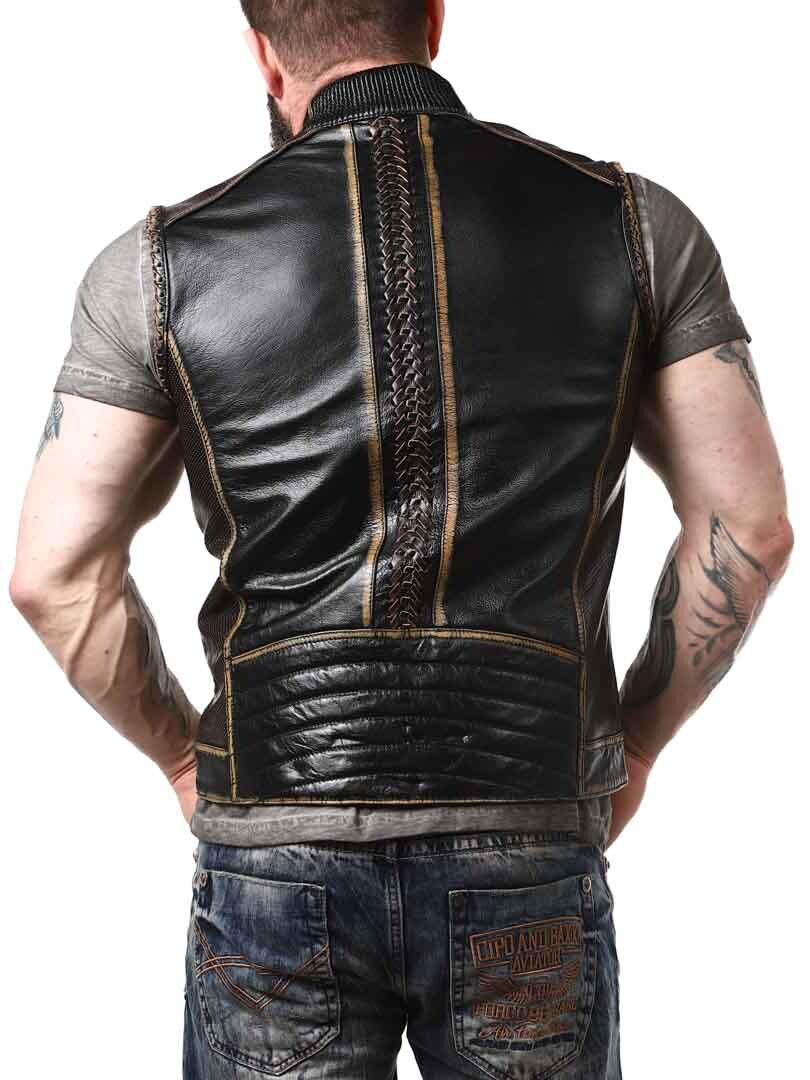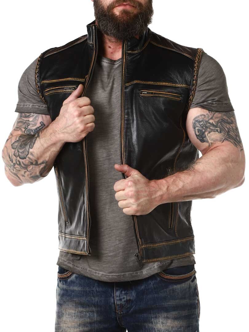 Vest made of genuine leather with lighter sections and braided leather decoration, giving it a stylish vintage look. It features four front zip pockets and two inner pockets. The vest closes with a sturdy zipper and is designed with a collar and padded back section. Available exclusively at RockDenim!