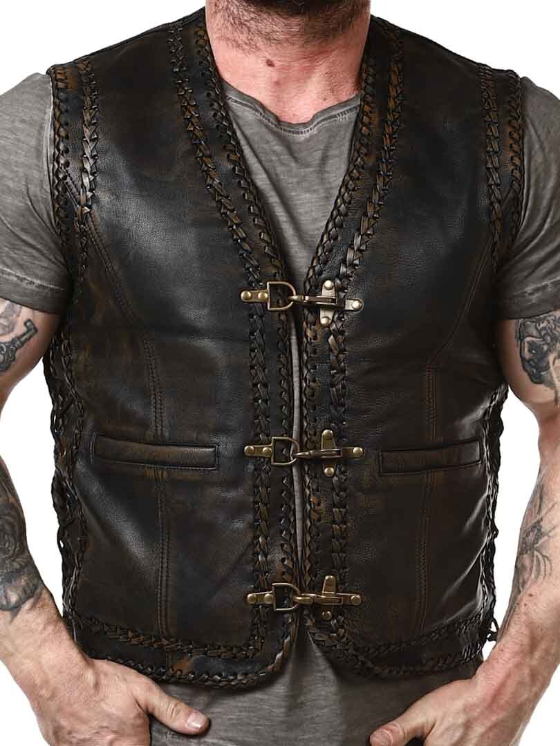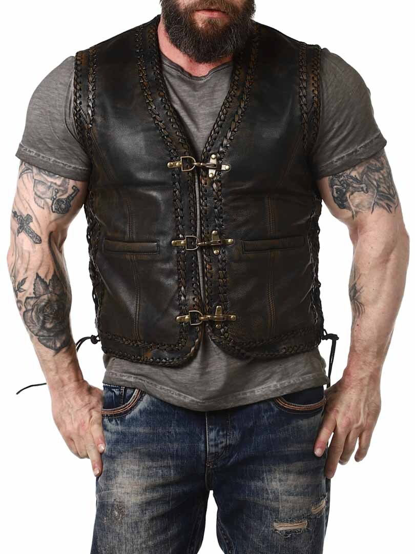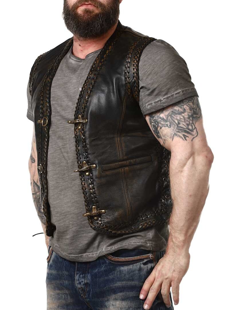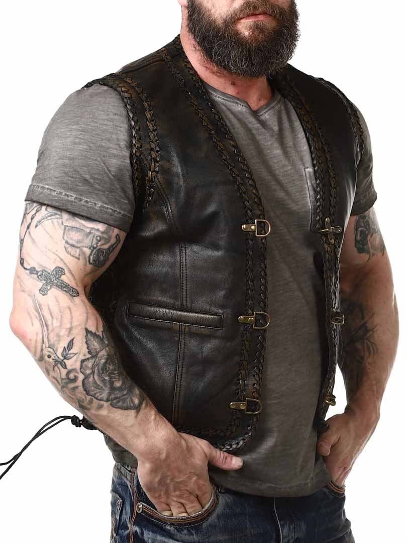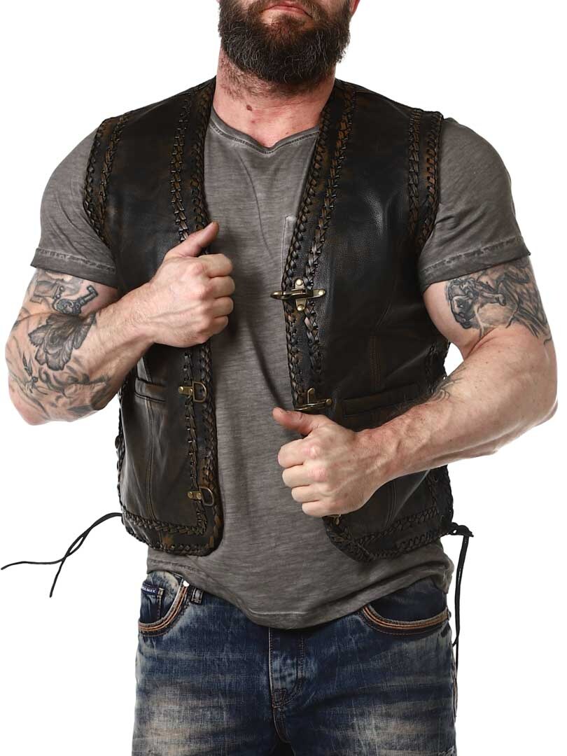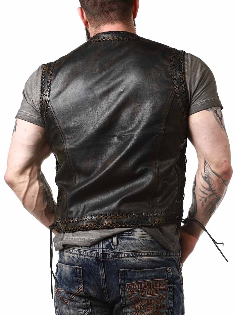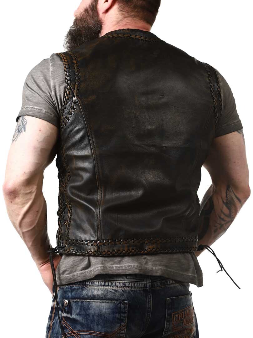 Vest in genuine leather with a stylish vintage look and braided leather decoration. It features two front pockets, two inner pockets, and side lacing. The vest closes with sturdy metal buckles. Available exclusively at RockDenim!