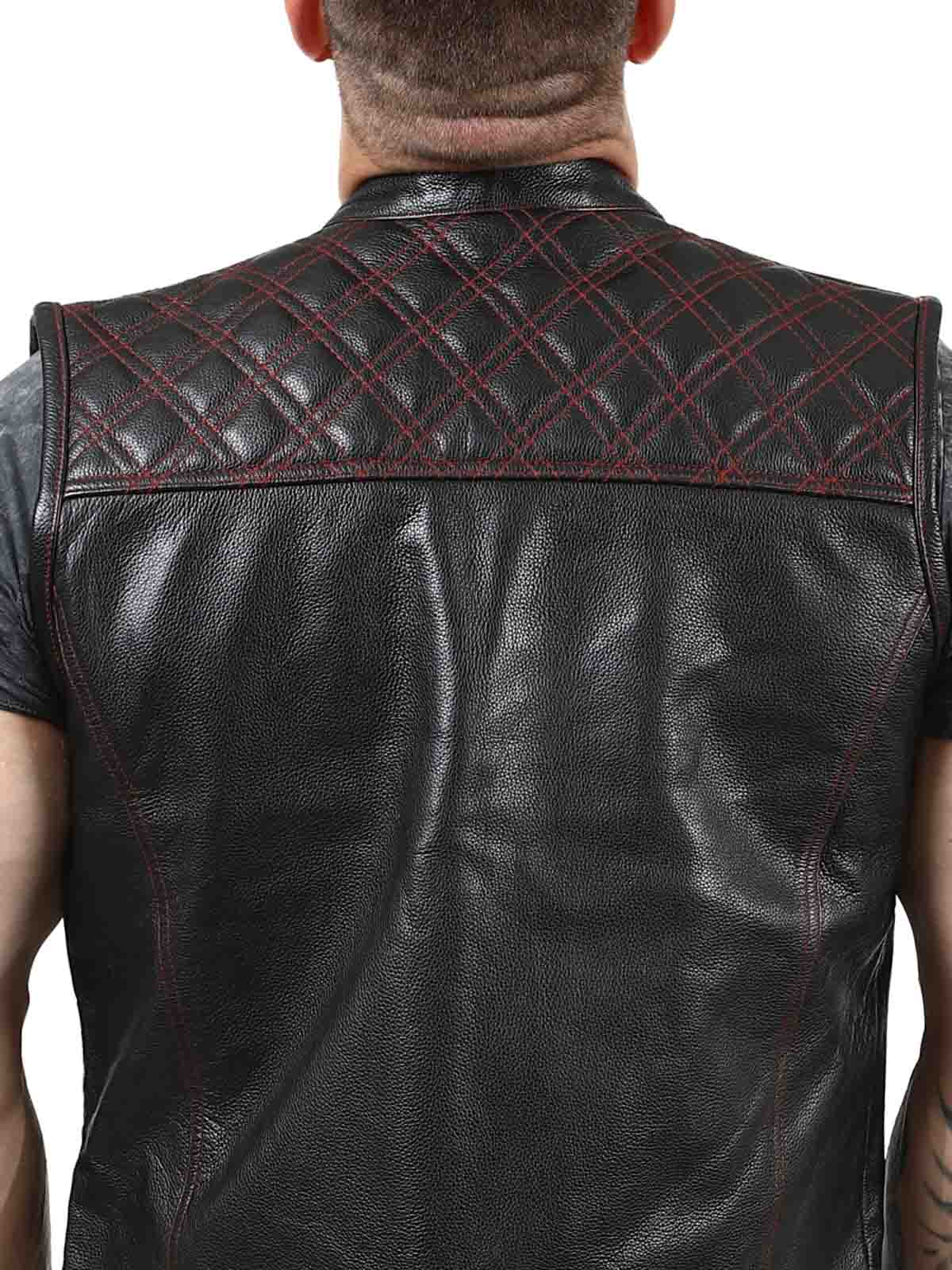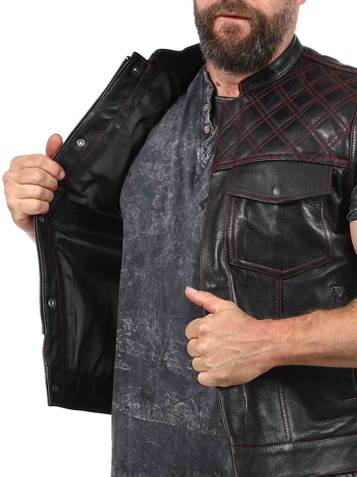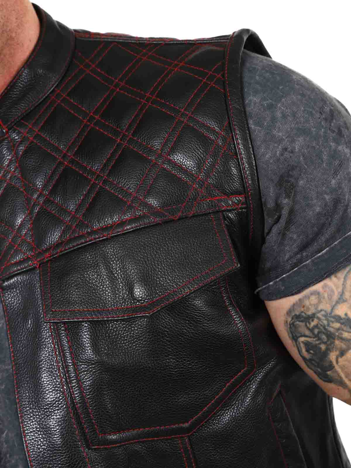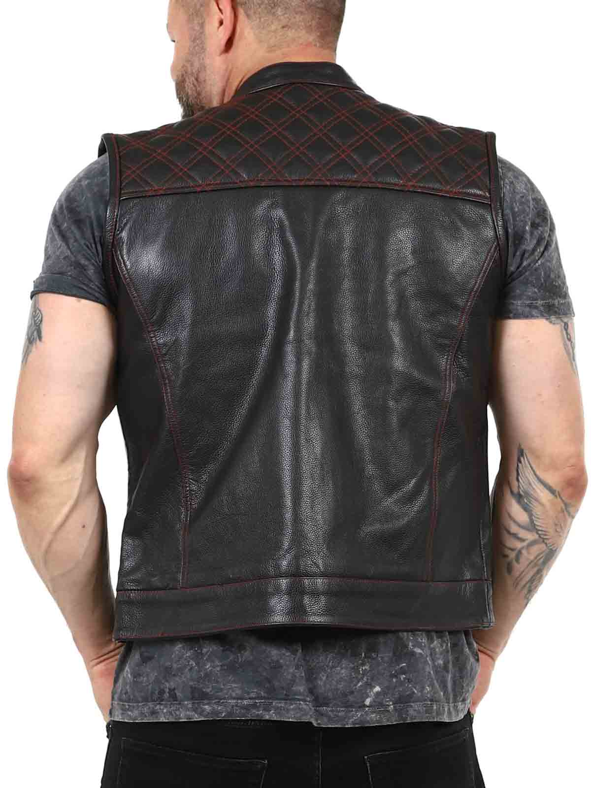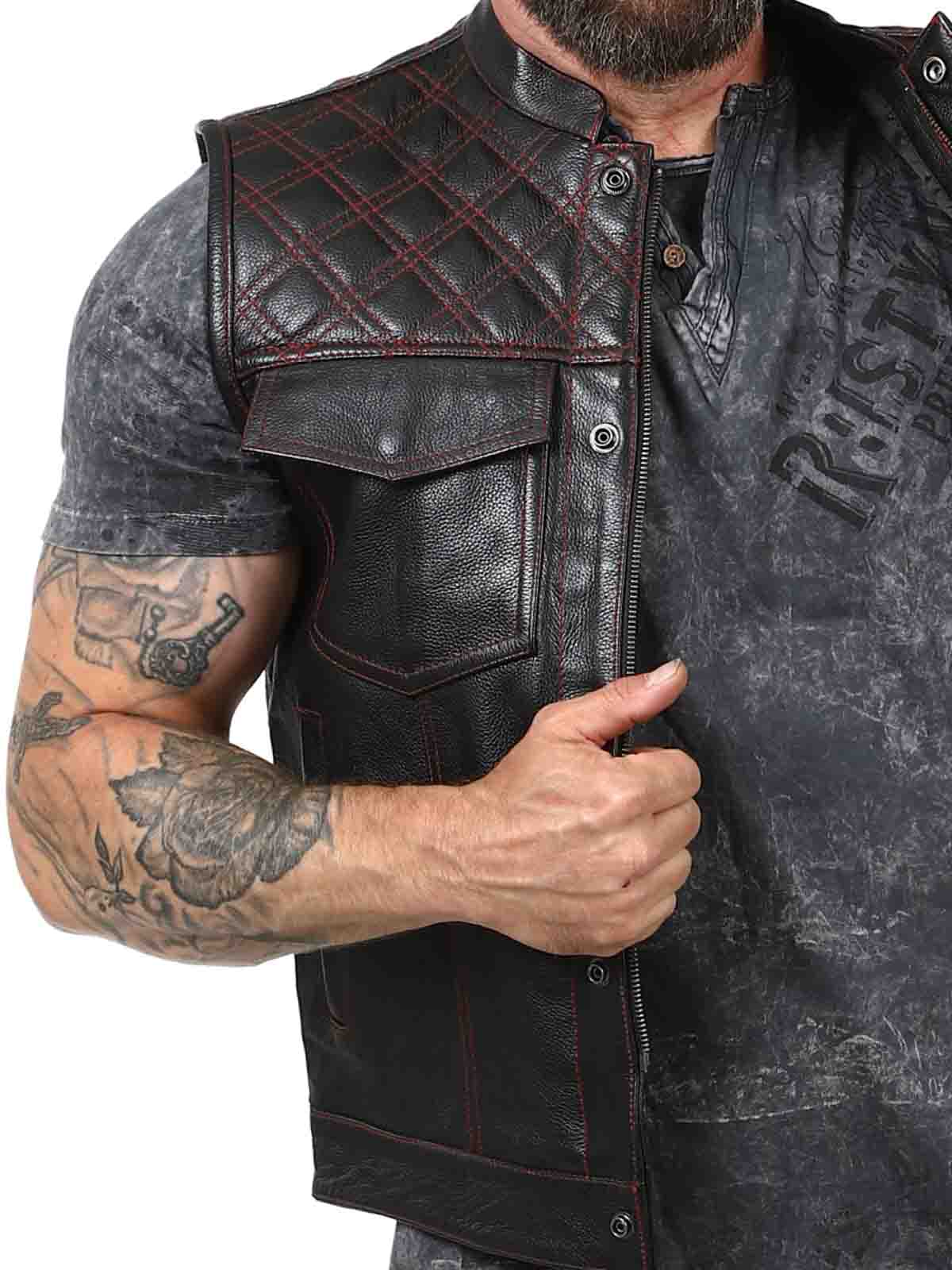 Sturdy leather vest in genuine leather with a low collar. There are two closable chest pockets, two open pockets on the stomach and two open inner pockets. The vest closes with both a zip and buttons. This vest can only be found at Rockdenim!