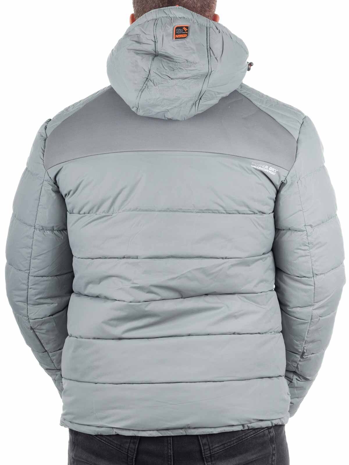Insulated jacket that is wind- and water-resistant. It has four front pockets with zippers, and two open inner pockets. Drawstrings in the hood and at the bottom.