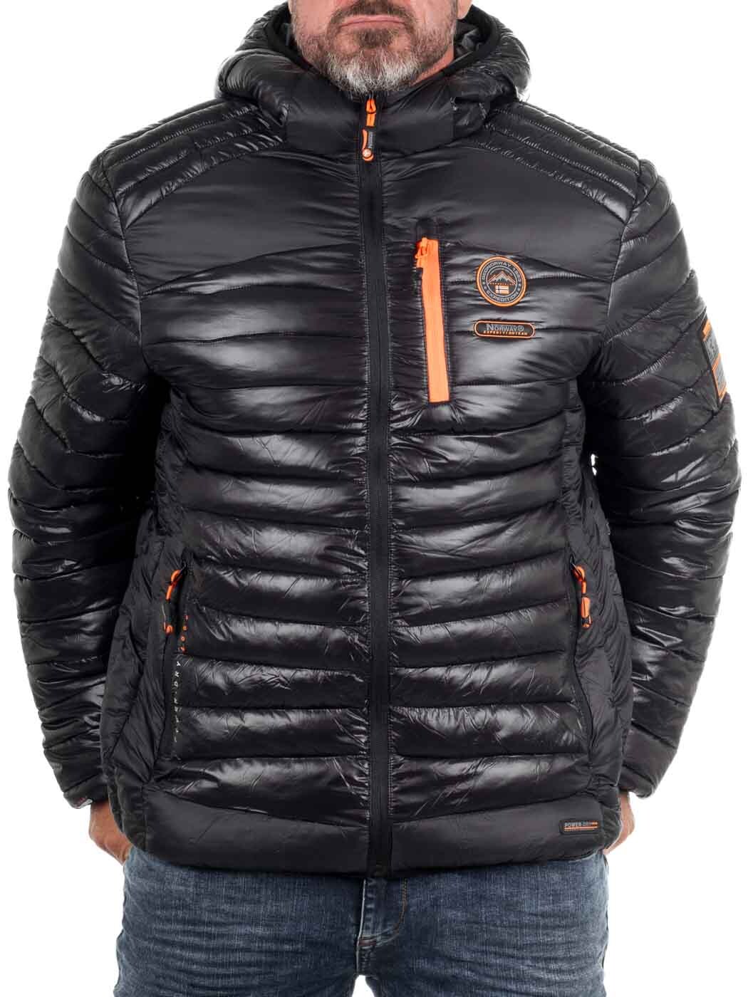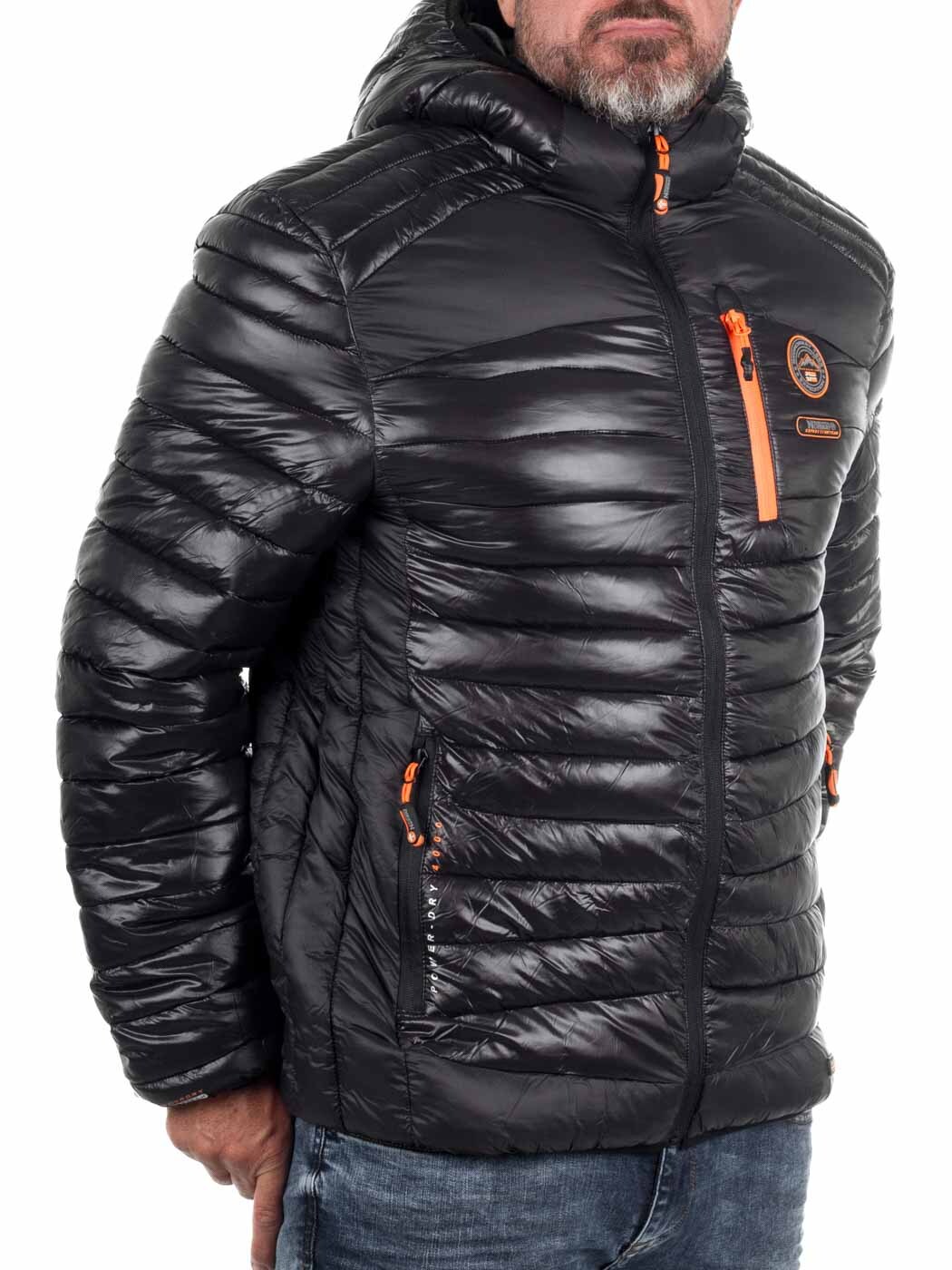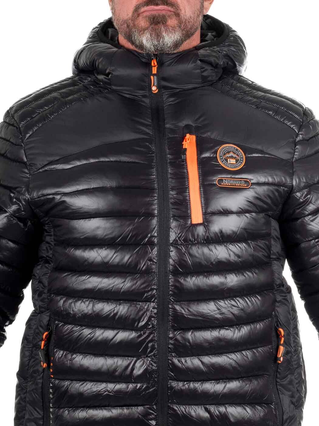 Stylish lightweight jacket with a glossy finish and contrasting orange details. Lightly padded for effective warmth without feeling heavy. Designed with multiple practical pockets, a hood, and subtle logo patches for a modern look. Perfect for transitional seasons or as an insulating layer on colder days.