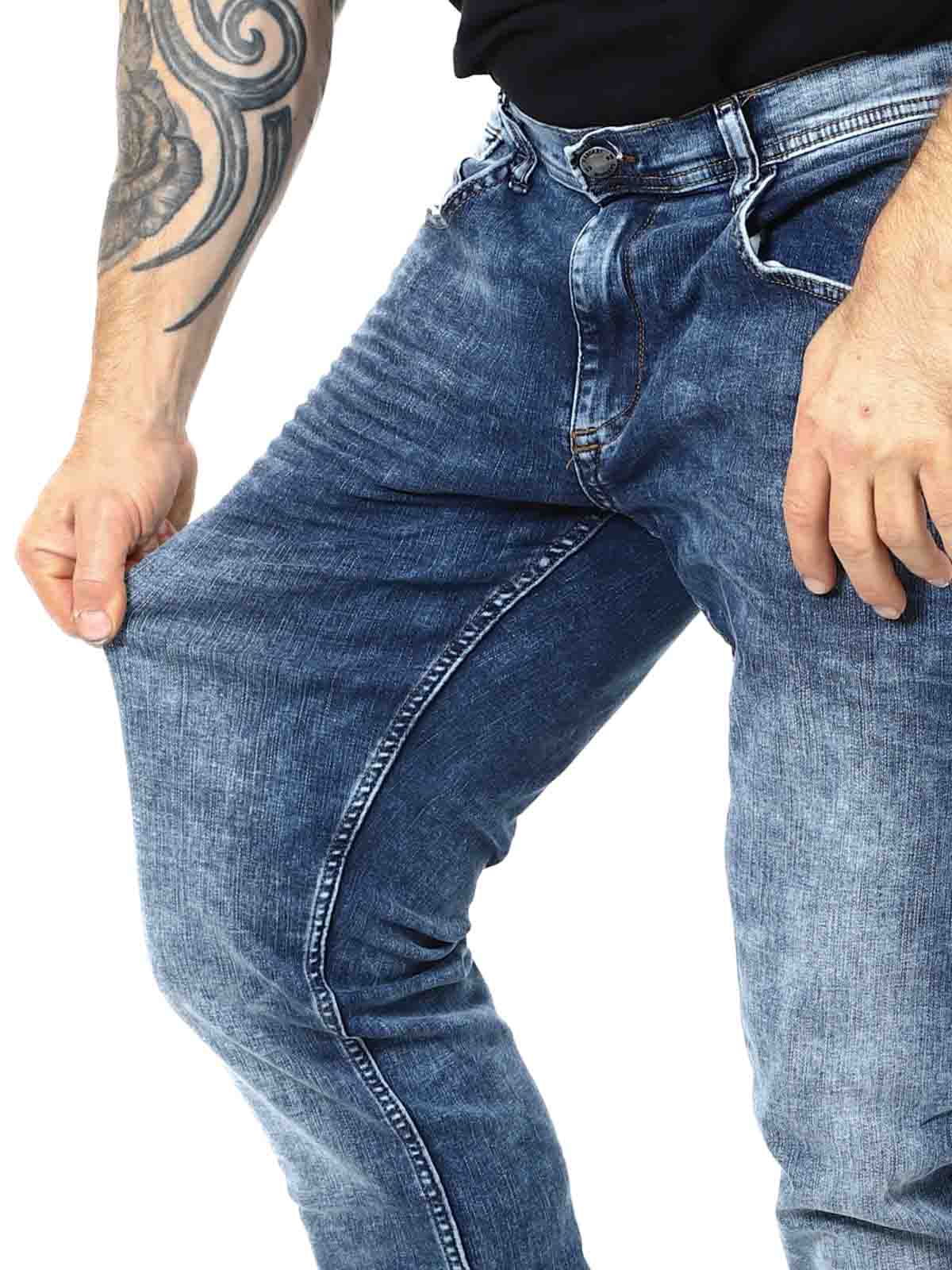 Blue jeans with Multiflex technology for extra stretch and comfort. They have a regular waist and tapered legs. Three front pockets, two back pockets, and belt loops.