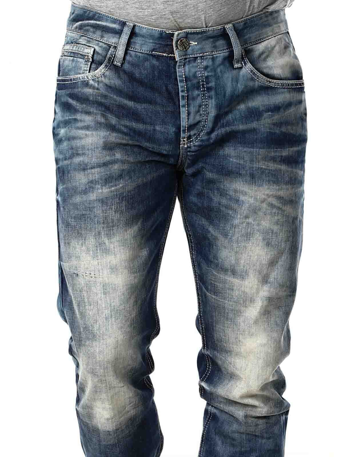 Blue jeans with a stonewashed design. They feature belt loops at the waist, five pockets, and an extra small pocket with a button on one of the back pockets. Detailed with contrast stitching.
